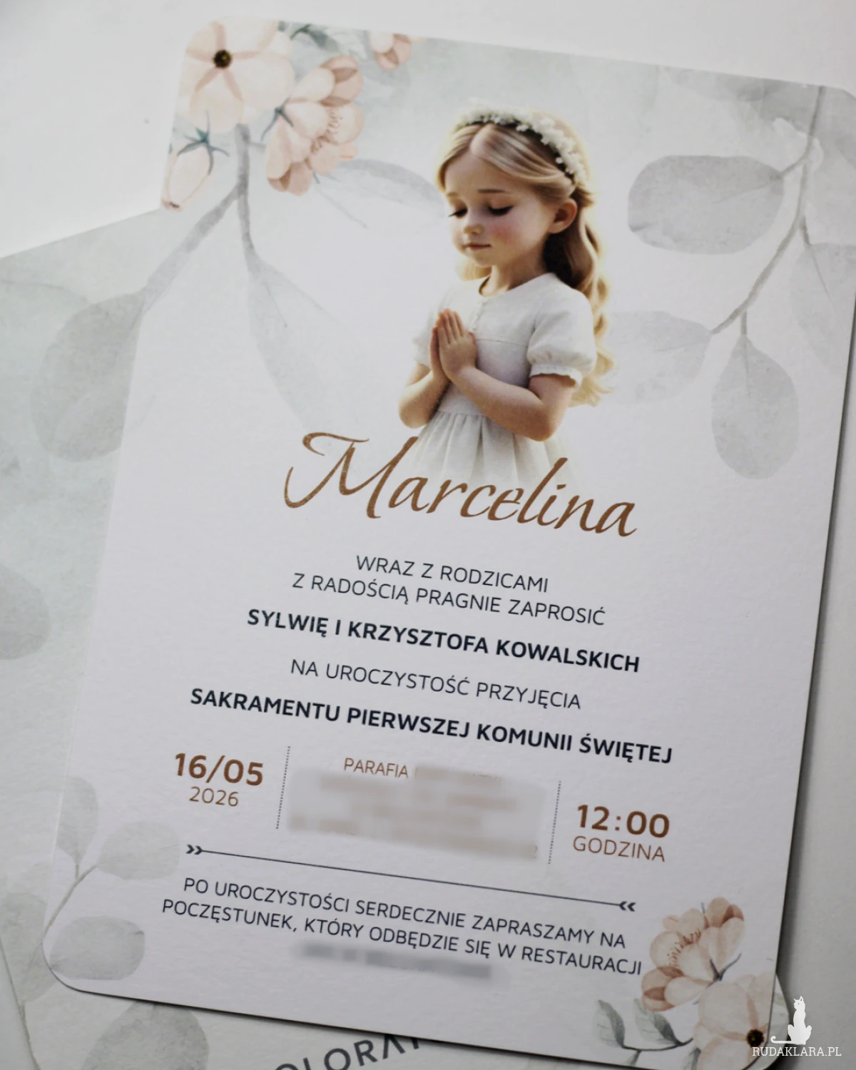 Format zaproszenia 12x17cm. Wydruk dwustronny na papierze ozdobnym o gramaturze 250g o delikatnej fakturze.
