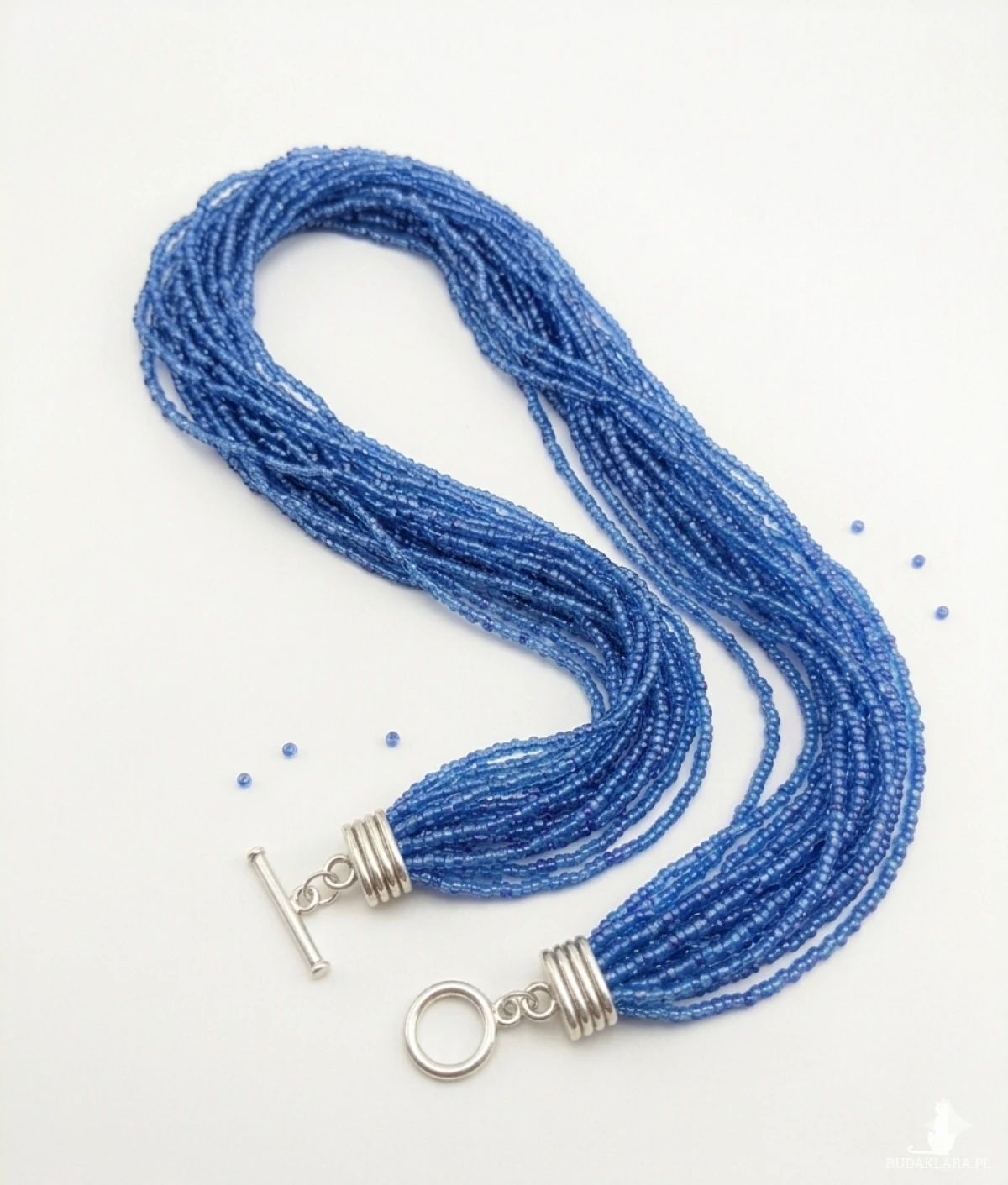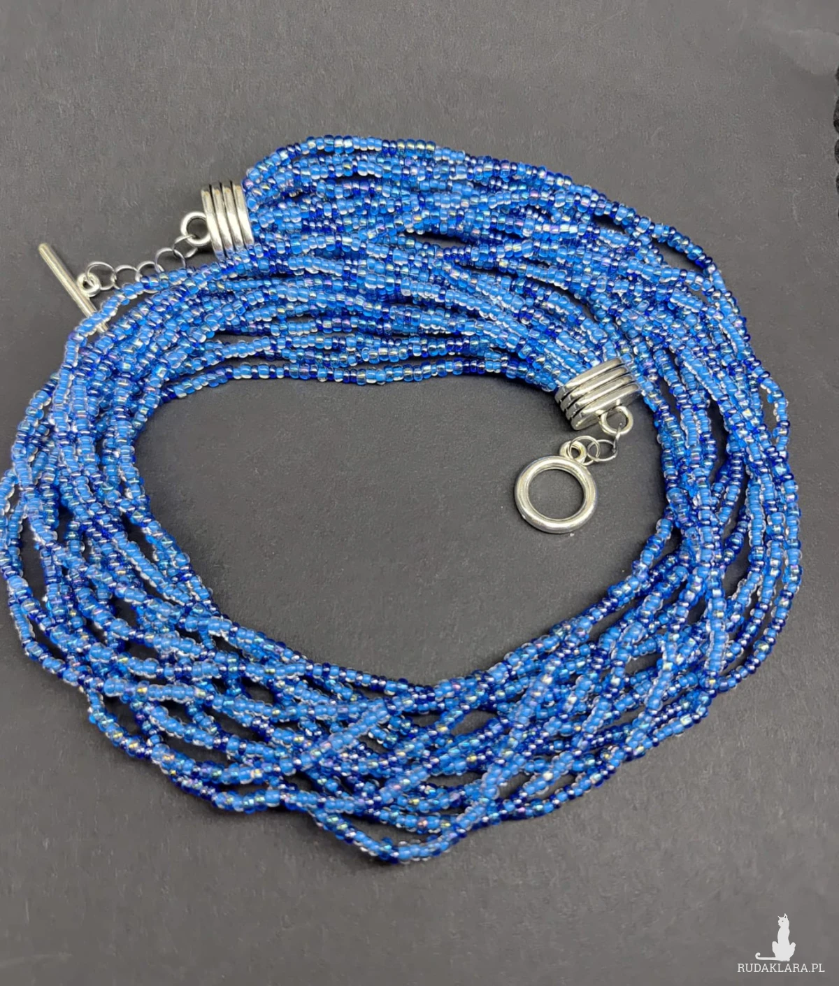 drobnych, szklanych koralików w różnych odcieniach błękitu i szafiru,