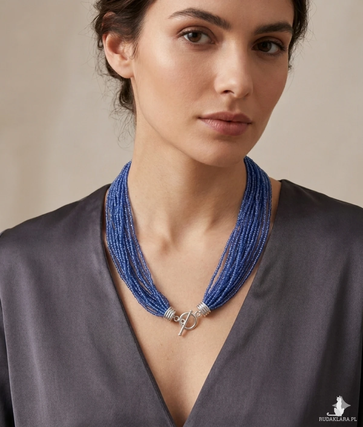 Wielowarstwowe sznury koralików pięknie układają się na dekolcie, dodając stylizacji objętości i blasku.