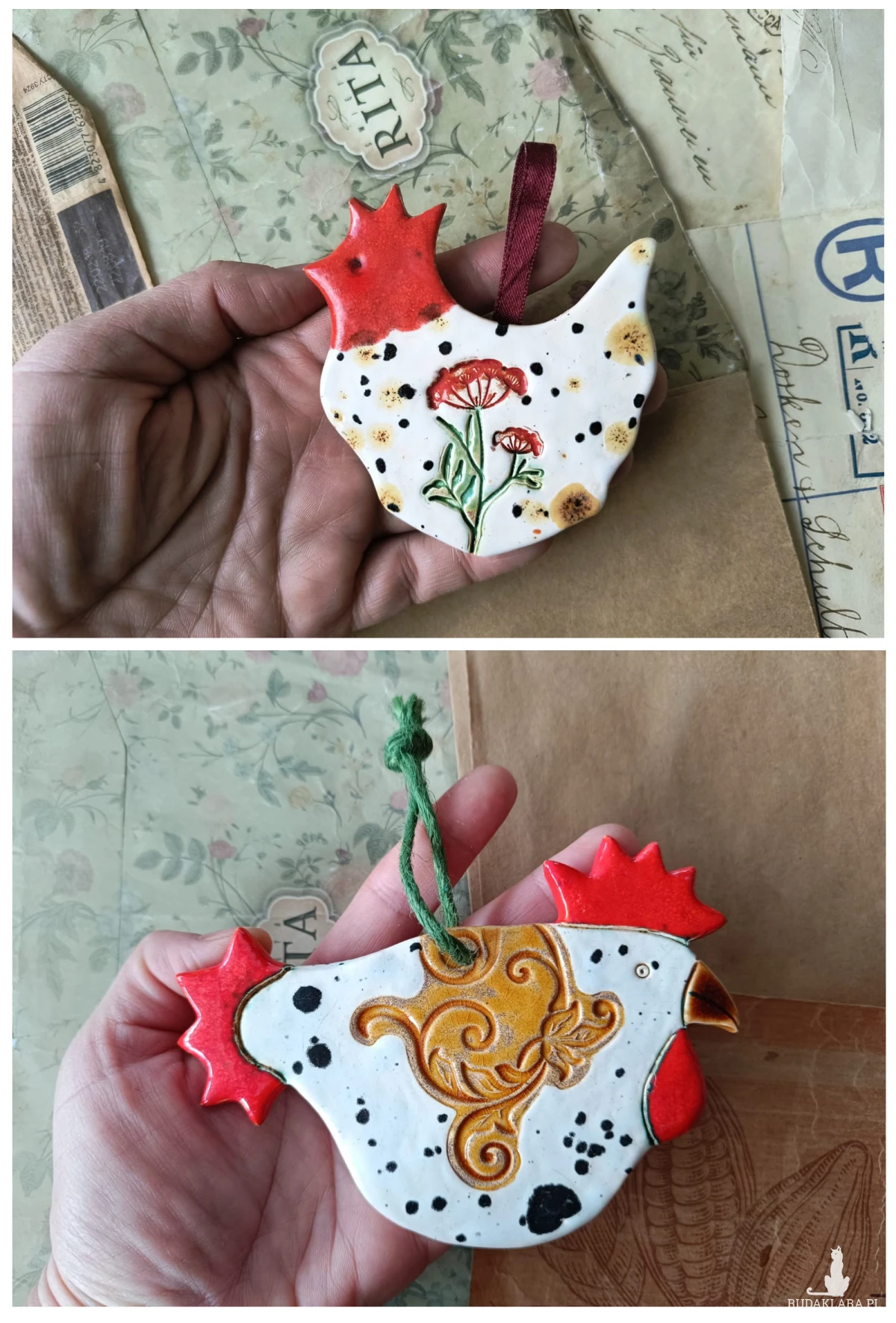 Kogut i kurka nakrapiane zawieszki, wykonane z gliny szamotowej, wypalone na biskwit, a następnie szkliwione w temp ok 1260 stopni C. Wymiary koguta ok 13 cm x 9 cm, wymiary kurki ok 7 x 7 cm. Polecam serdecznie do ozdoby kuchni lub jako upominek wielkanocny.