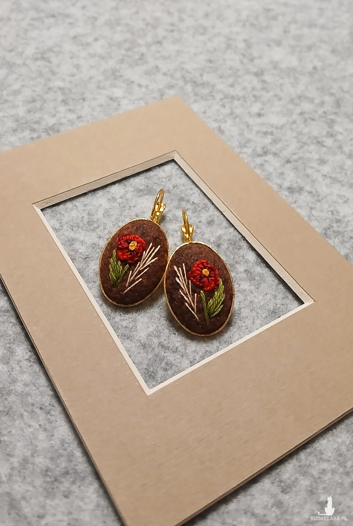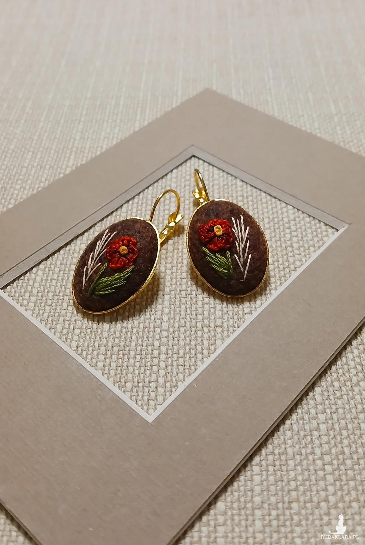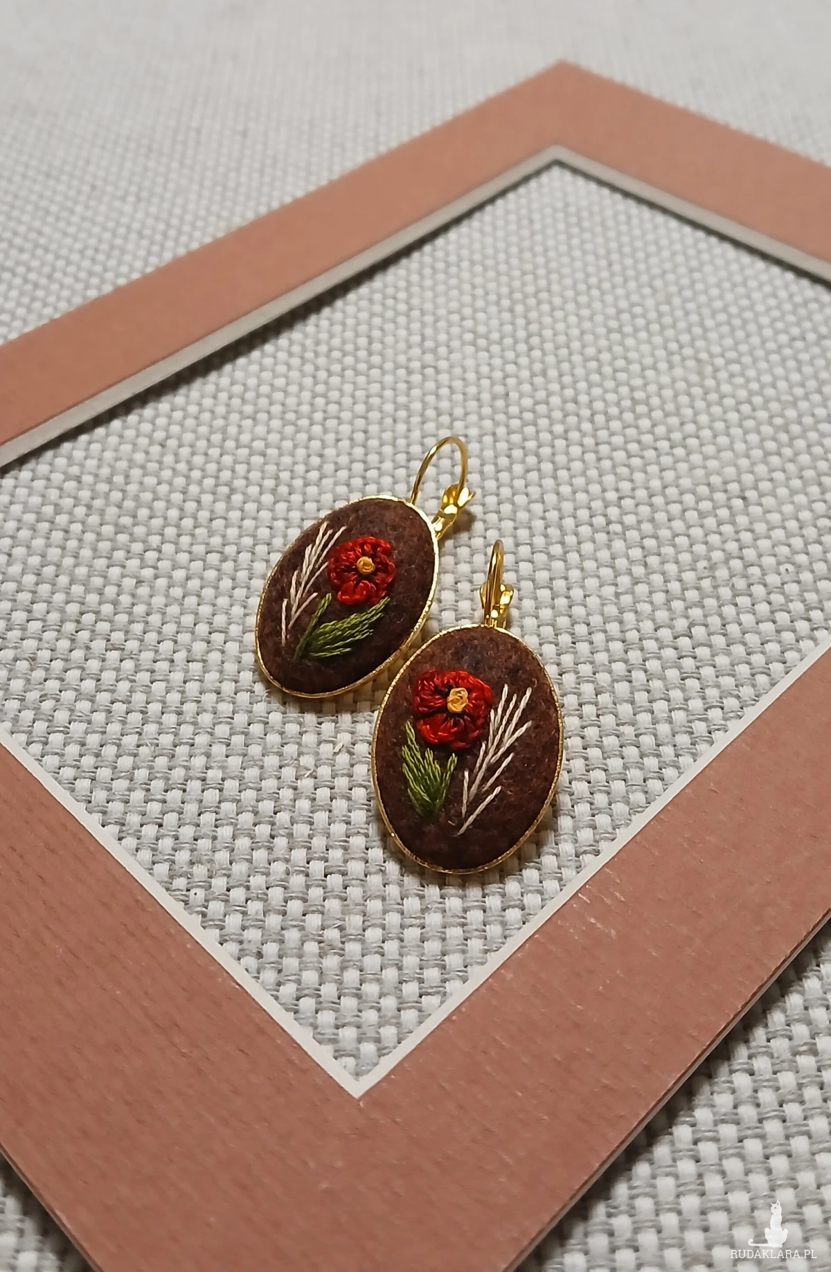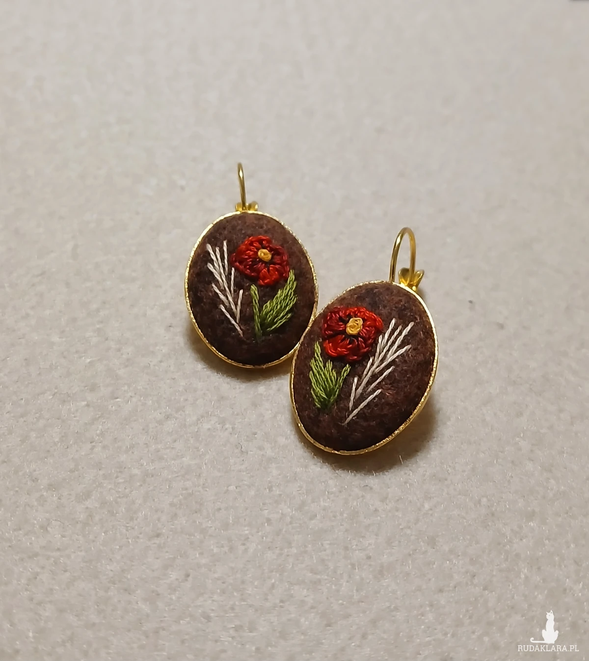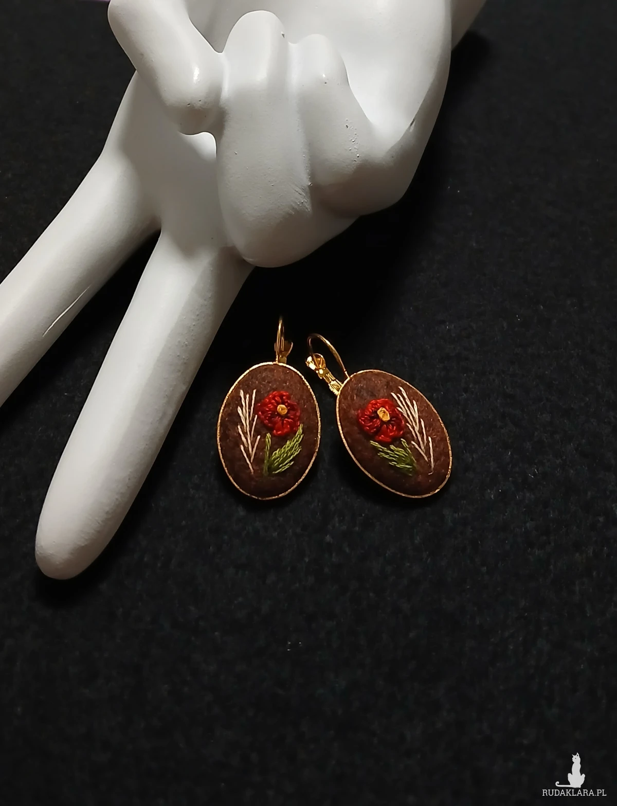 Biżuteria nie musi być duża, żeby była zauważona. Czerwony mak na bordowobrązowym tle oprawiony w złotą bazę to kolczyki, które w ciekawy sposób podkreślą Twoją fryzurę i makijaż dodając charakteru.