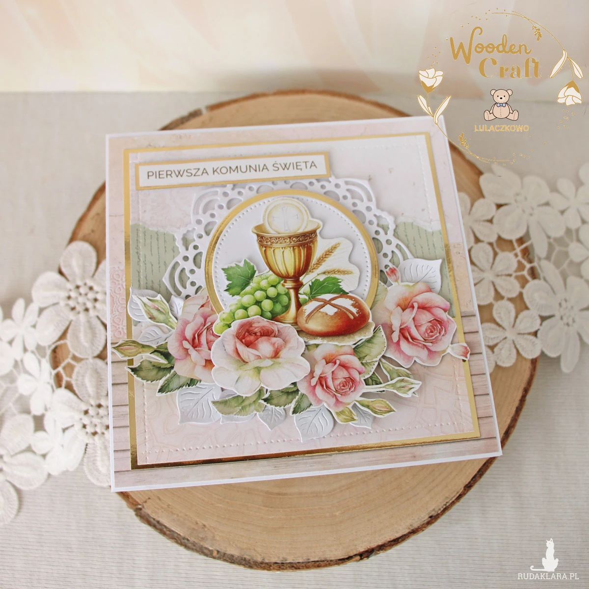 Piękna, elegancka kartka komunijna, pamiątka Pierwszej Komunii Świętej, wykonana ręcznie z najwyższą starannością, z cudownej kolekcji papierów "Rose Wine", utrzymana w pastelowych odcieniach malinowego różu, kremu i bieli, z dodatkiem złotych, błyszczących akcentów. Na środku kartki umieszona została grafika kielicha komunijnego z winogronami oraz chlebem otoczona kompozycją kwiatową z grafik przedstawiających róże oraz napisem "Pierwsza Komunia Święta"- do napisu mogę również dodać imię dziecka.