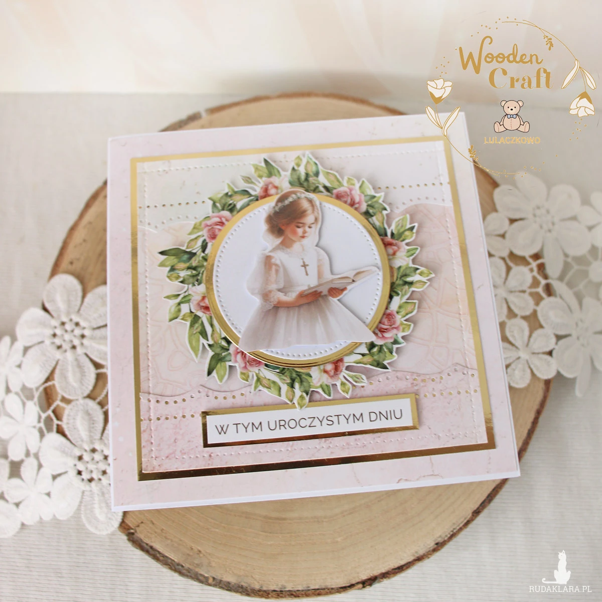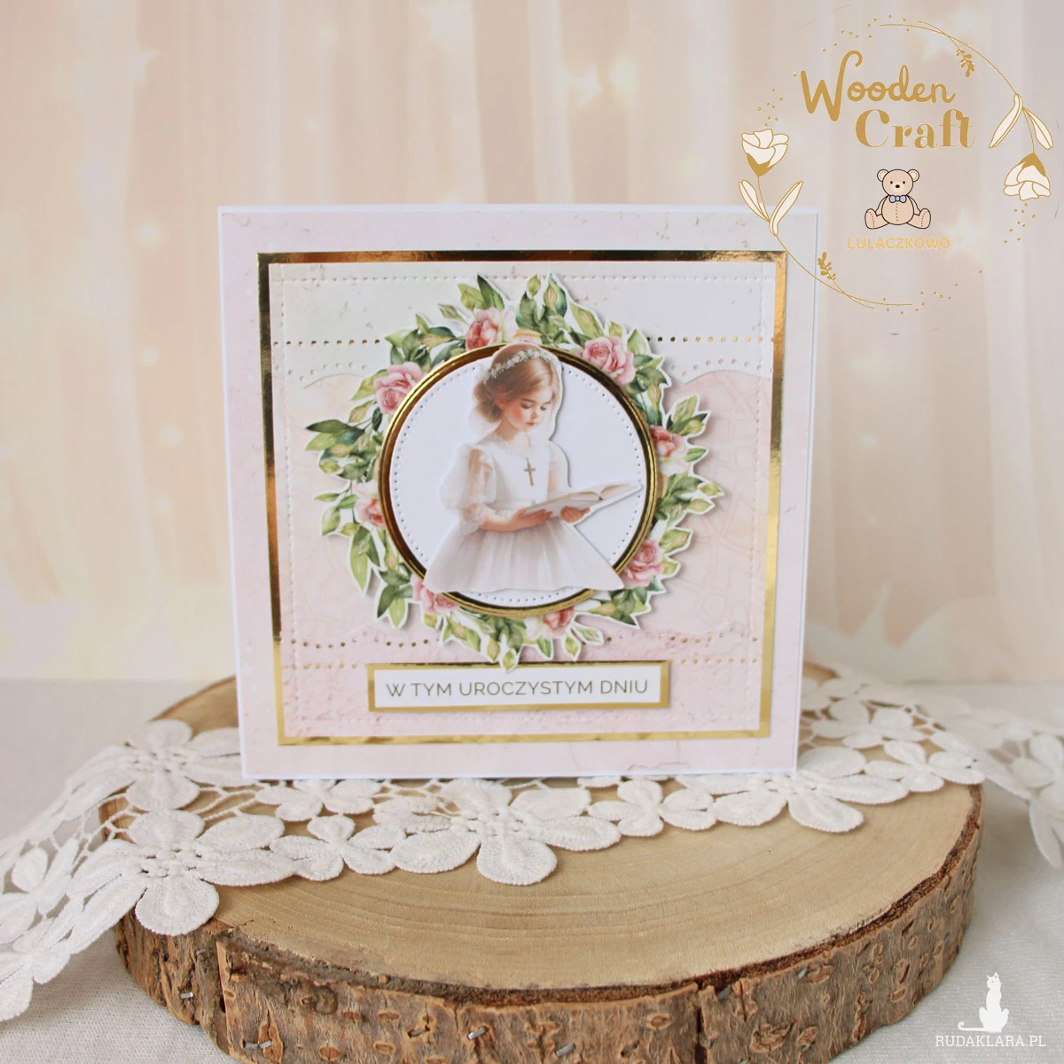 Piękna, elegancka kartka komunijna, pamiątka Pierwszej Komunii Świętej mieszcząca się do koperty, wykonana ręcznie z najwyższą starannością, z cudownej kolekcji papierów "Rose Wine", utrzymana w pastelowych odcieniach malinowego różu, kremu i bieli, z dodatkiem złotych, błyszczących akcentów. Na środku kartki umieszona została grafika dziewczynki komunijnej czytającej biblię, otoczona kwiatowym wianuszkiem, dodatkowo napis "W Tym Uroczystym Dniu"- do napisu mogę również dodać imię dziecka lub całkowicie zmienić go na inny.