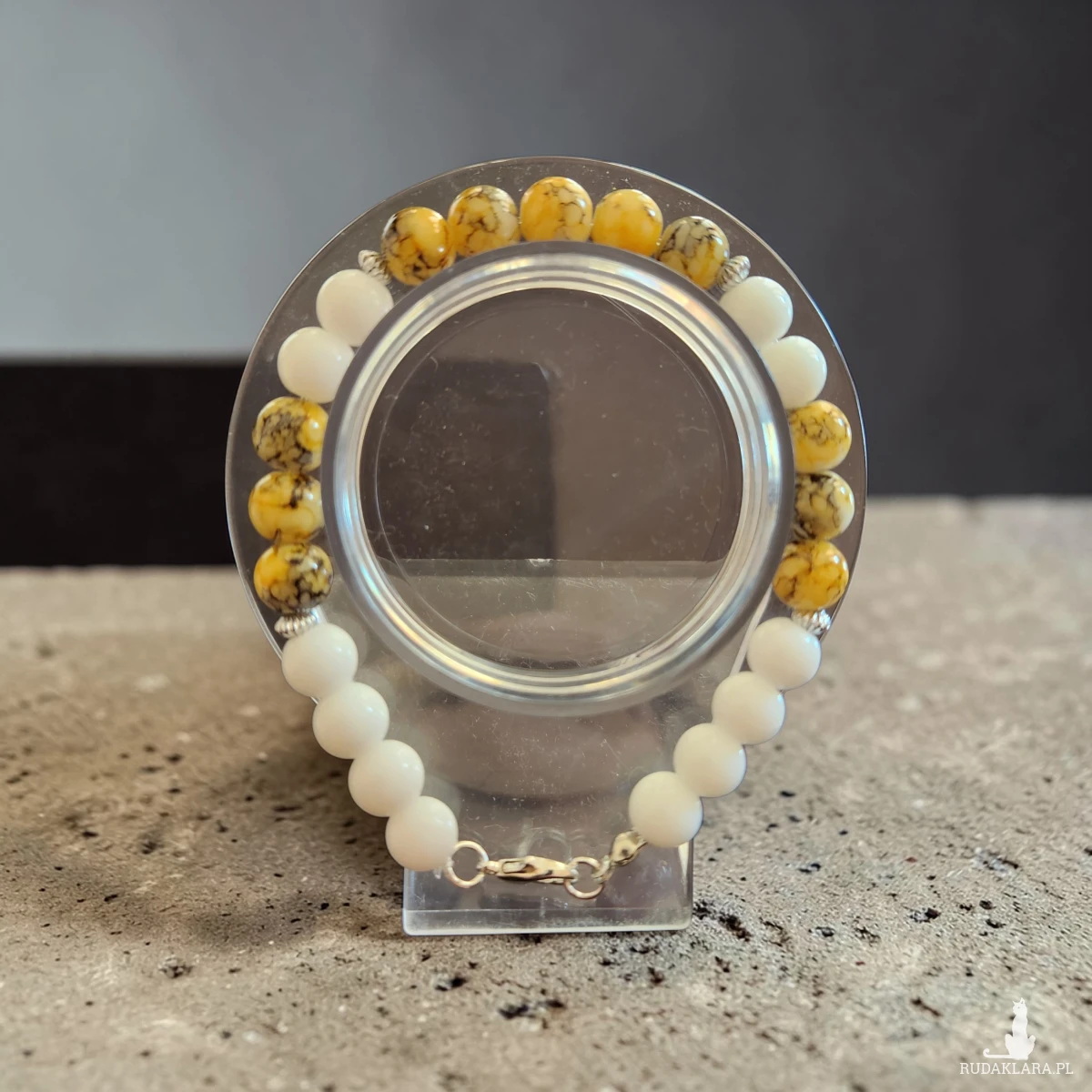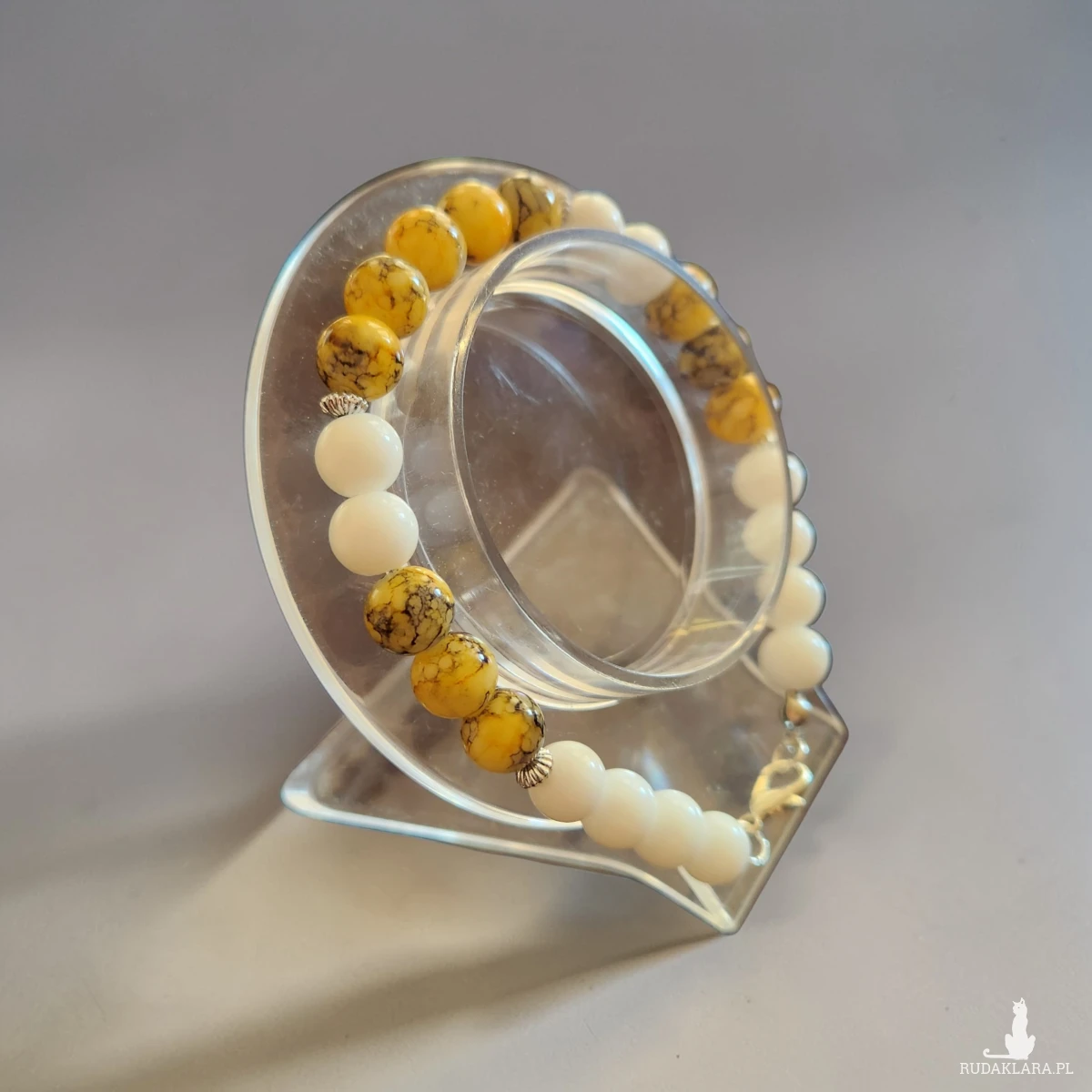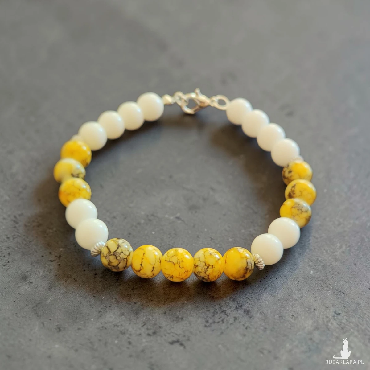 Elegancka i delikatna bransoletka wykonana intensywnie żółtych koralikow z charakterystycznym żyłkowaniem zostały połączone z gładkimi, mlecznobiałymi kamieniami, tworząc harmonijną i stylową kompozycję. Całość uzupełniają ozdobne przekładki oraz solidne metalowe zapięcie.