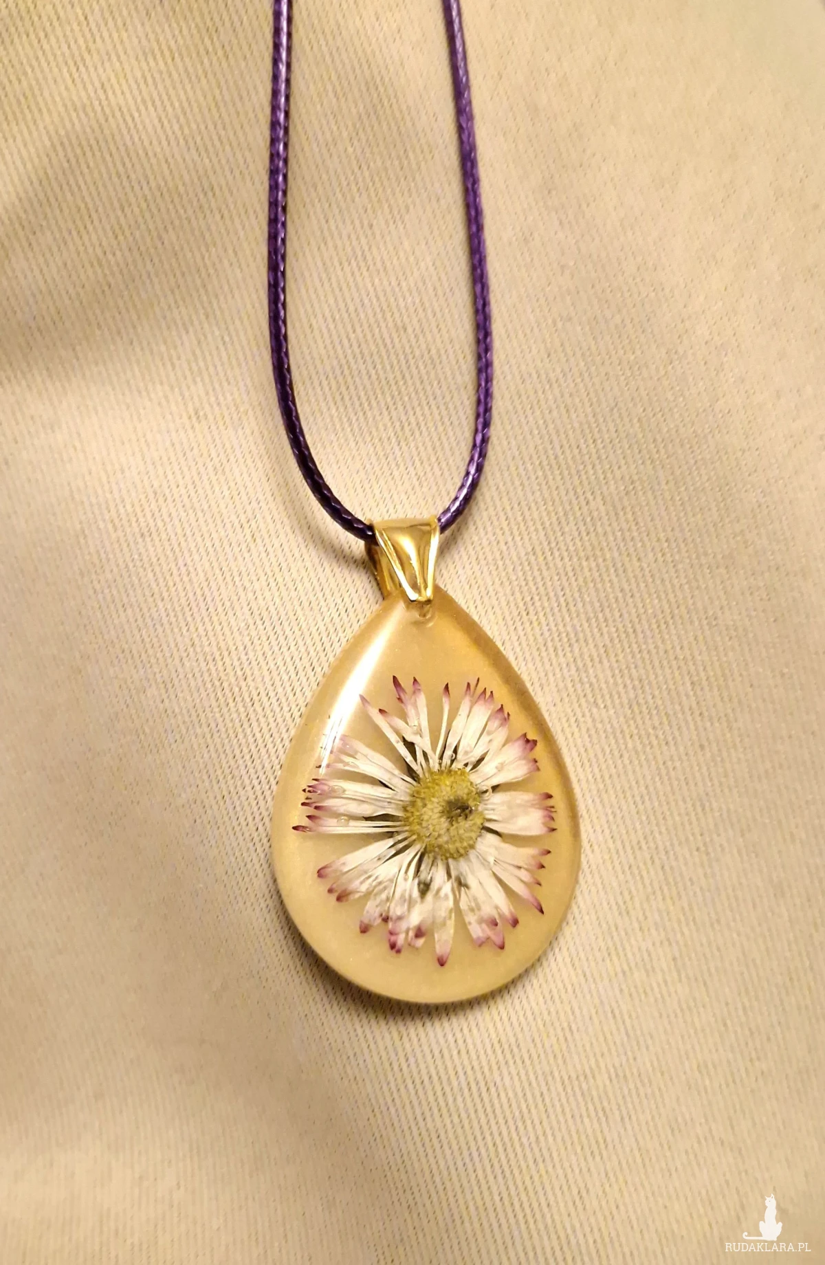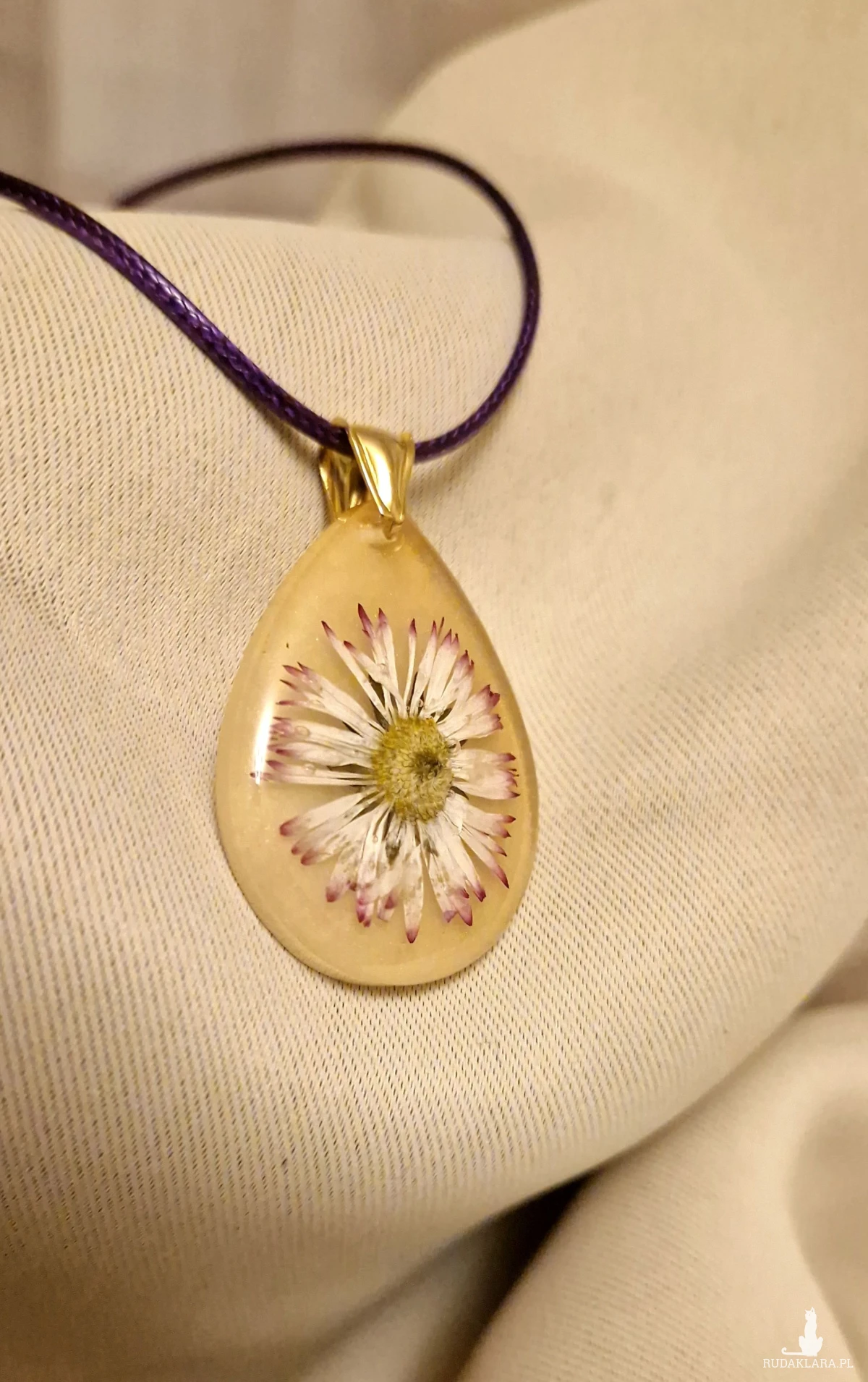 Ręcznie wykonany naszyjnik z żywicy w kształcie łezki. W jego wnętrzu został zatopiony naturalny kwiat, który pięknie kontrastuje z ciepłym, żółtym tłem, tworząc wyjątkową, słoneczną kompozycję.