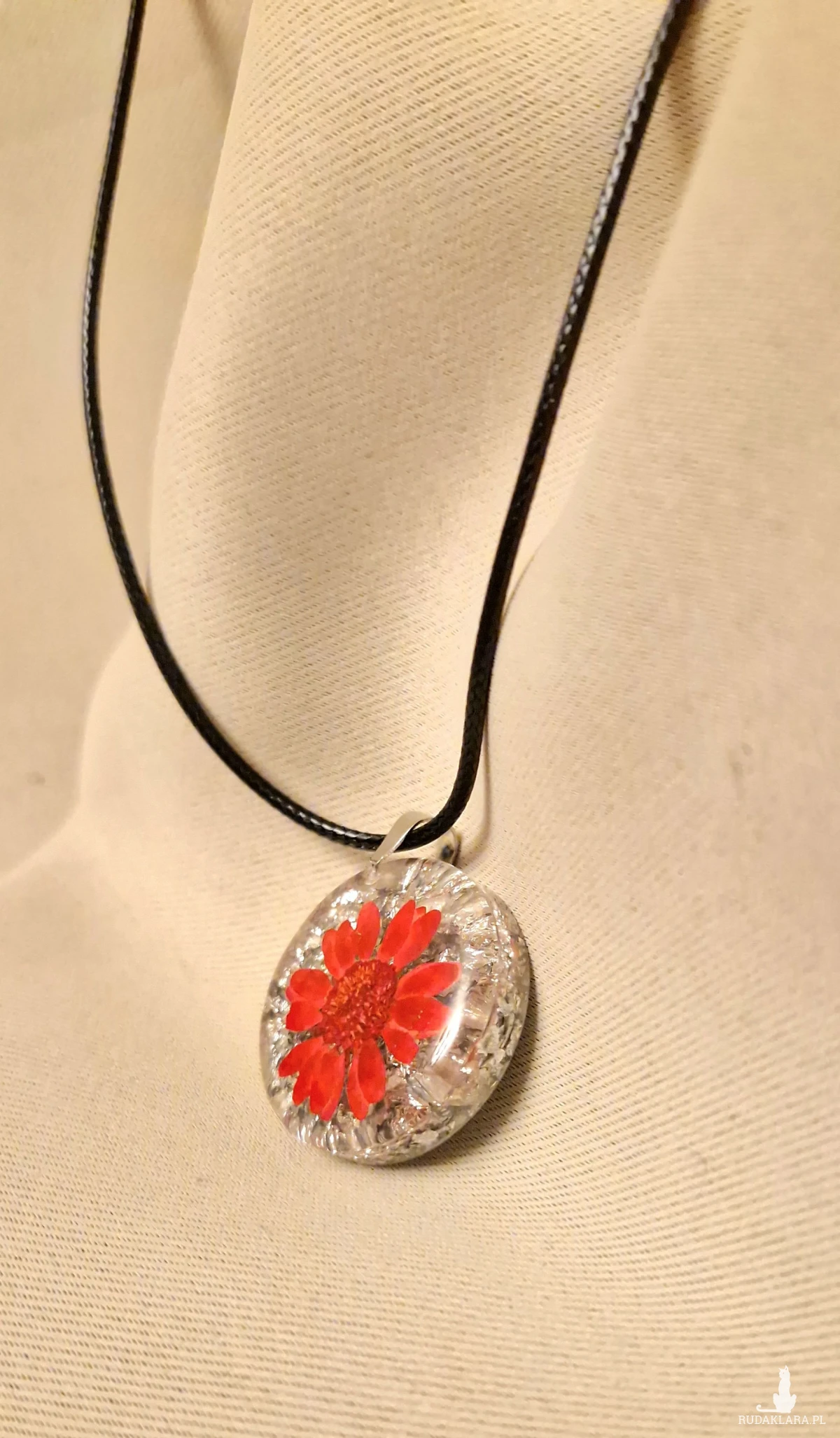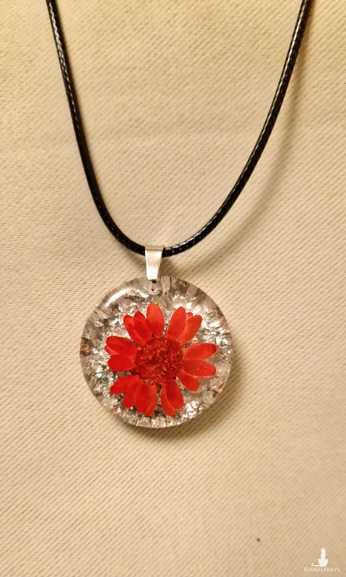 Wisiorek z okrągłym oczkiem wykonany z żywicy, w którym zatopiono suszony kwiat o intensywnie czerwonym kolorze. Głęboka czerwień pięknie wyróżnia się na srebrnym tle, tworząc efektowną i przyciągającą wzrok kompozycję. Całość dopełnia woskowany sznurek w kolorze czarnym.