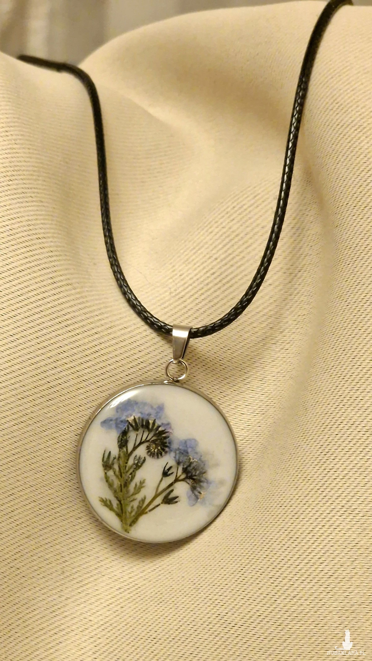 Wisiorek z okrągłym oczkiem z żywicy w metalowej bazie. W żywicy zatopiono suszony kwiat w delikatnym błękitnym kolorze, który wyróżnia się na białym tle. Całość dopełnia woskowany sznurek w kolorze czarnym.