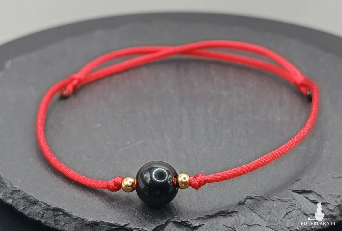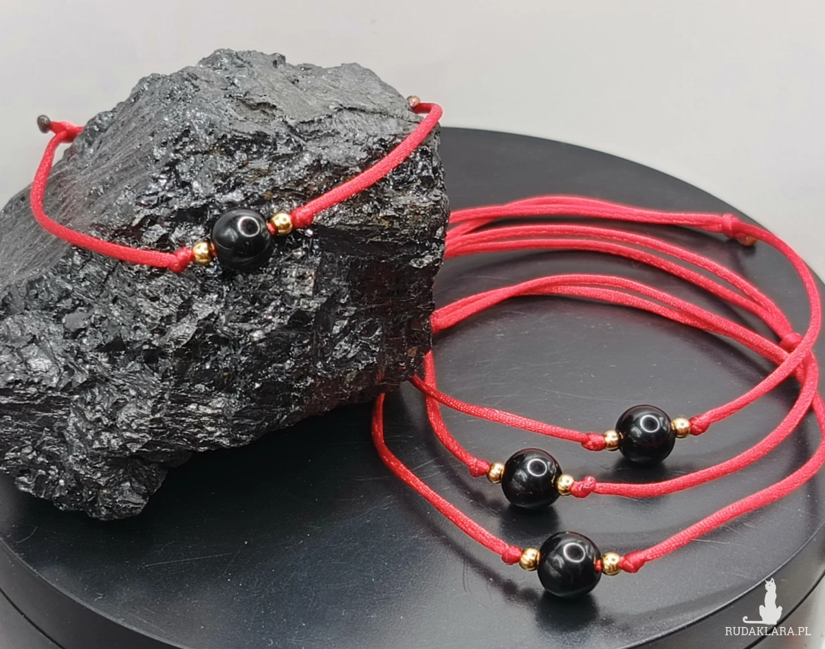 Bransoletka ochronna z czarnym turmalinem na pięknym, czerwonym satynowym sznurku. Dodatki ze stali szlachetnej.