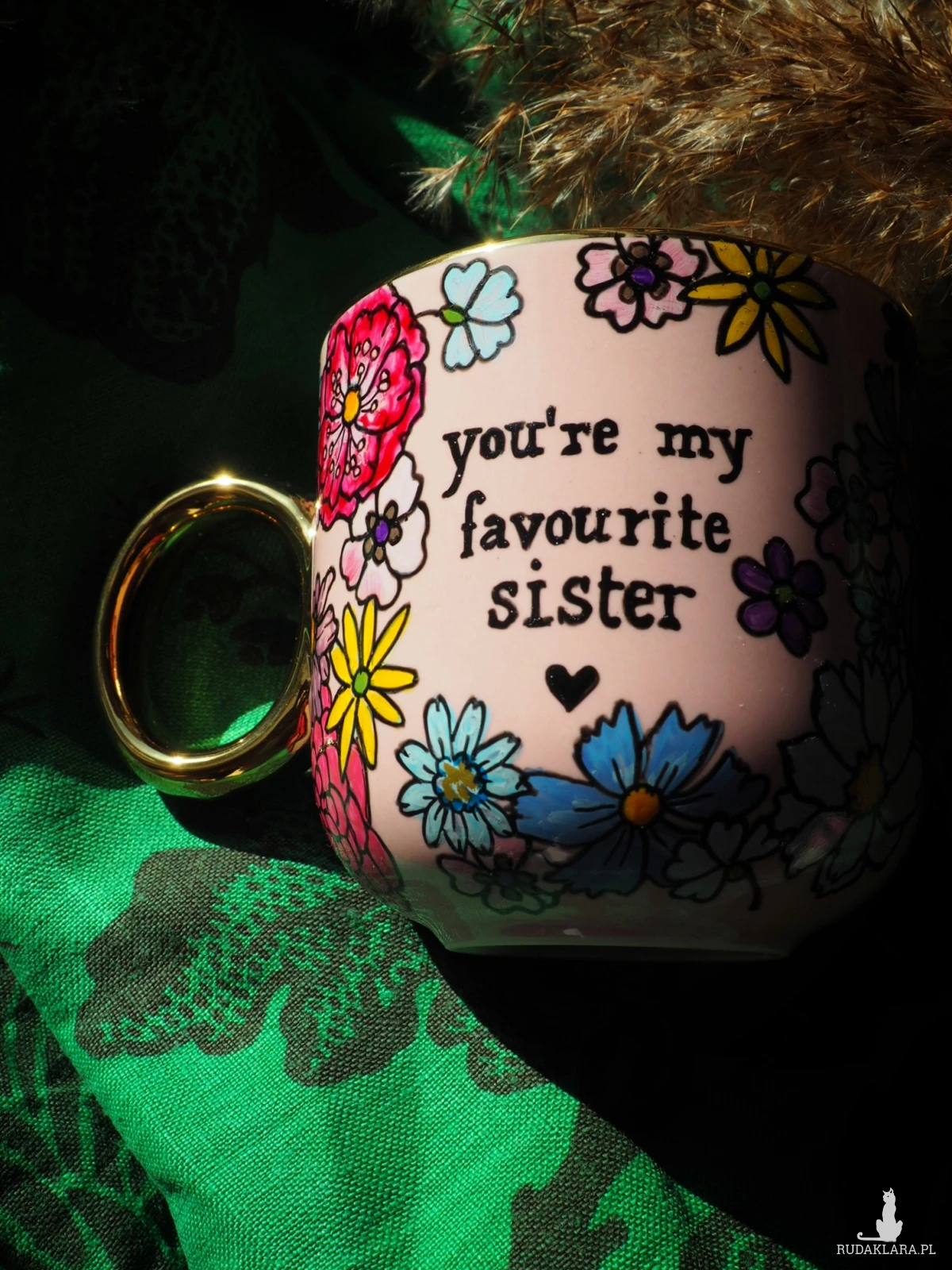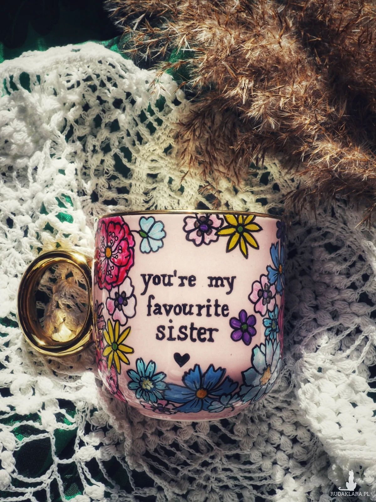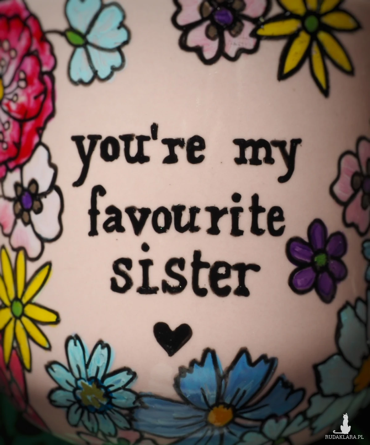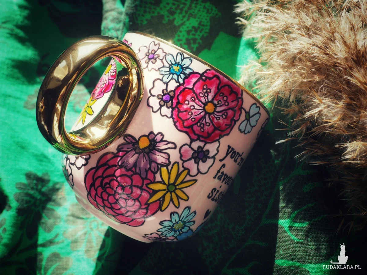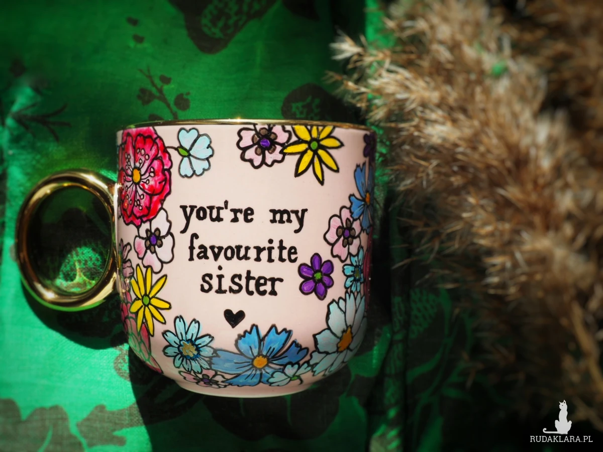Ręcznie malowany kubek z napisem "You're my favourite sister"" i kolorowym kwiatowym wzorem to doskonały prezent dla siostry lub przyjaciółki, którą traktujesz jak najukochańszą siostrę - "sister from another mister" :)