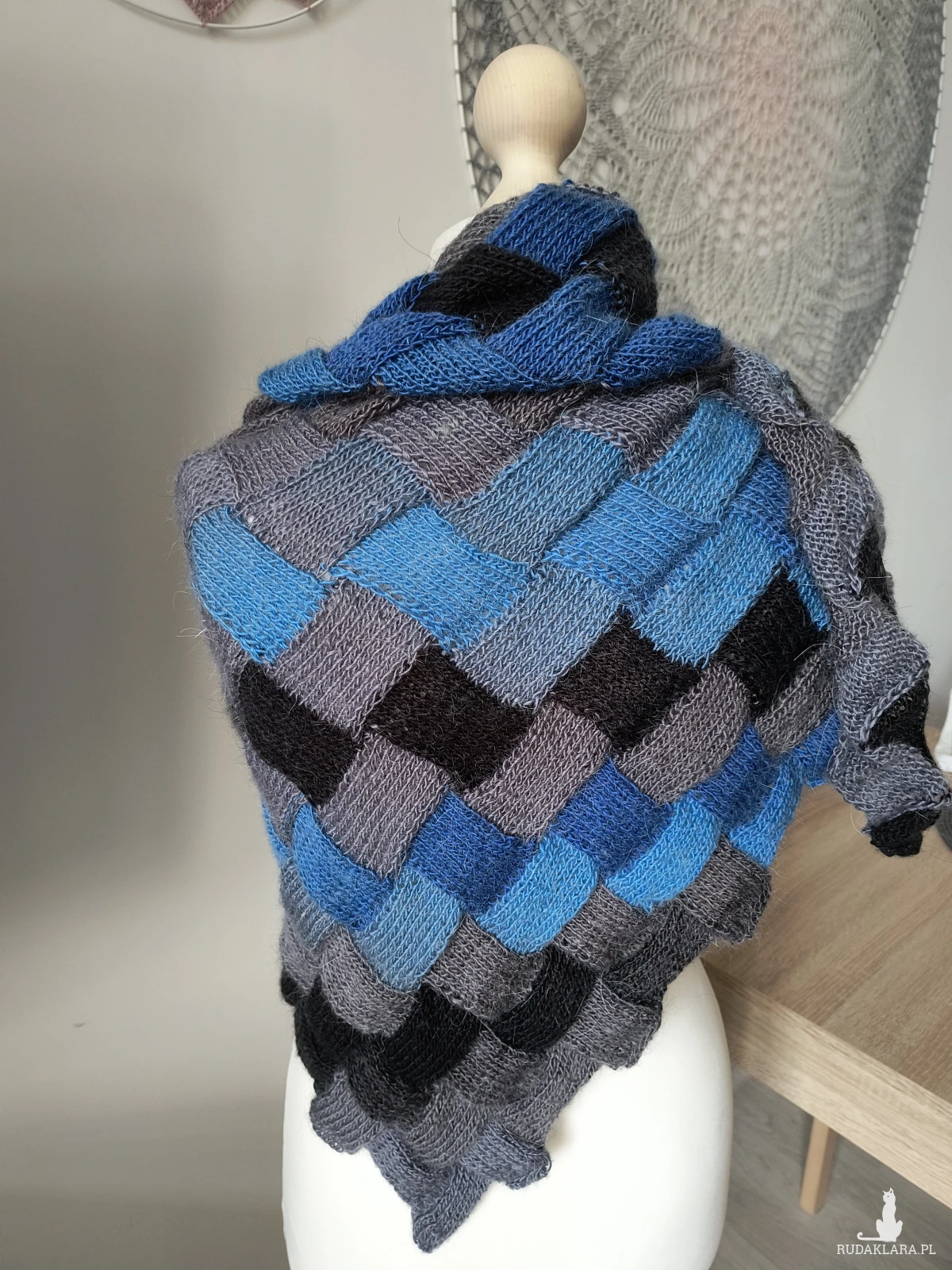 Chusta robiona na drutach. Alpaka z akrylem w kolorze ombre. Odcienie szary, czarny, niebieski.