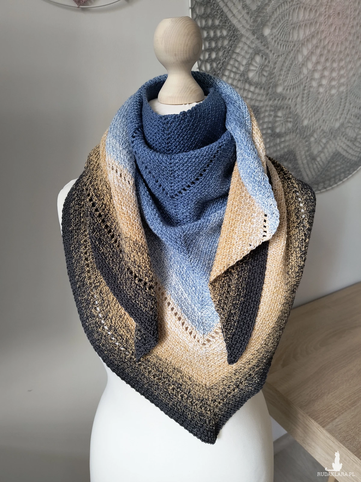 Chusta robiona na szydełku. 55% bawełna 45% akryl w kolorze ombre. Odcienie niebieski, masło i szary z brązem.