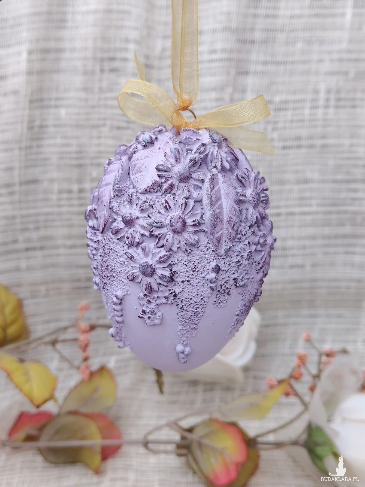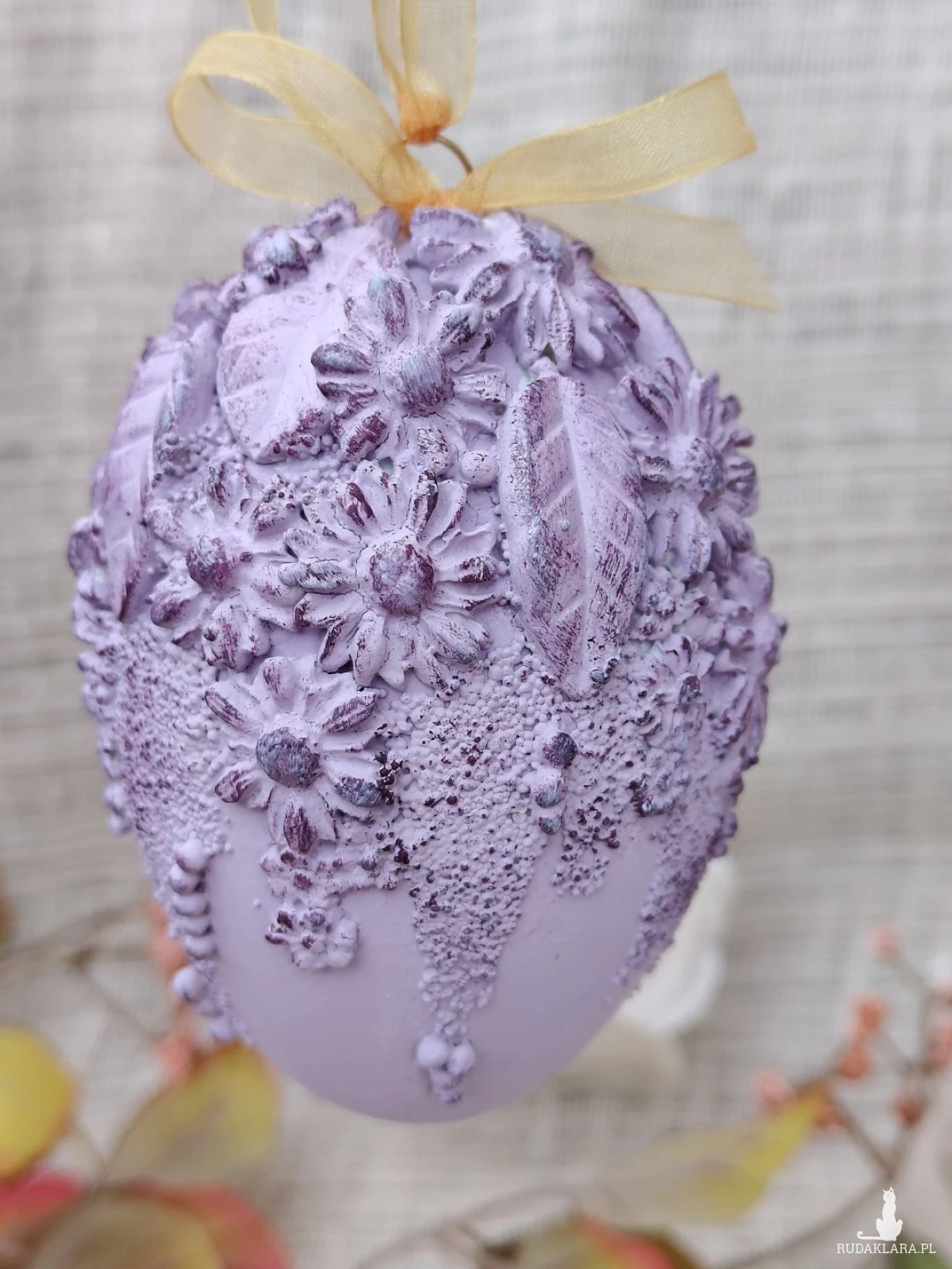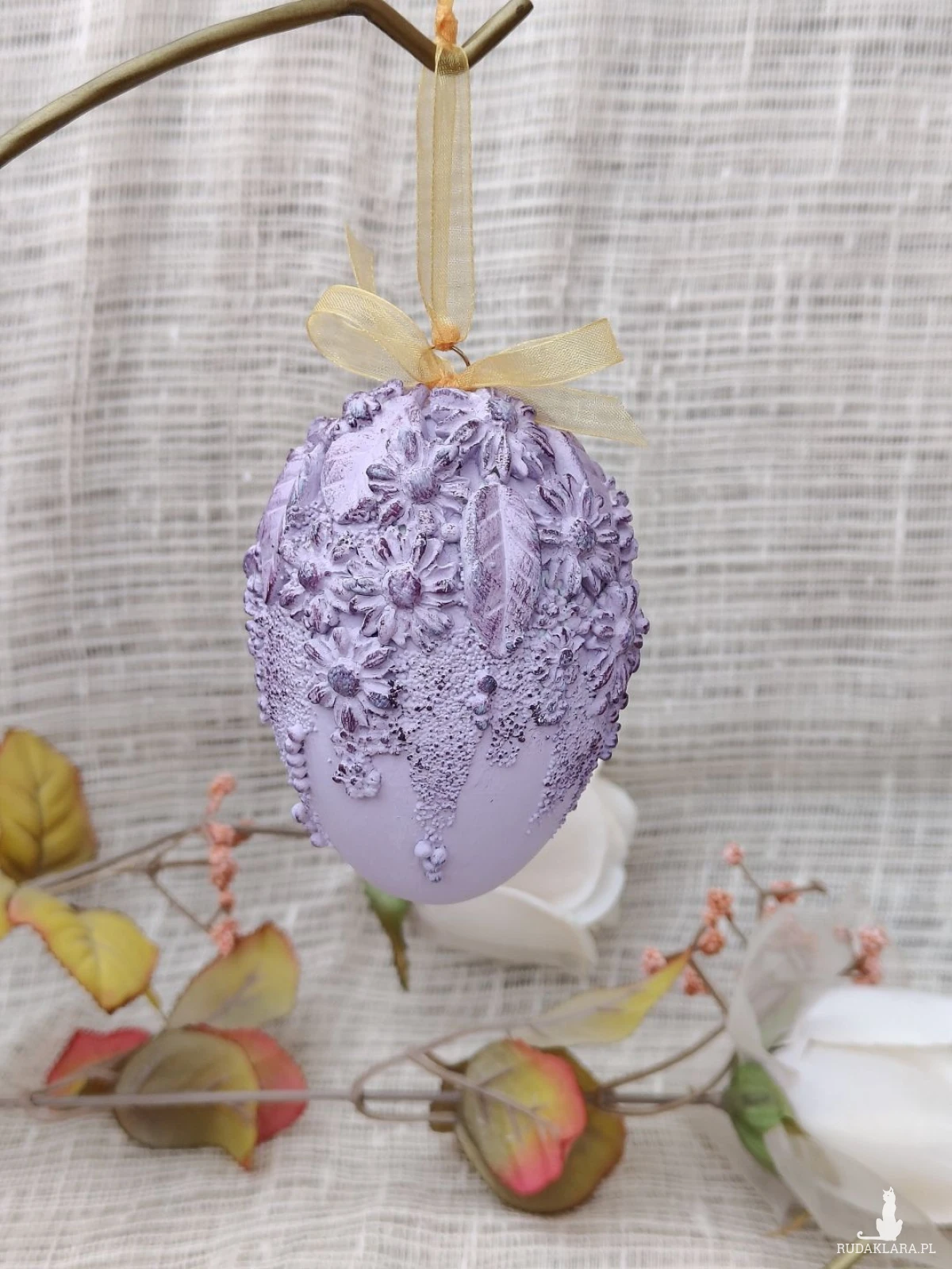 Wyjątkowa, ręcznie zdobiona pisanka w subtelnym, lawendowym odcieniu to elegancka dekoracja wielkanocna, która zachwyca bogactwem detali. Jej powierzchnię zdobią misternie wykonane kwiaty, liście oraz dekoracyjne faktury, podkreślone delikatnym przecieraniem w ciemniejszym tonie fioletu. Całość wieńczy satynowa kokarda w ciepłym, złocistym kolorze, dodająca kompozycji lekkości i klasy.