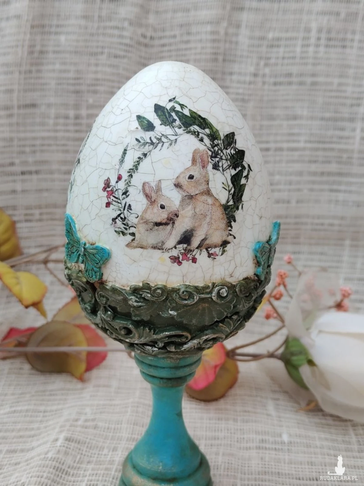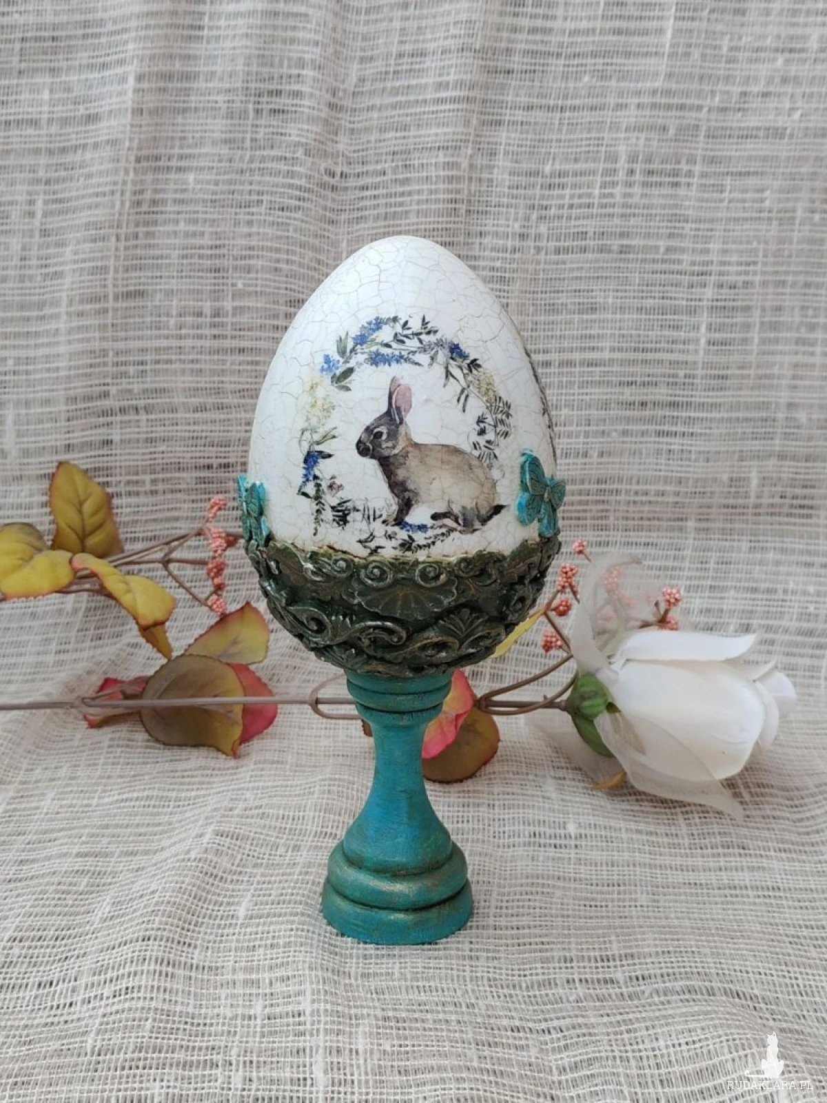 Wyjątkowa pisanka dekoracyjna w stylu vintage, ręcznie wykończona techniką decoupage i postarzana efektem spękań (crackle). Centralnym motywem jest uroczy zajączek otoczony wianuszkiem z delikatnych kwiatów i ziół, co nadaje całości sielski, wiosenny charakter. Dolna część pisanki osadzona jest na stylizowanym, turkusowym postumencie z ozdobnymi reliefami, który podkreśla jej elegancję i sprawia, że dekoracja pięknie prezentuje się na stole, komodzie lub w witrynie. Idealna jako wielkanocna ozdoba lub oryginalny prezent.