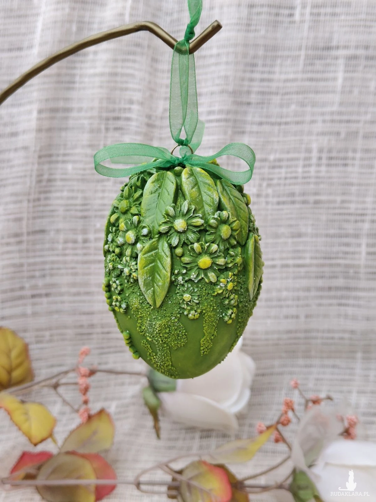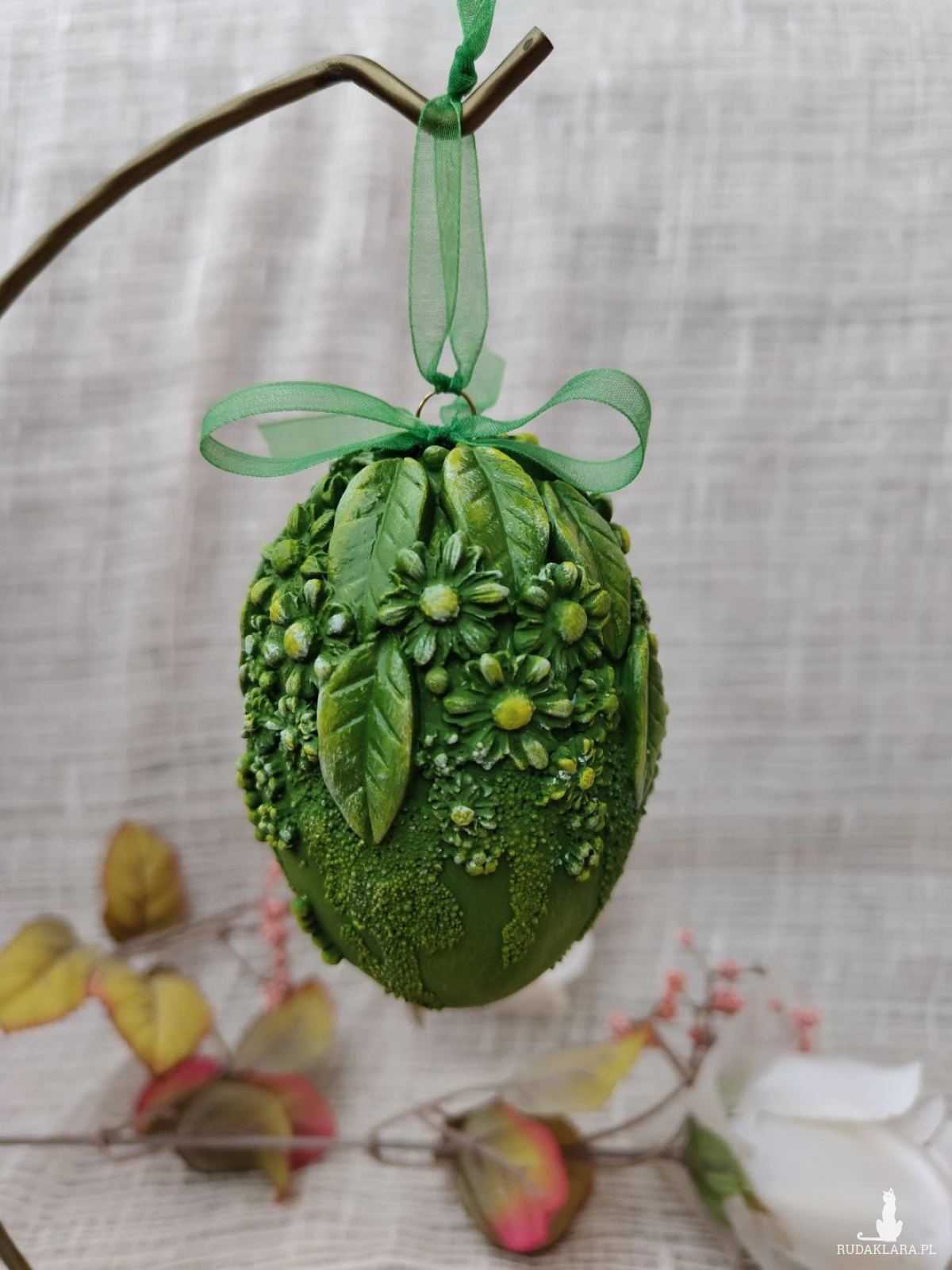 Wyjątkowa pisanka dekoracyjna w intensywnym, soczystym odcieniu zieleni, inspirowana budzącą się do życia wiosenną łąką. Bogato zdobiona kompozycją liści, drobnych kwiatów i subtelnych faktur 3D tworzy efekt przestrzennej, ręcznie modelowanej dekoracji. Całość dopełnia delikatna, półtransparentna wstążka, dzięki której pisankę można zawiesić na gałązkach, w oknie, na stroiku lub świątecznym drzewku wielkanocnym.