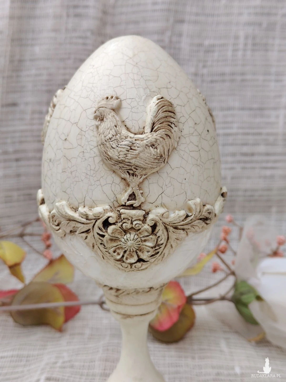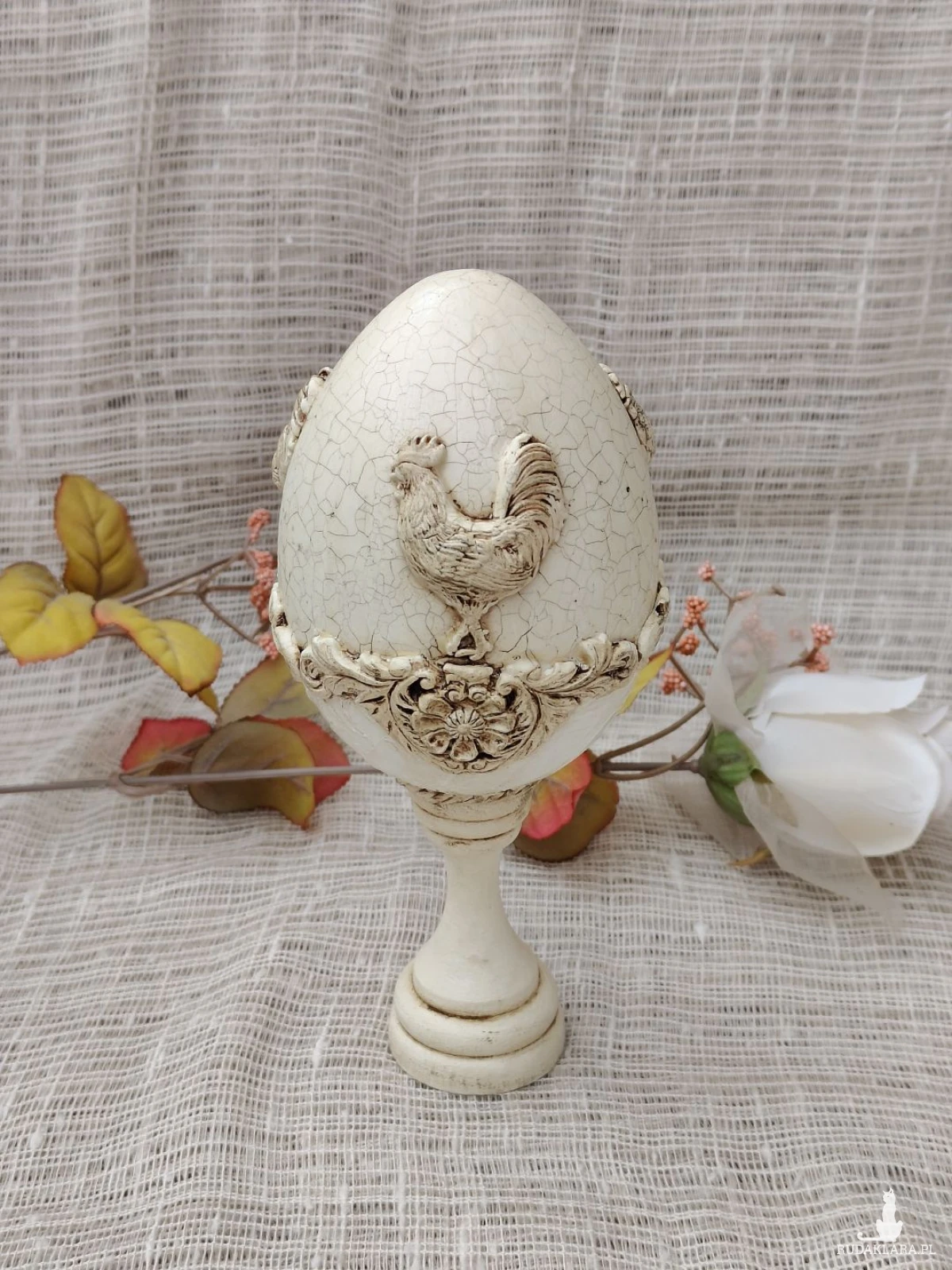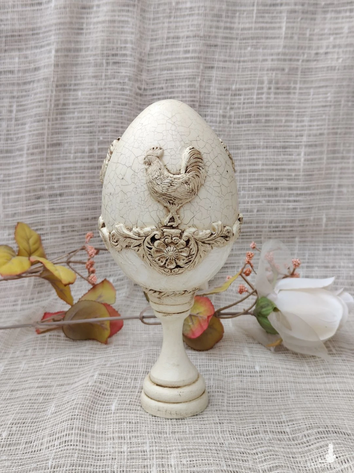 Elegancka pisanka dekoracyjna w odcieniu ciepłej, postarzanej bieli, inspirowana stylem prowansalskim i rustykalnym. Centralnym motywem jest dekoracyjny relief koguta – symbolu domowego ciepła, poranka i nowego początku. Całość zdobią subtelne ornamenty roślinne oraz efekt spękań (crackle), który nadaje pisance szlachetnego, vintage’owego charakteru.