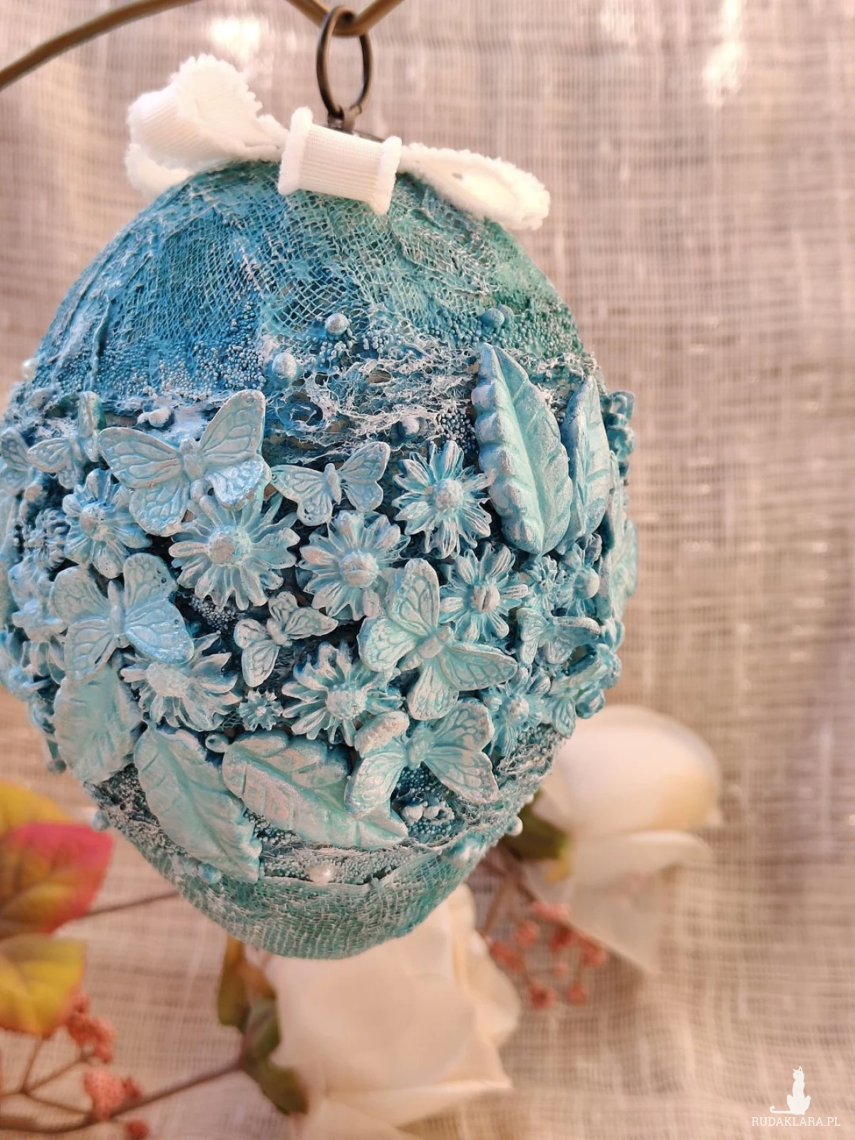 Błękitna Łąka to wyjątkowa, ręcznie zdobiona pisanka, która zachwyca świeżością koloru i bogactwem detali. Intensywny odcień turkusu przeplata się z subtelnymi przetarciami, tworząc efekt artystycznej głębi i lekkości. Kompozycja przestrzennych motyli, kwiatów oraz liści otula całą formę, nadając jej romantyczny, a jednocześnie elegancki charakter. To dekoracja, która przyciąga spojrzenia i wprowadza do wnętrza wiosenną energię oraz nutę luksusu.