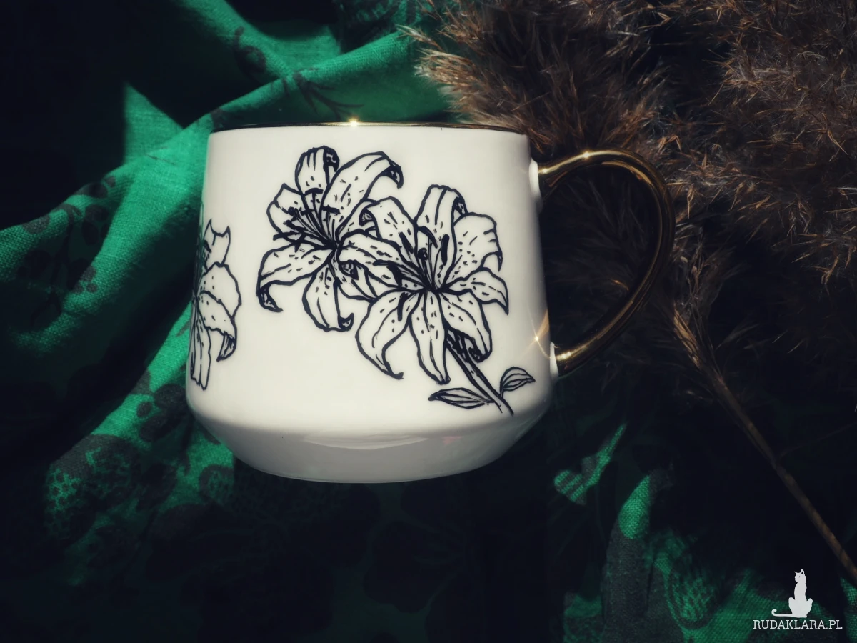 Połączenie eleganckiego wzoru z nieeleganckim hasłem - ręcznie malowany czarno-biały kubek z rysunkiem lilii i napisem "F'uck it all" to świetny pomysł na udany dzień lub udany prezent.