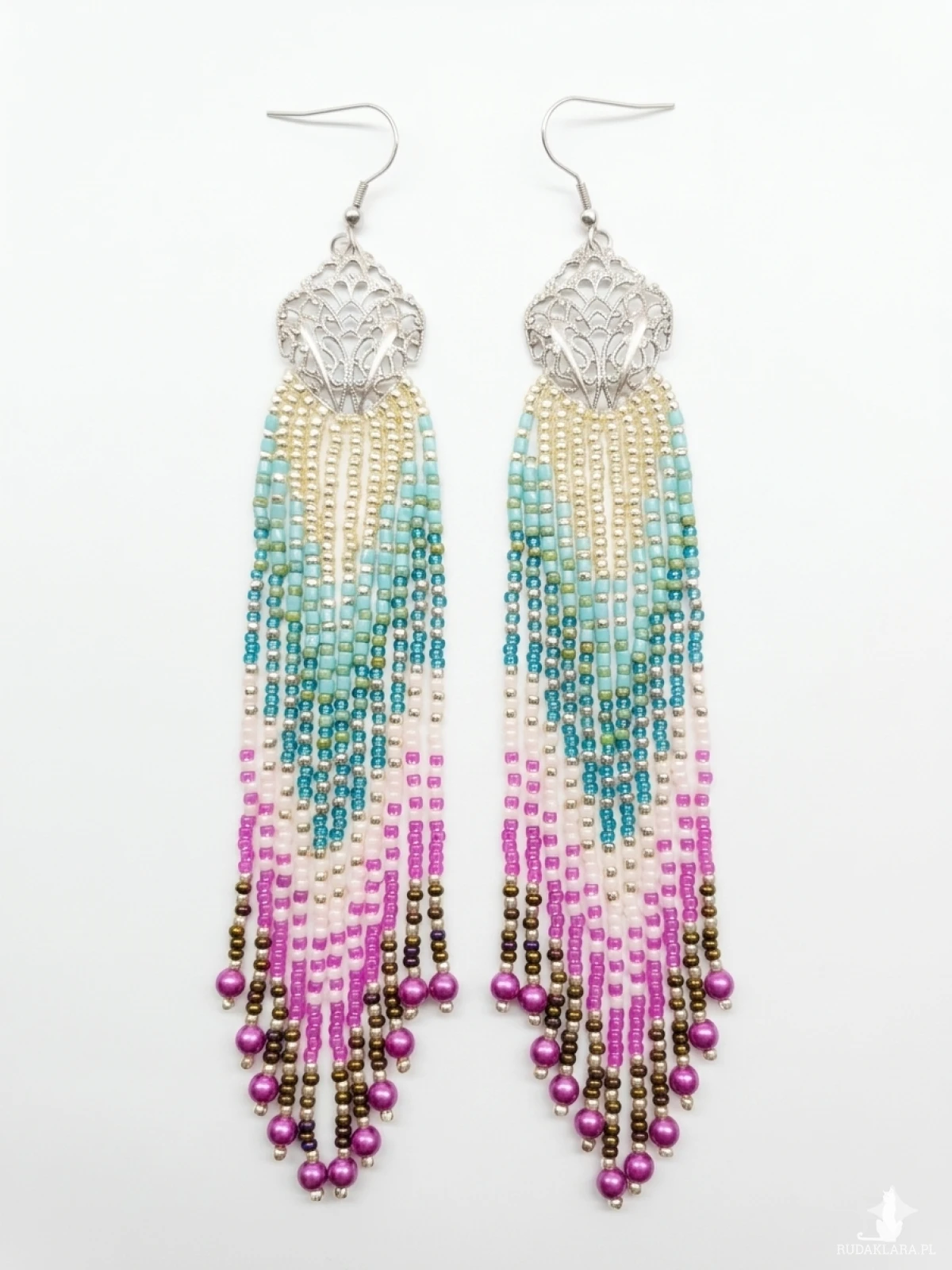 Efektowne, ręcznie plecione kolczyki wiszące, które zachwycają precyzją wykonania i płynnym przejściem barw. Ażurowe zdobienie w kolorze srebra łączy się z dziesiątkami drobnych koralików w odcieniach turkusu, pudrowego różu i nasyconej fuksji.