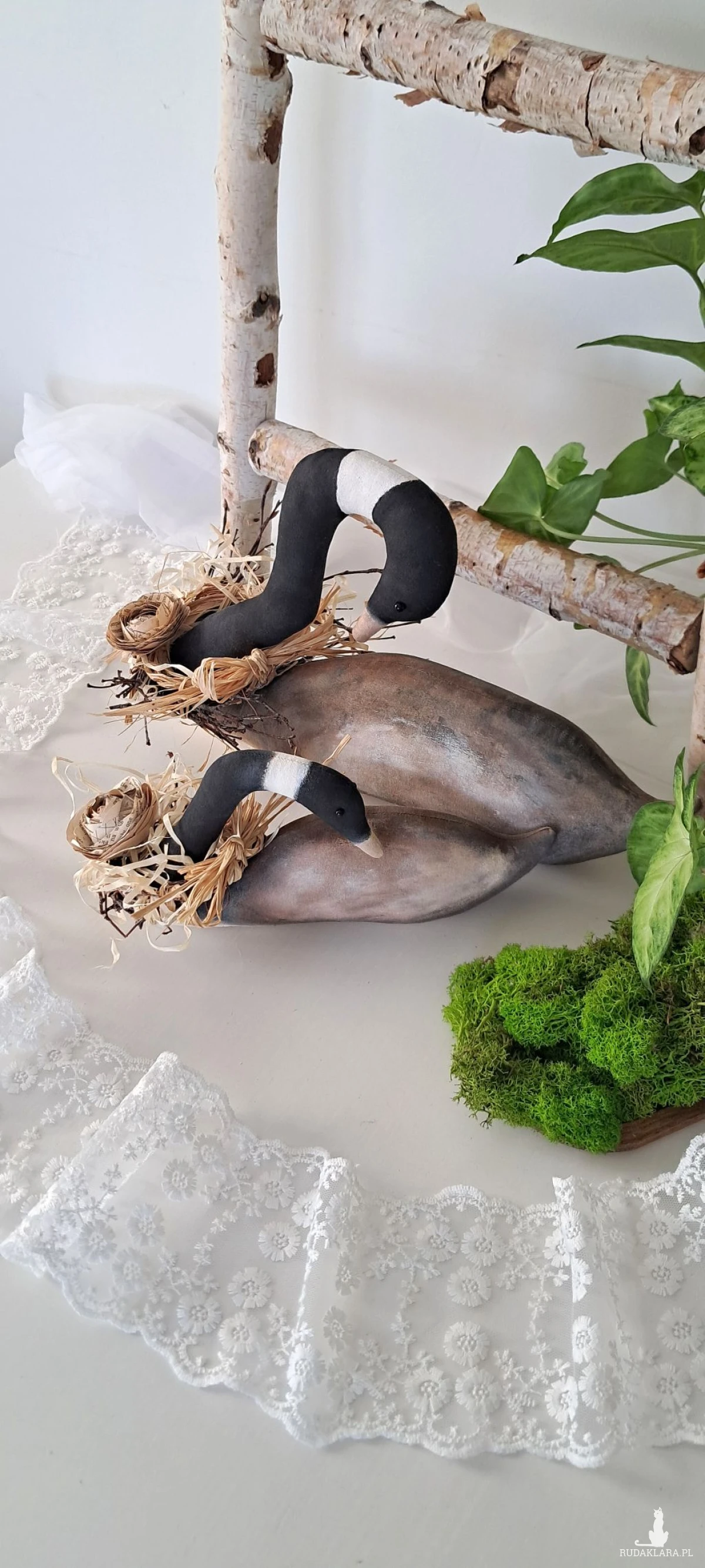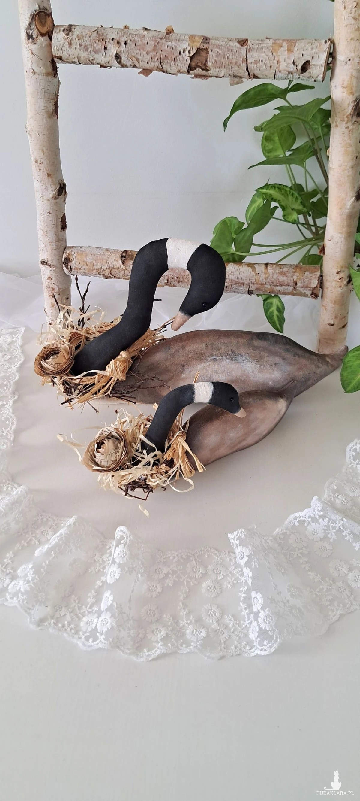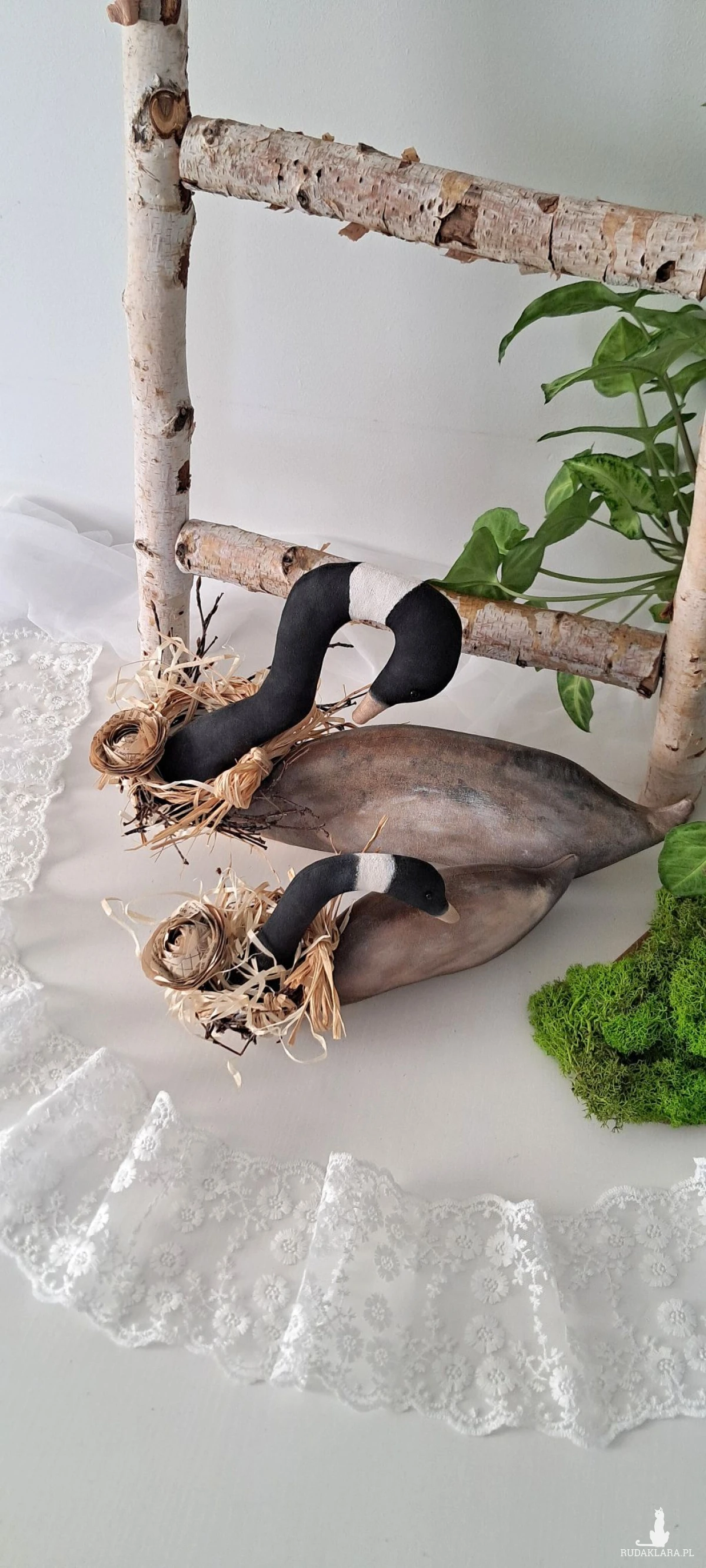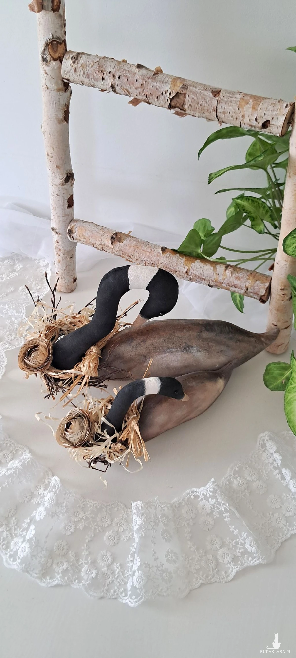 Mam do sprzedania własnoręcznie wykonane dekoracje w postaci dzikich gęsi. Gęsi uszyte z surówki bawełnianej,wypełnionej antyalergiczną kulką silikonową. Pomalowane farbami akrylowymi w kolorach brąz,beż, biel i czerń. Na szyi dodatkowo udekorowane wianuszkami z witek brzozowych i rafii,z której też wykonałam kokardkę oraz dodatkowo przyozdobione różyczkami zrobionymi z papieru. Większa gąska wymiary: 35 cm x21 cm; mniejsza: 24 cm x12 cm. Stoją z lekkim podparciem.