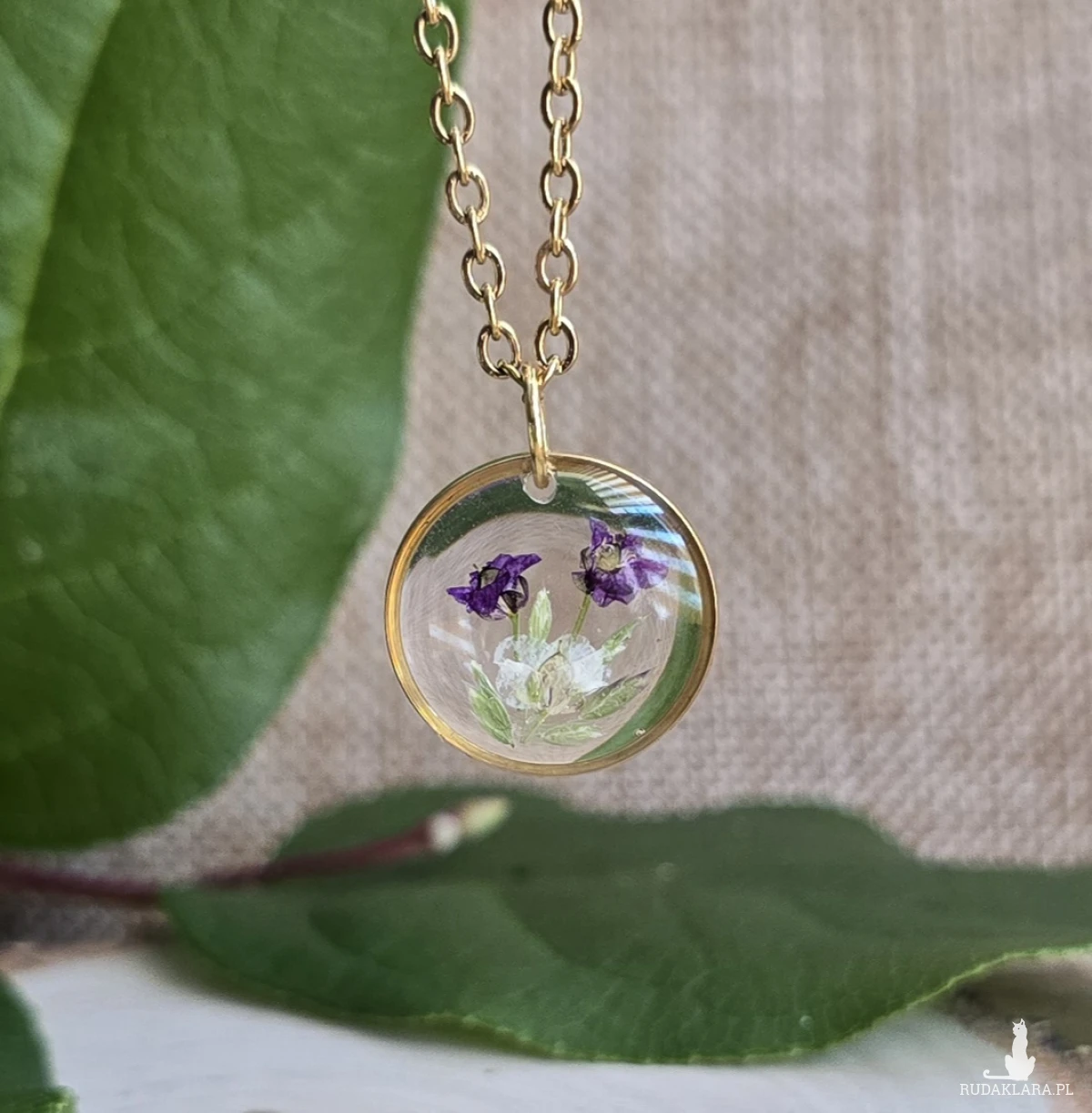 Oferuję Państwu unikalną biżuterię. Zawieszka jest wykonana z suszonych kwiatów i żywicy epoksydowej. Biżuteria jest wspaniałym i oryginalnym prezentem na lata.