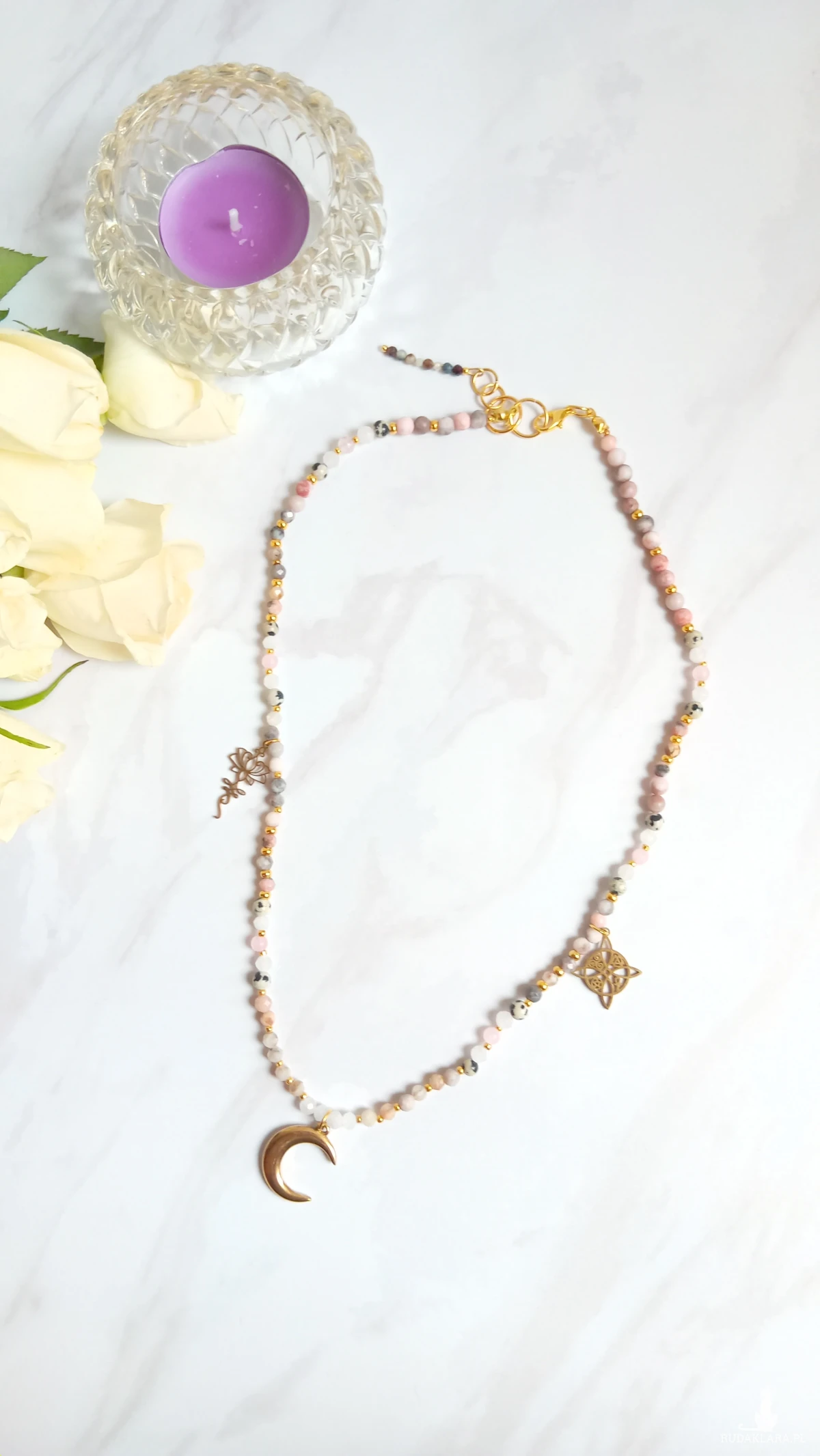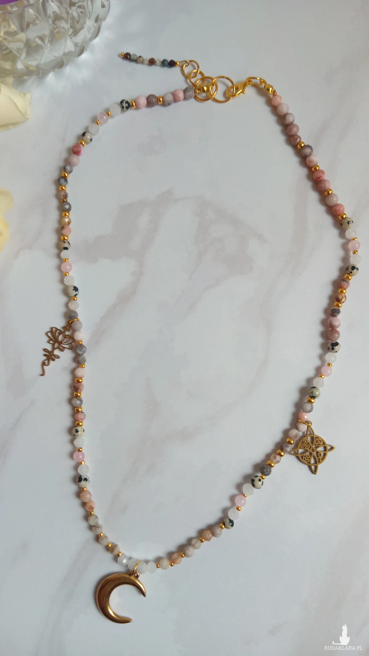 Naszyjnik wykonany z naturalnych kamieni opalu, jaspisu dalmatyńskiego, kryształu górskiego i kwarcu różowego.