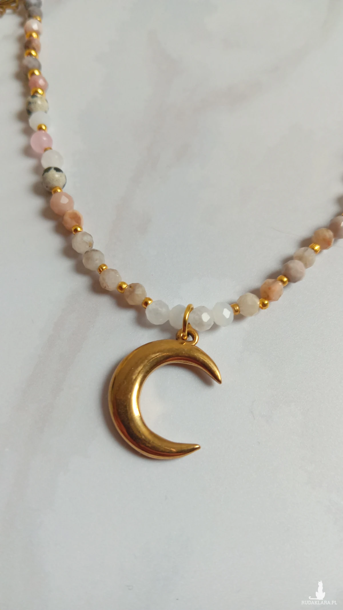 Naszyjnik wykonany na żylce elastycznej. Zapięcie z regulacją- można delikatnie dostosować długość.