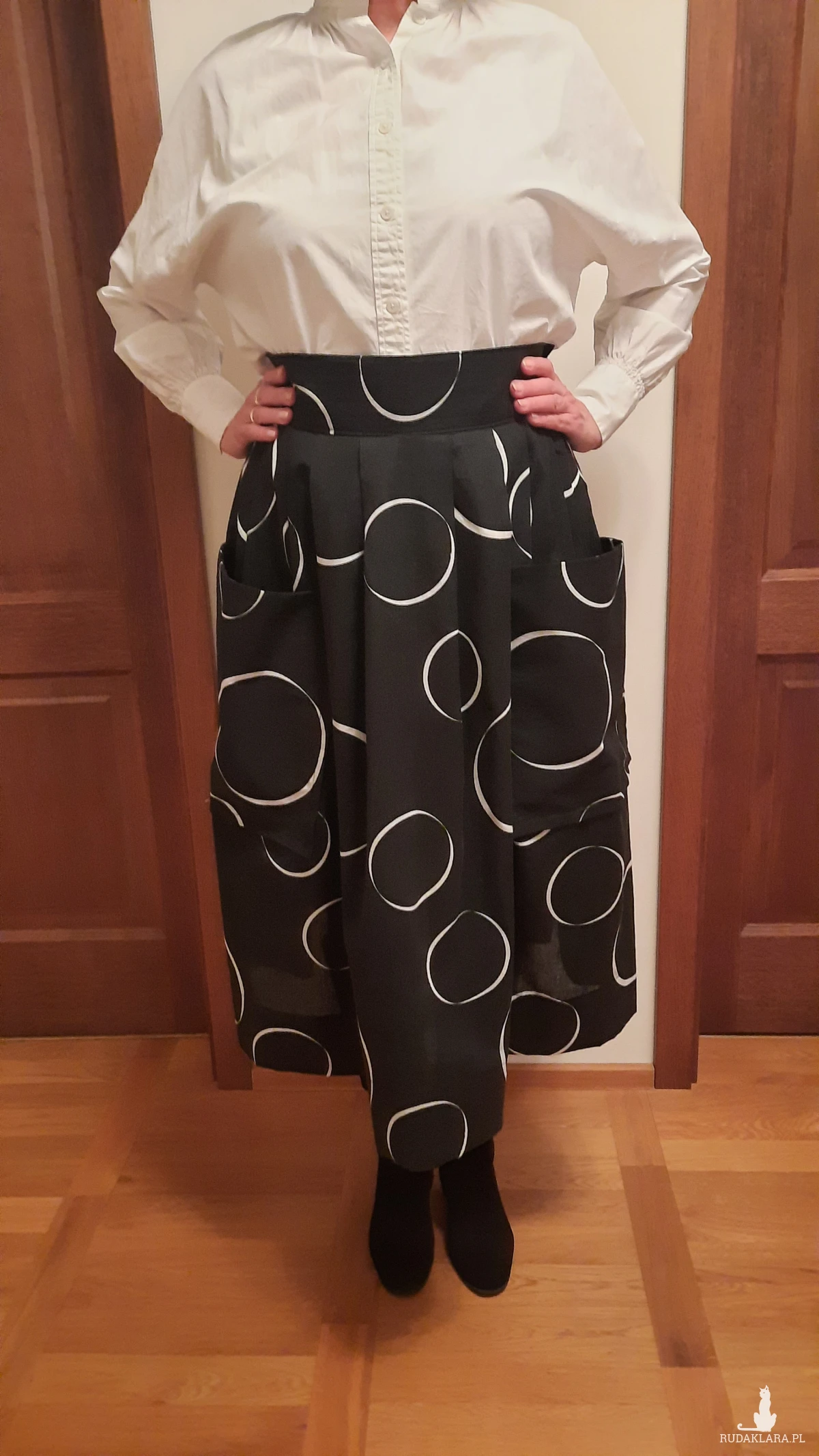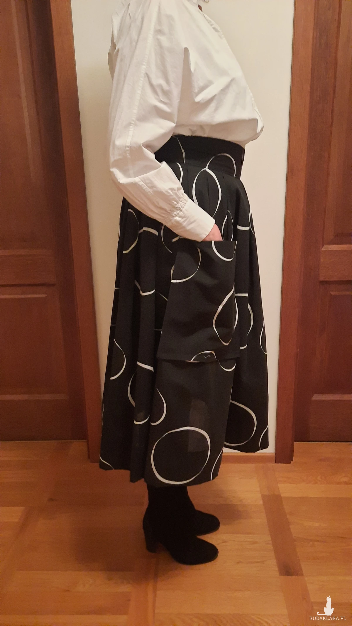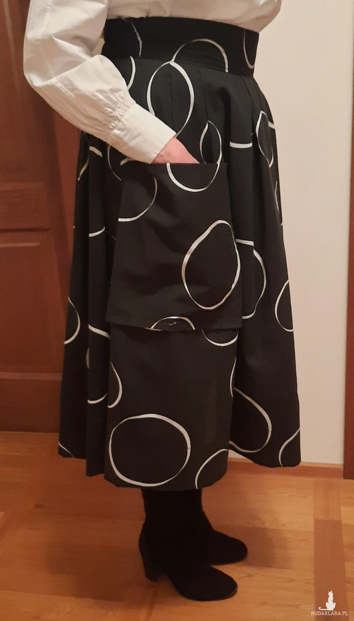 Sprzedam autorską spódnicę uszytą z pięknej czarnej tkaniny w koła z cudownymi kieszeniami. . Jest z tyłu na gumie ,pas 2x38do 43 długość 84 z paskiem. Oryginał, jedyna, bardzo polecam! Zrób sobie prezent! Ta czerń i kieszenie! Już możesz w nią wskoczyć!!!
