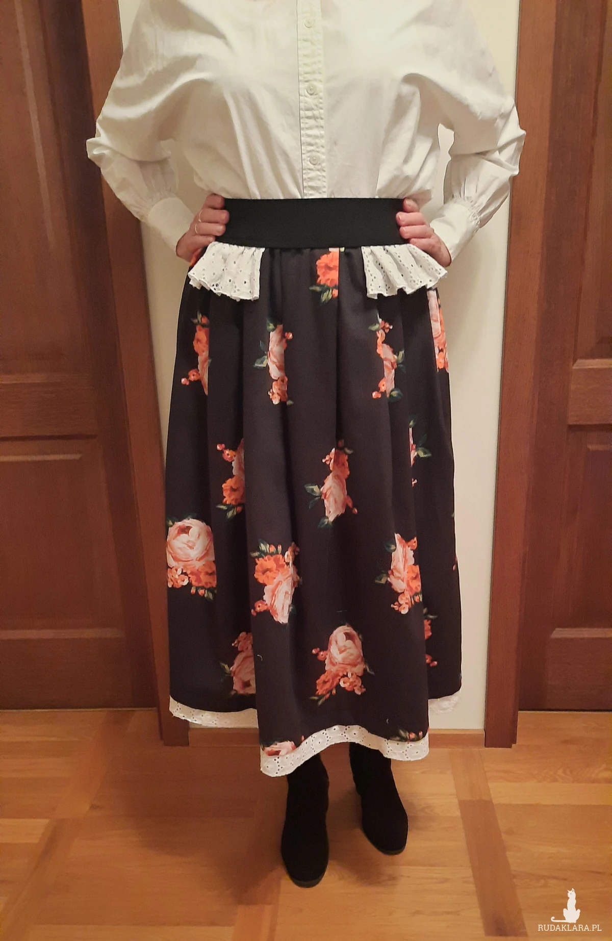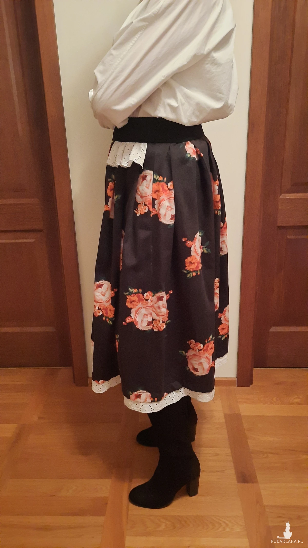Sprzedam autorską spódnicę uszytą z pięknej czarnej tkaniny w róże i tak jak to widziałam w głowie ;) z dodatkiem białej koronki. Jest na gumie ,pas 2x38do 44 długość 70 z paskiem. Oryginał, jedyna, bardzo polecam! Zrób sobie prezent! Ta czerń i koronką! Już możesz w nią wskoczyć!!!