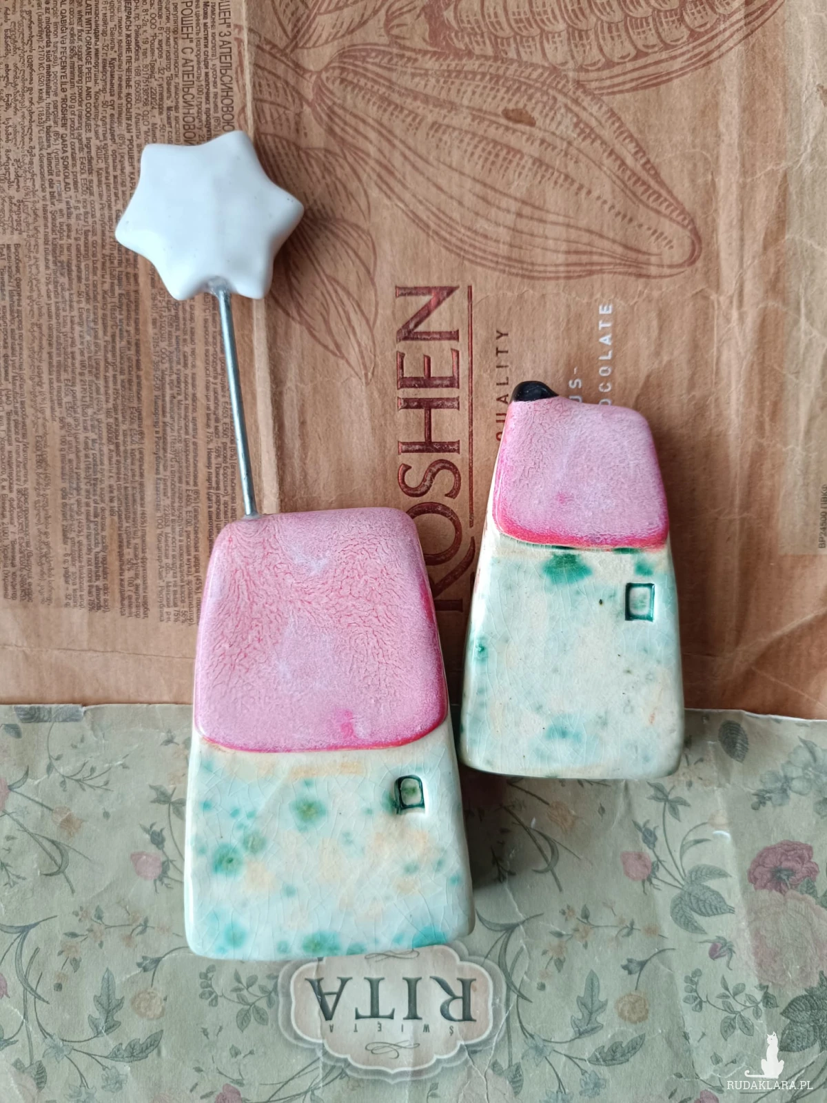Domki z wiejskiej zagrody wykonane z gliny szamotowej wypalone na biskwit, a następnie szkliwione w temperaturze ok 1260 stopni C. Wymiary dużego13 cm x 5,5 cm, wymiary małego : 4 cm x 5,5 cm. Serdecznie polecam.