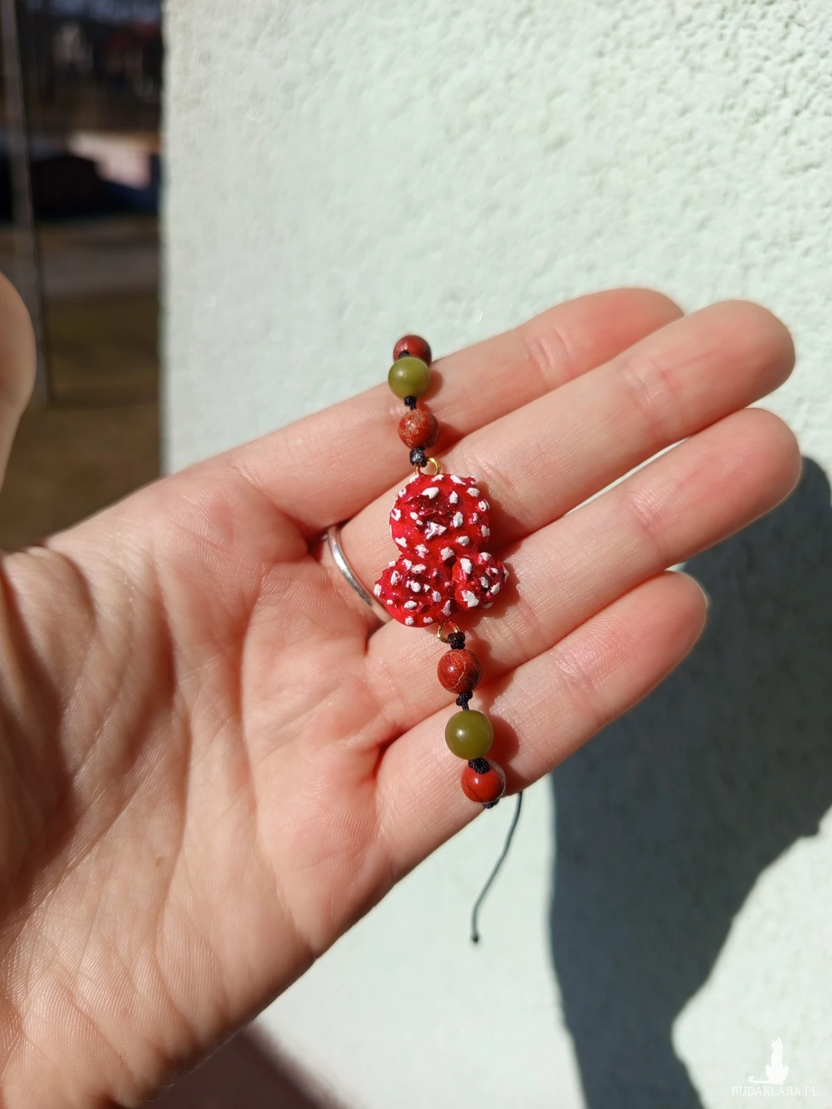 Urocza, lekko baśniowa i pełna dobrej energii – ta ręcznie wykonana bransoletka zachwyci każdego miłośnika natury i magicznych akcentów. W jej centrum znajduje się miniaturowy muchomorek z glinki polimerowej, starannie wyrzeźbiony i pomalowany, który przywołuje klimat leśnych wędrówek.