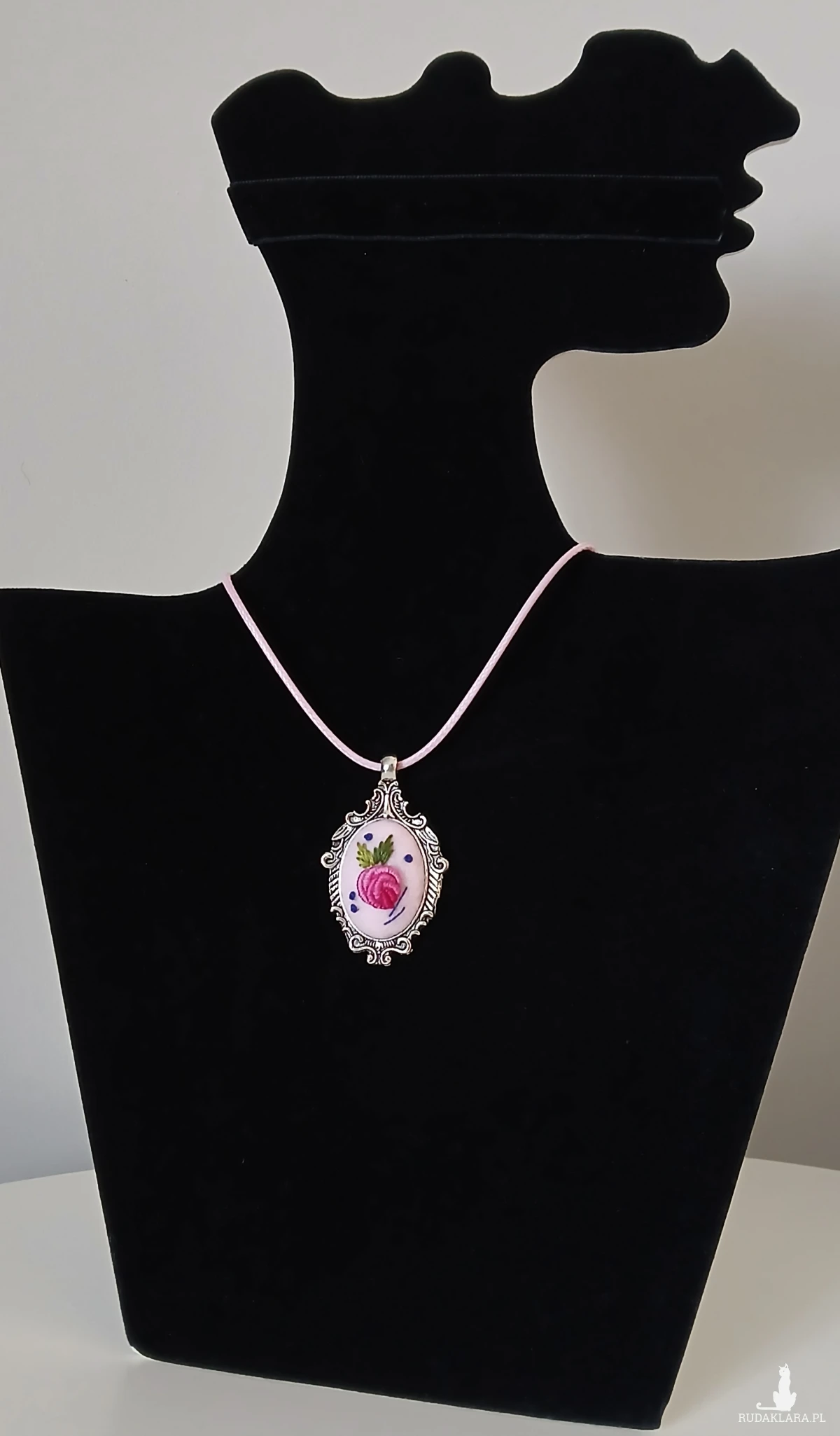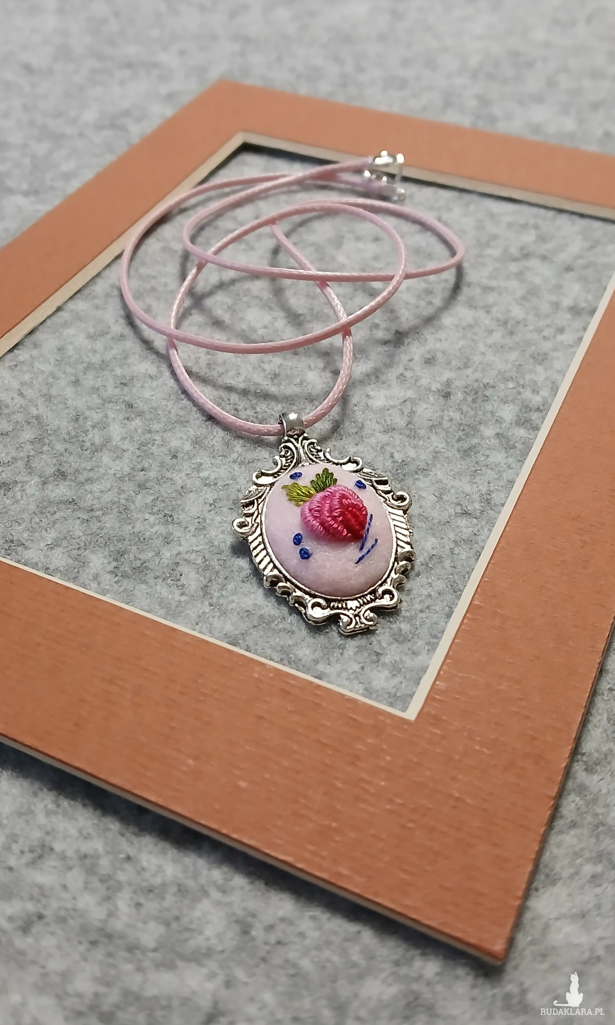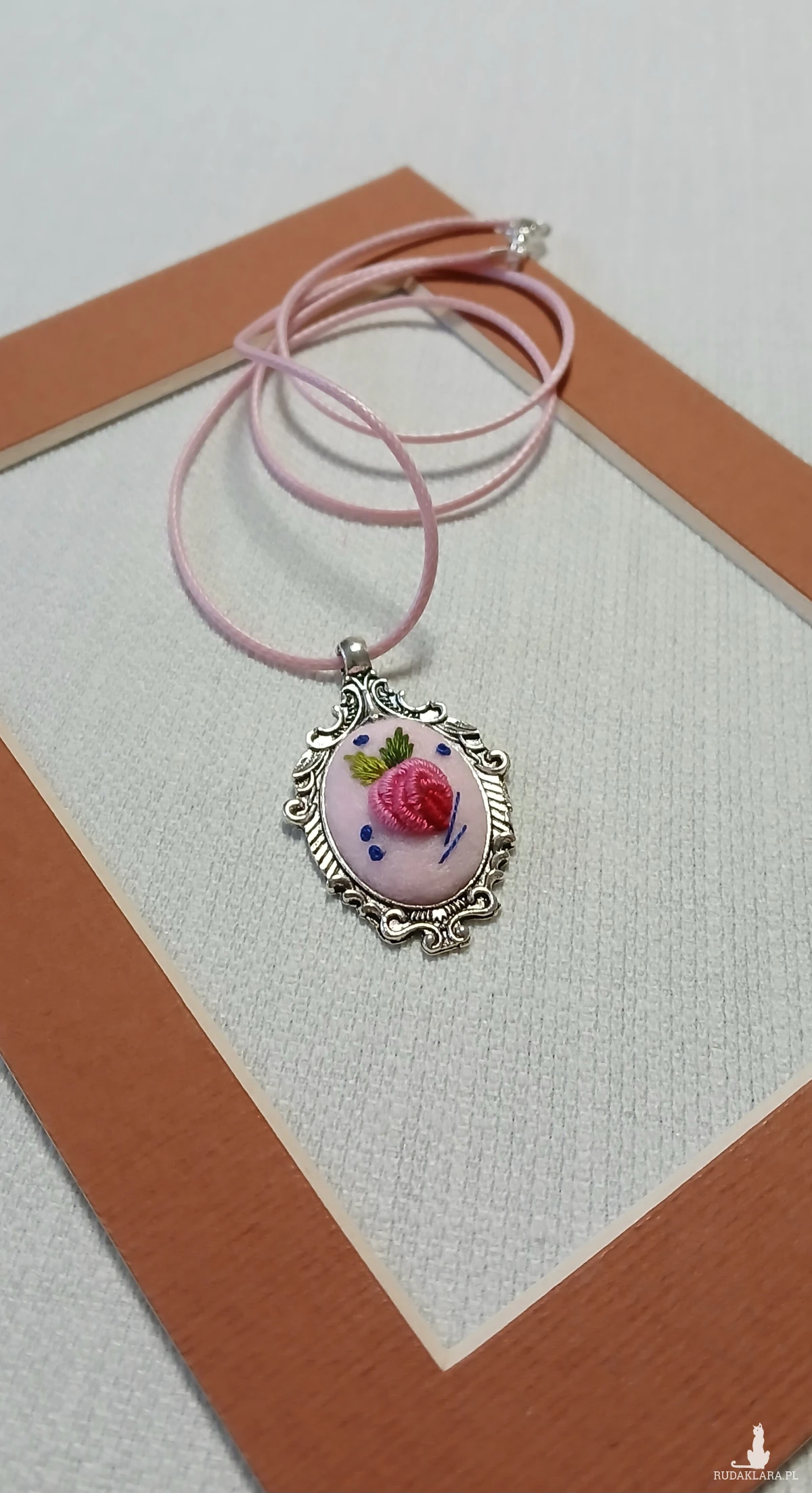 Przesłodki, różowy wisiorek z ornamentem będzie trafionym prezentem dla pań w każdym wieku. Granatowy akcent dodaje pazura i sprawia, że wisior jeszcze bardziej rzuca się w oczy.