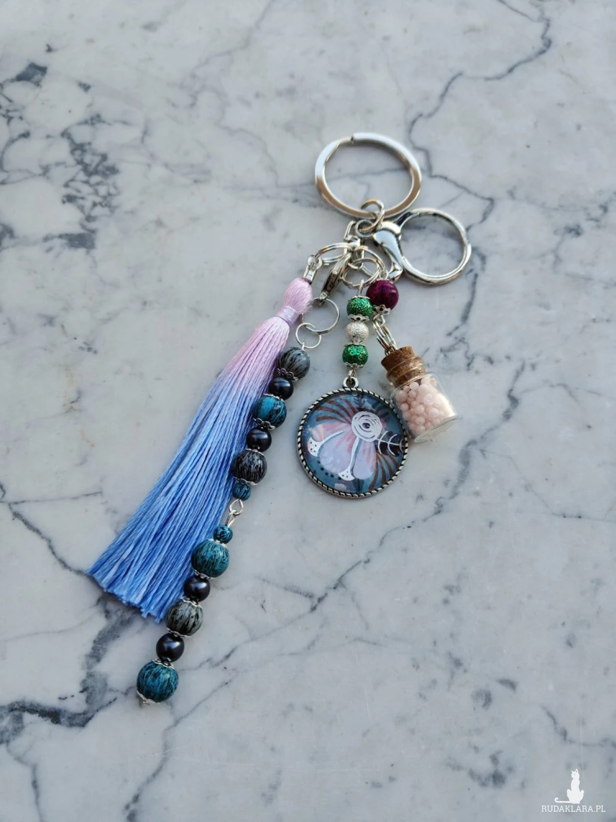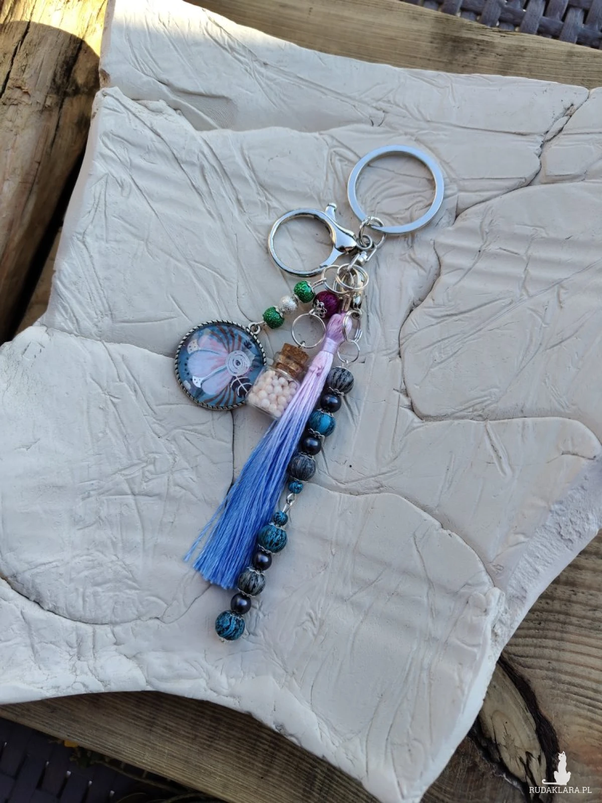 Ręcznie wykonany brelok o artystycznym charakterze, łączący delikatność kwiatowego motywu z wyrazistymi, naturalnymi kolorami. Centralnym elementem jest okrągła zawieszka z motywem kwiatu, uzupełniona dekoracyjną buteleczką z drobnymi koralikami oraz długim, dwukolorowym chwostem w odcieniach błękitu i lawendy. Całość dopełniają ozdobne koraliki w tonacjach niebieskiego, turkusu, grafitu i zieleni, tworząc harmonijną, przyciągającą wzrok kompozycję. Idealny jako stylowy dodatek do kluczy, torebki lub plecaka, a także jako wyjątkowy, rękodzielniczy prezent.