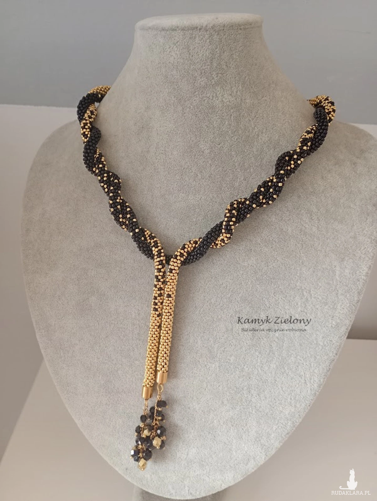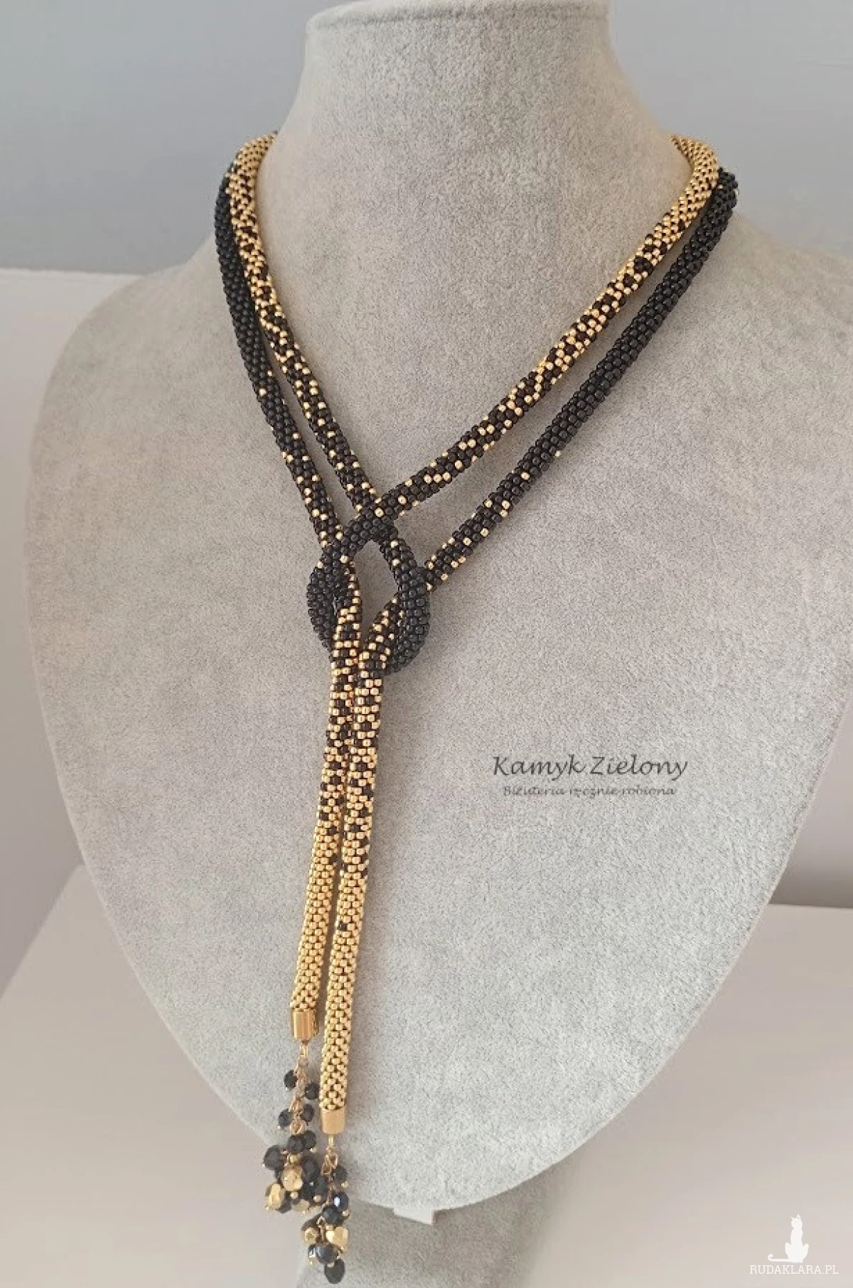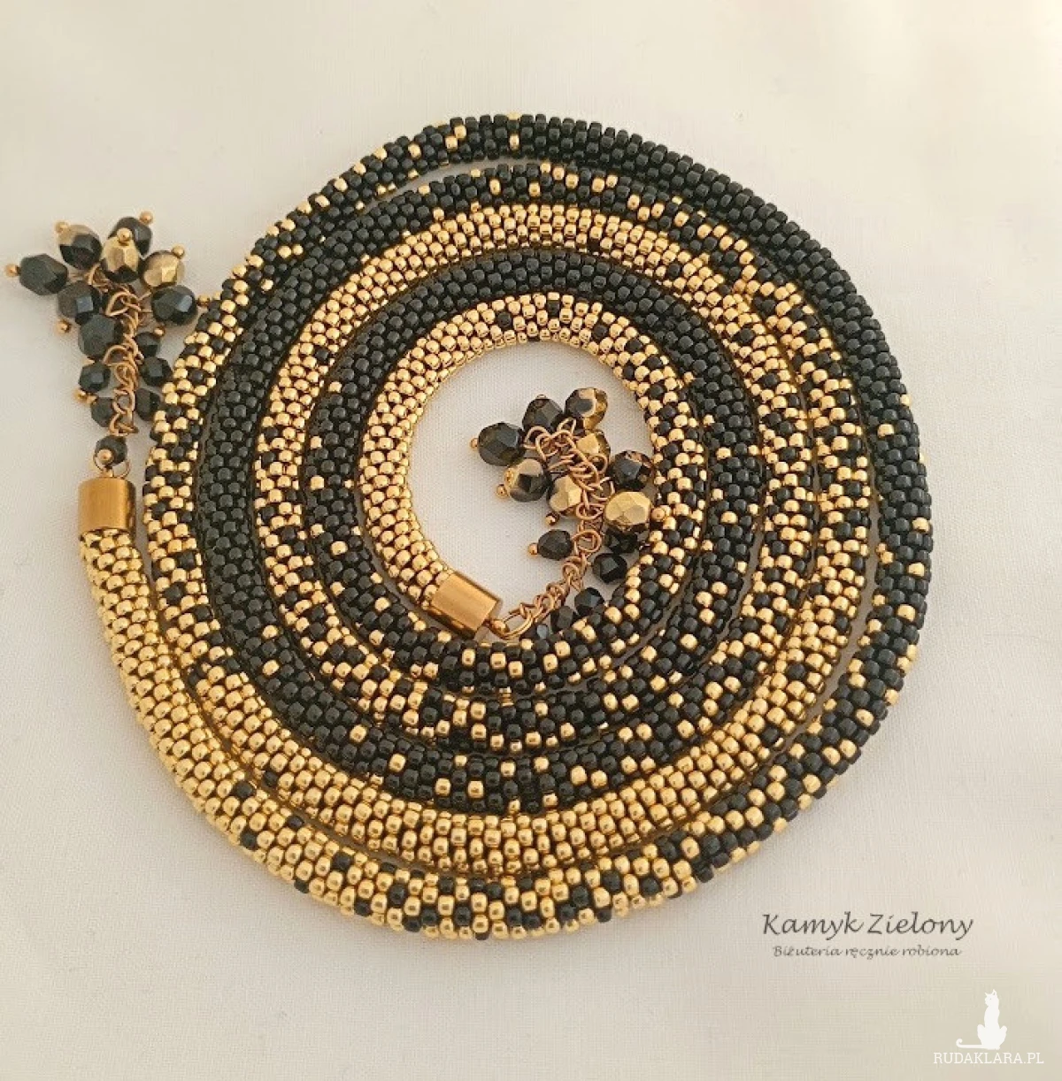 Naszyjnik wykonany ręcznie z maleńkich, szklanych koralików Toho w kolorze czarnym i złotym, tworzących długi sznur koralikowy o średnicy około 5 mm.
