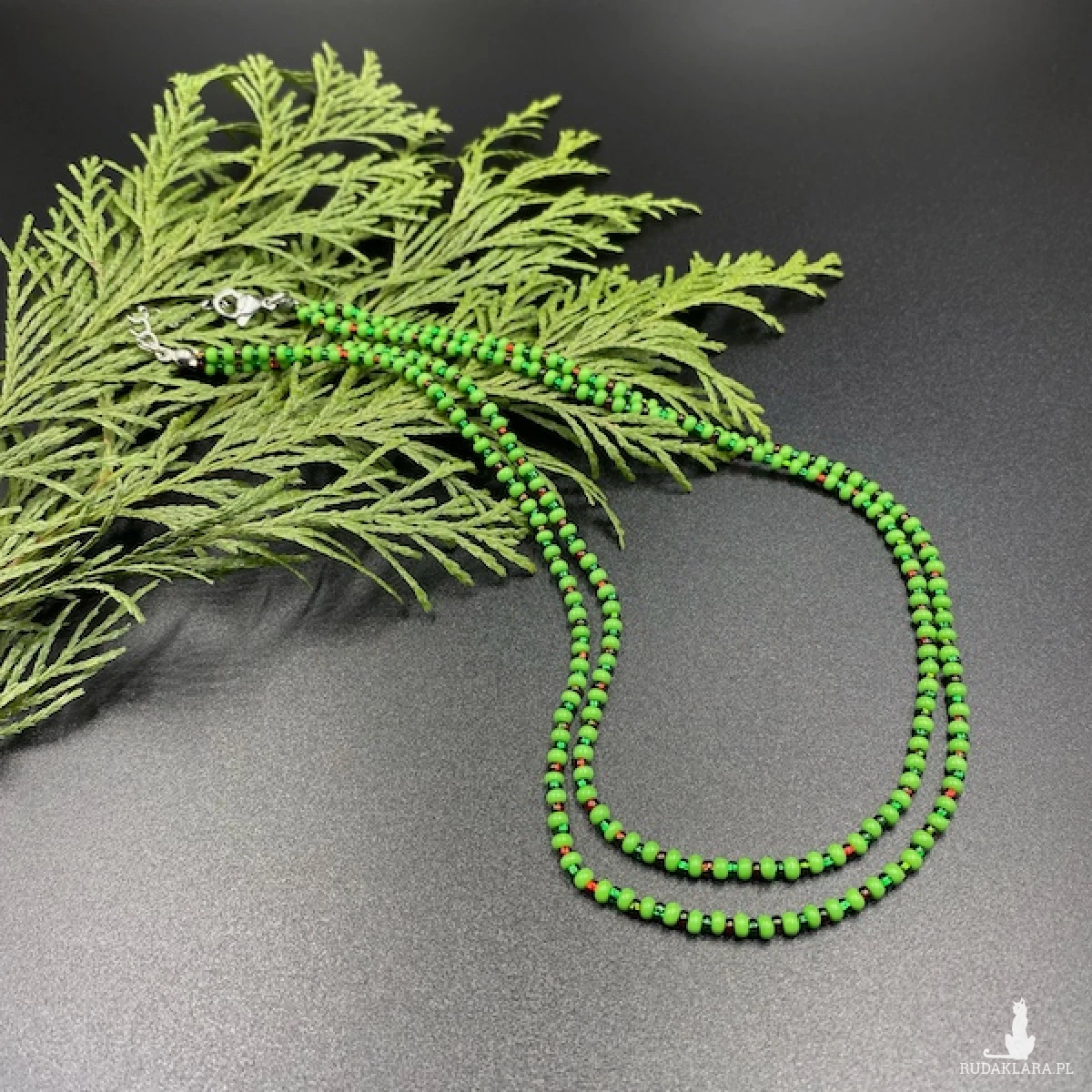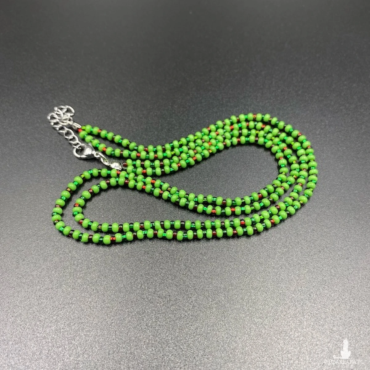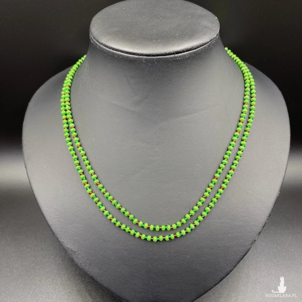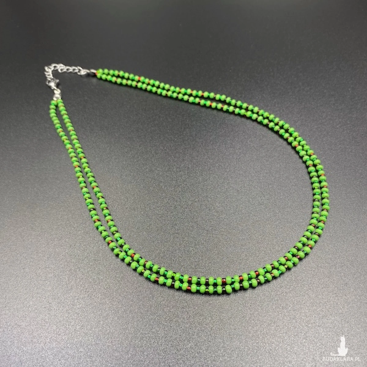 Krótki naszyjnik ( złożony z dwóch sznurów ) został wykonany ręcznie ze szklanych koralików w kolorze zielonym i połyskującym czerwonym. Elementy metalowe ze stali chirurgicznej.