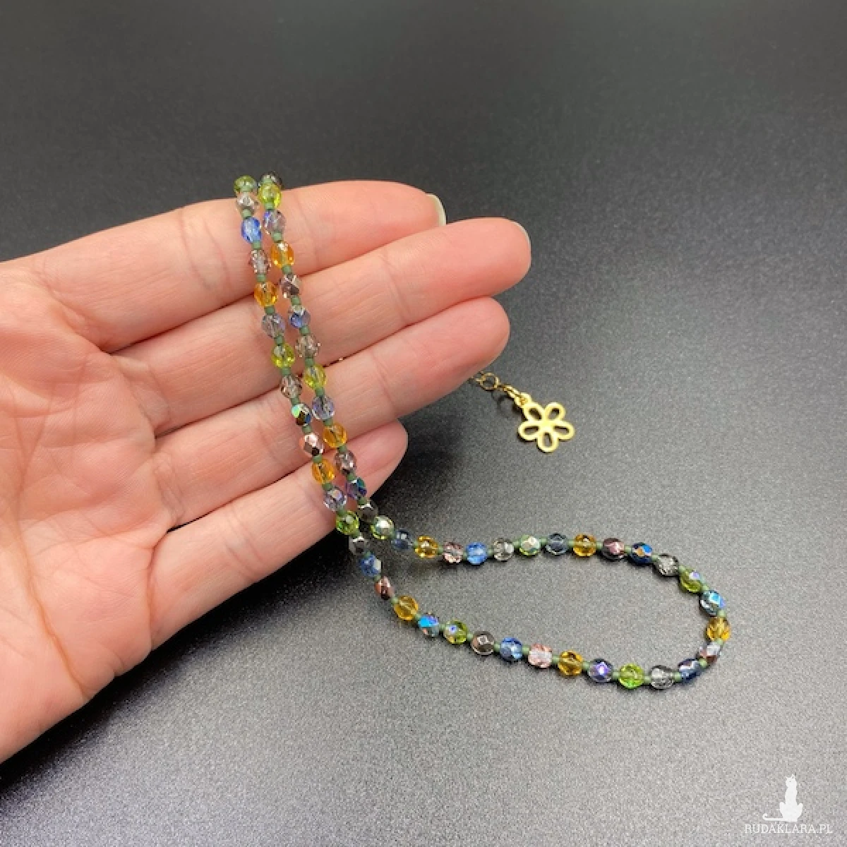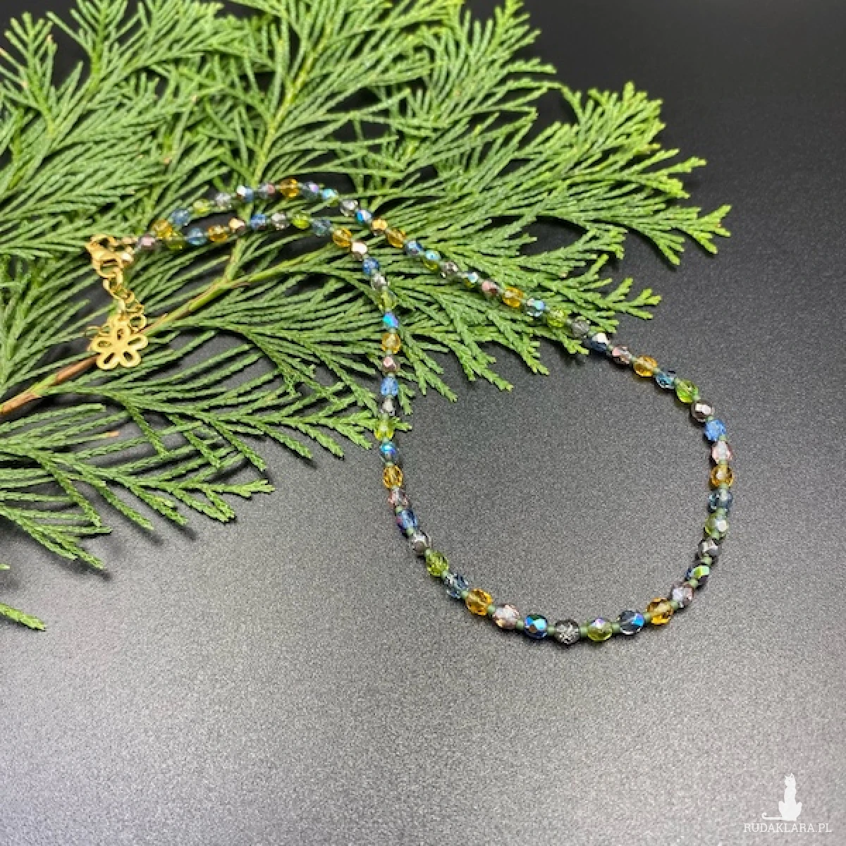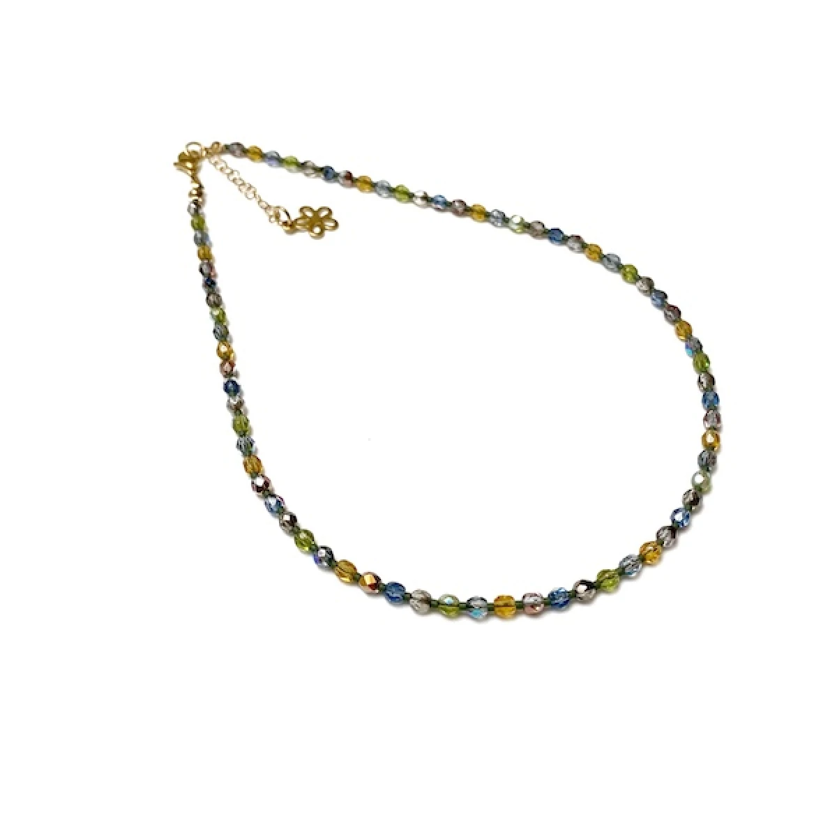 Krótki naszyjnik został wykonany ręcznie z czeskich, szklanych koralików Fire Polish 4 mm o kryształowej, połyskującej powłoce w bladych odcieniach niebieskiego, srebrnego, żółtego i zielonego.