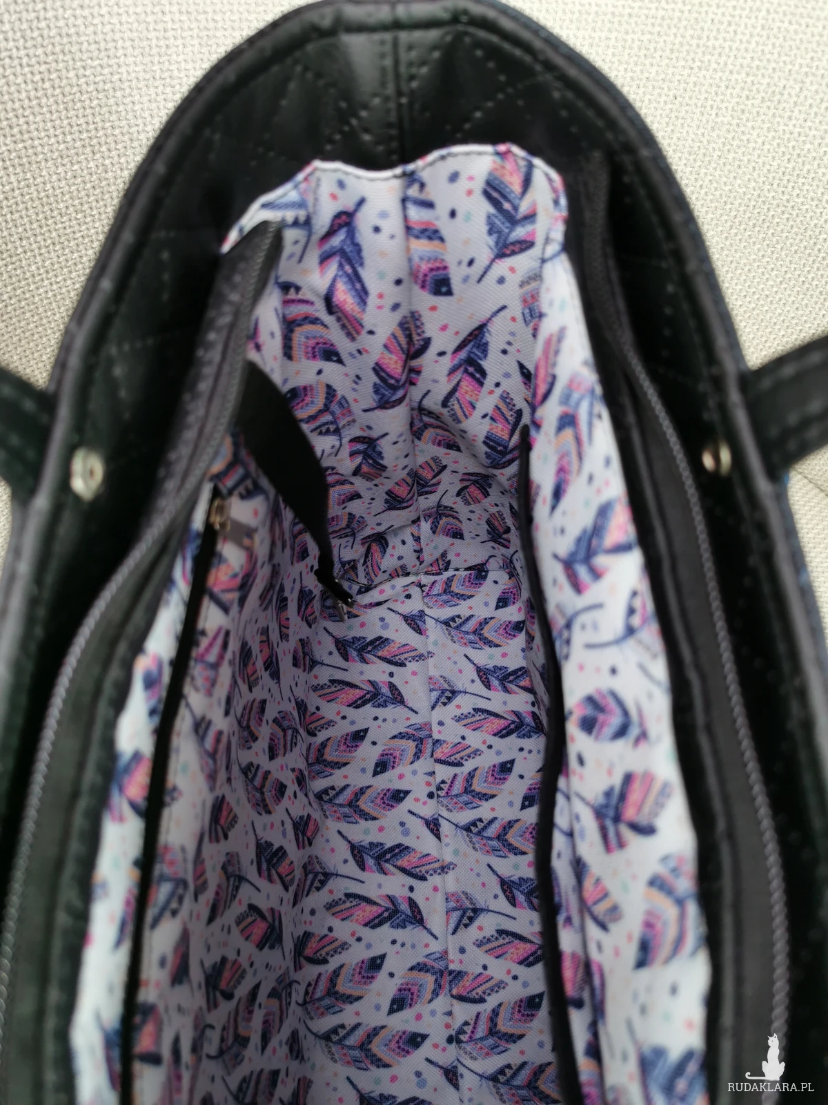 Wykonana z tkaniny o właściwościach wodoodpornych ( przód torebki ) , oraz czarnej pikowanej skóry ekologicznej ( tył torebki ) .