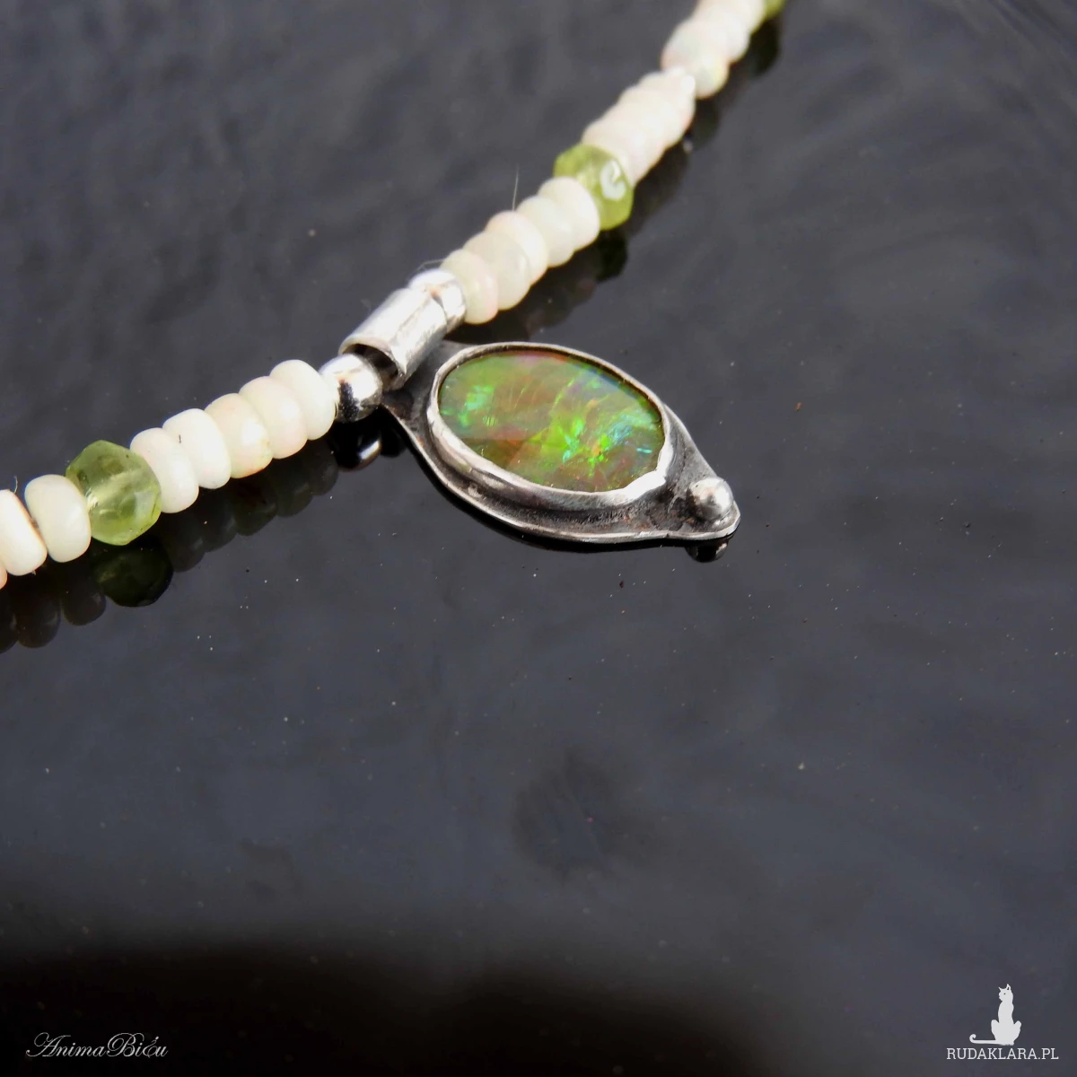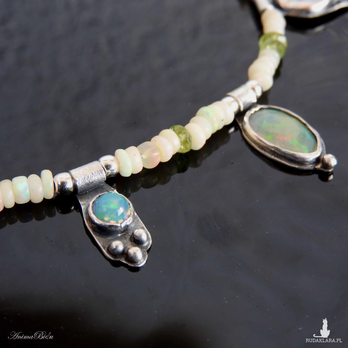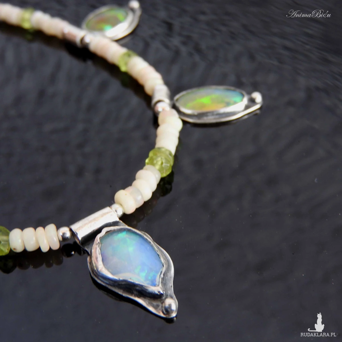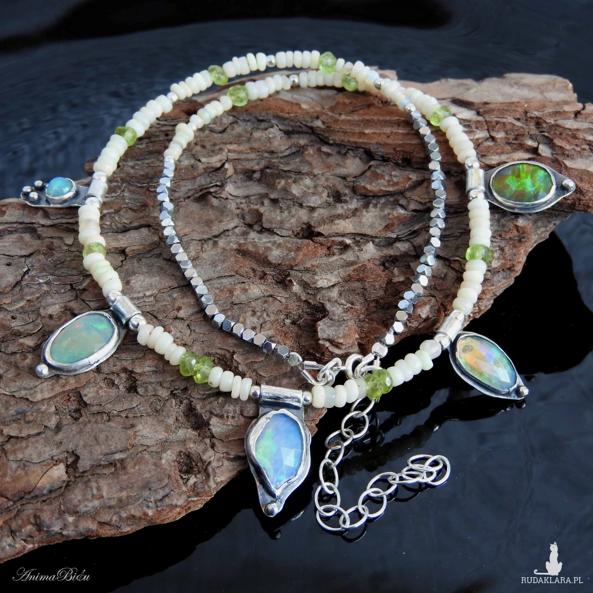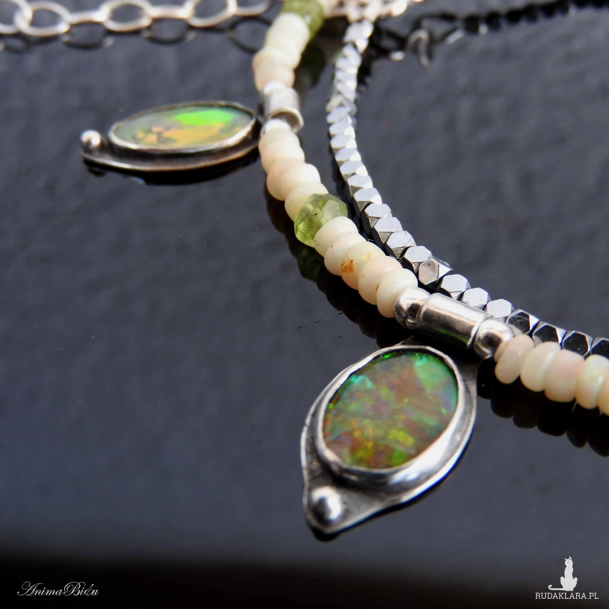 Naszyjnik srebrny z opalem etiopskim, oliwinem i hematytem.