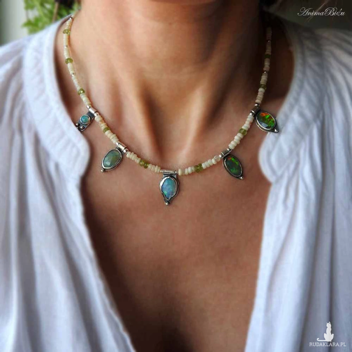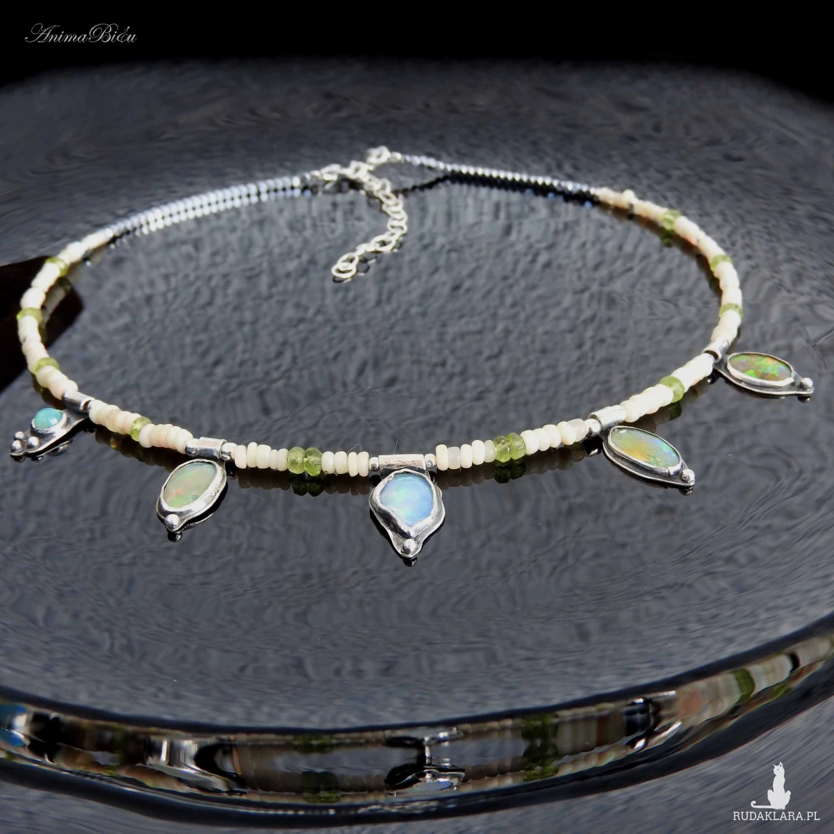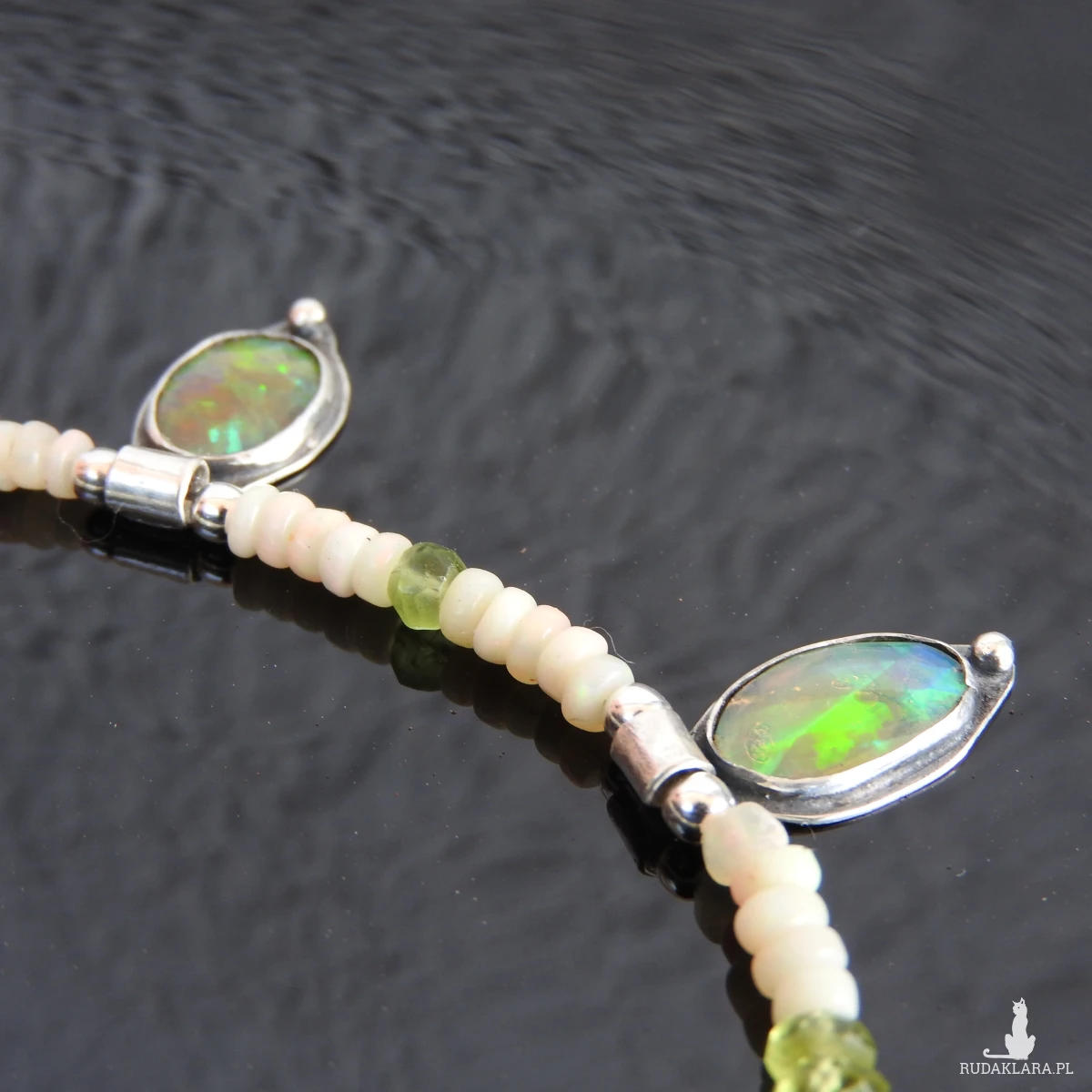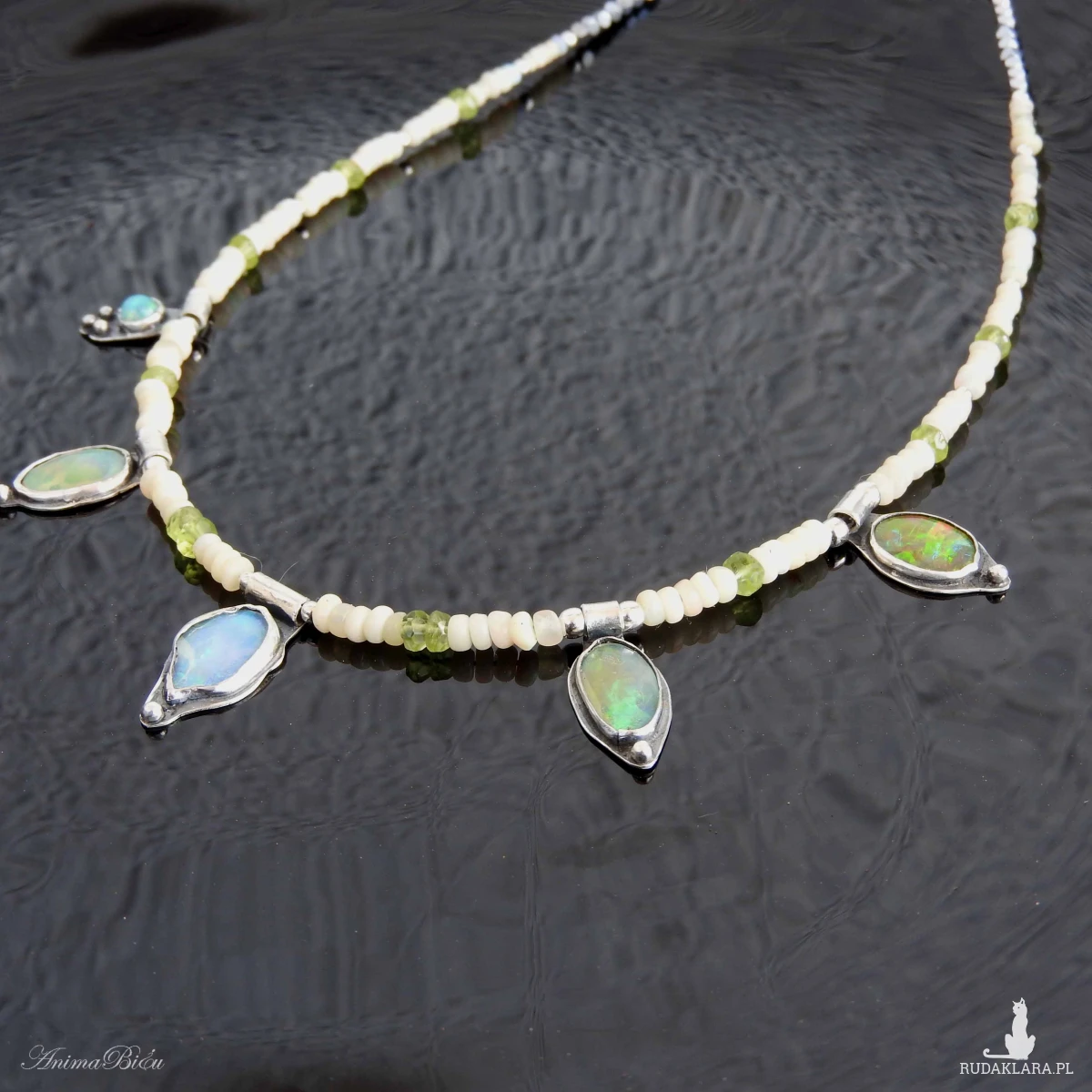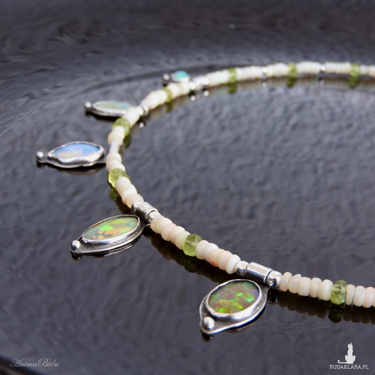 Naszyjnik srebrny z opalem etiopskim, oliwinem i hematytem.