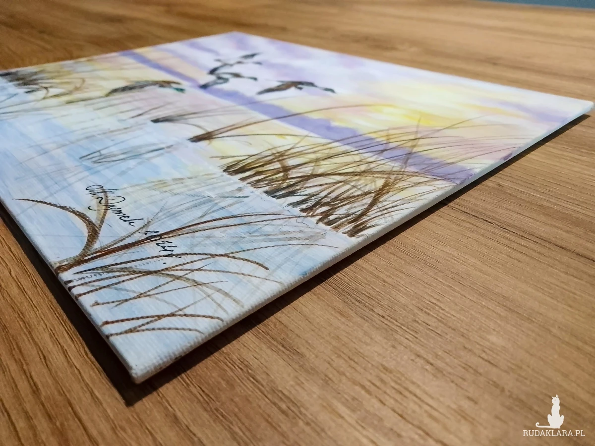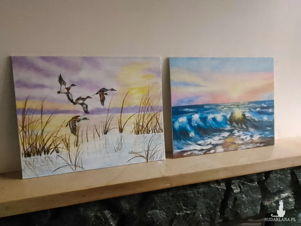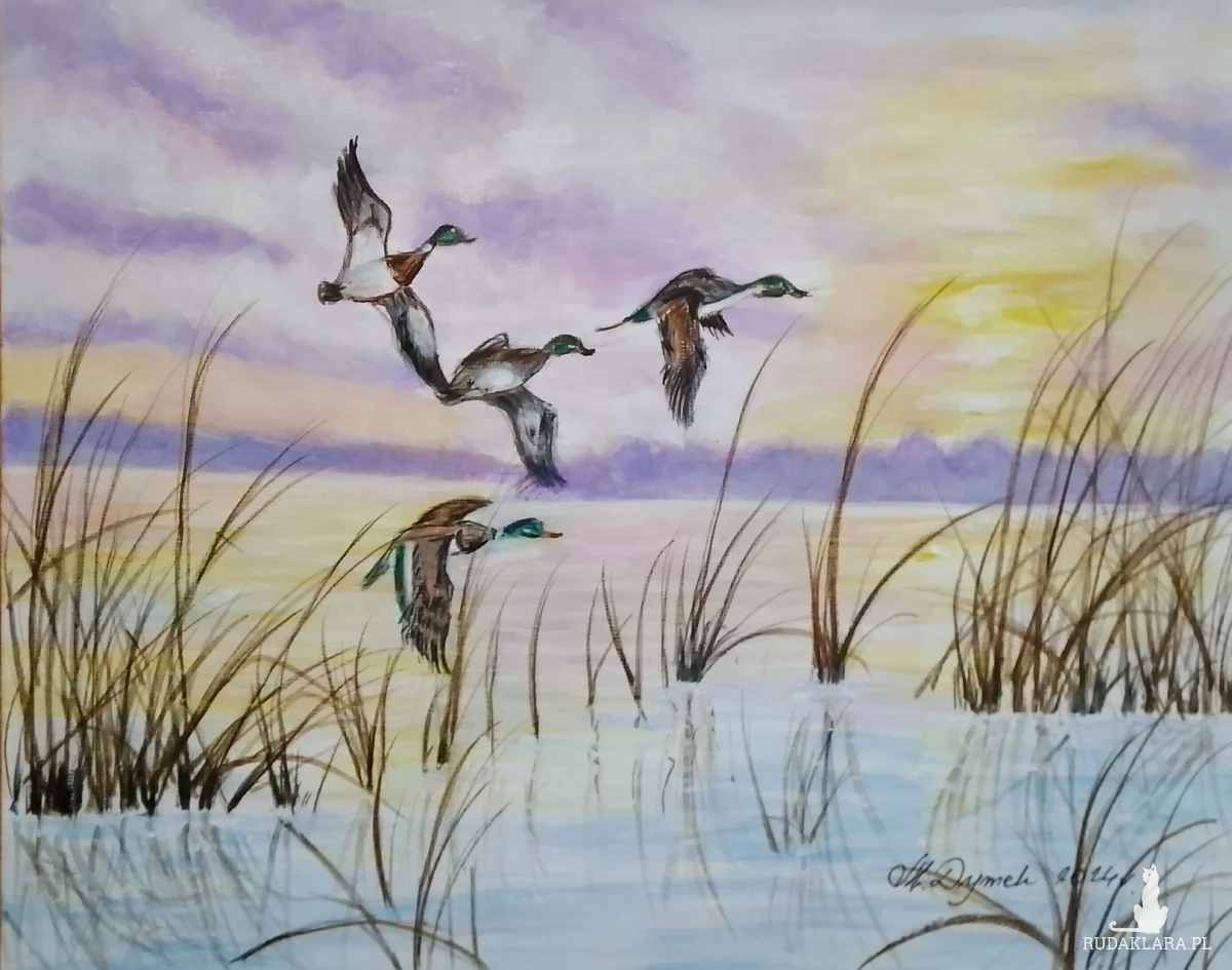 -Tematyka: Dzikie kaczki zrywające się do lotu i morskie fale rozbijające się w świetle zachodzącego słońca