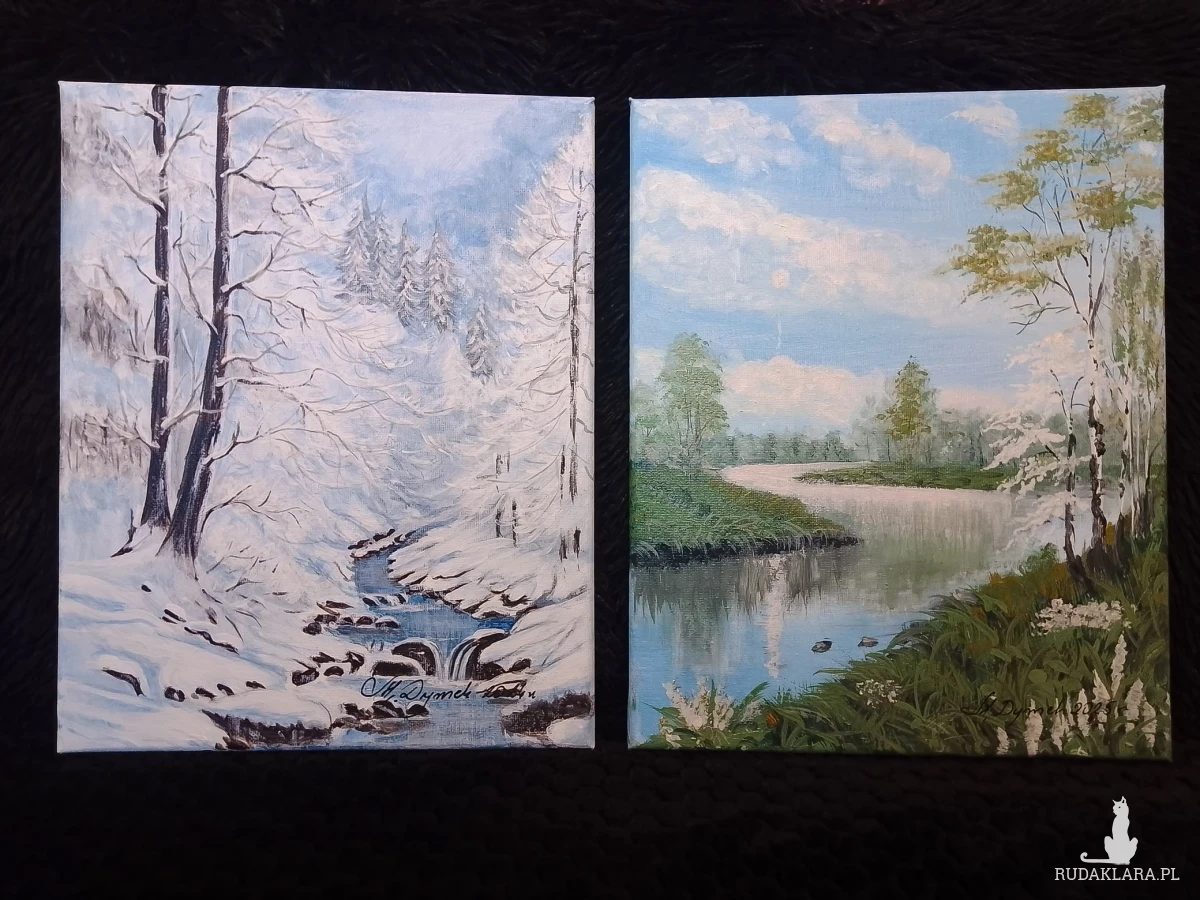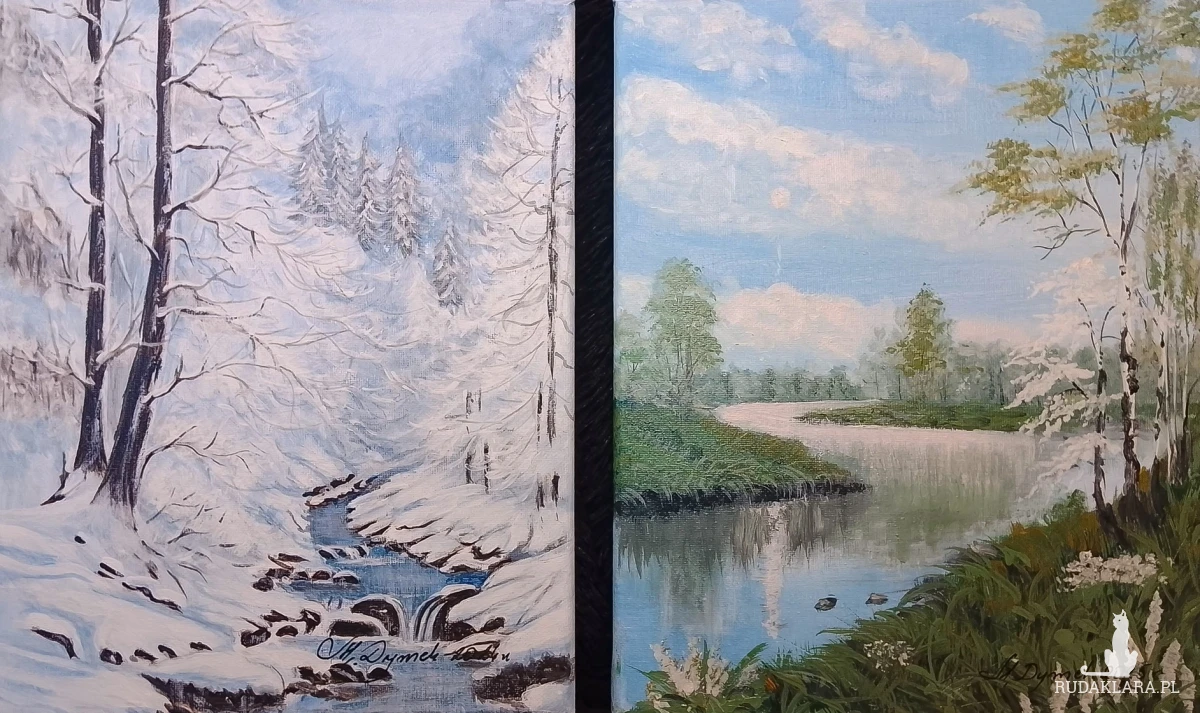 Harmonia natury w dwóch różnych odsłonach. Zestaw dwóch ręcznie malowanych obrazów na płótnie, które ukazują piękno polskiego krajobrazu w kontrastujących porach roku. Zestawienie mroźnego, ośnieżonego potoku z sielankowym, letnim widokiem tworzy fascynującą opowieść na ścianie. To idealna propozycja dla osób, które kochają zmienność natury i szukają sztuki z duszą. Wprowadź magię pór roku do swojego domu.