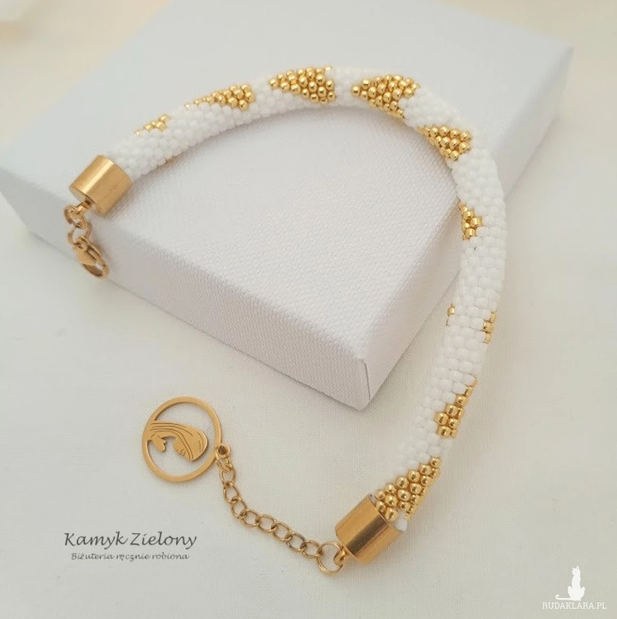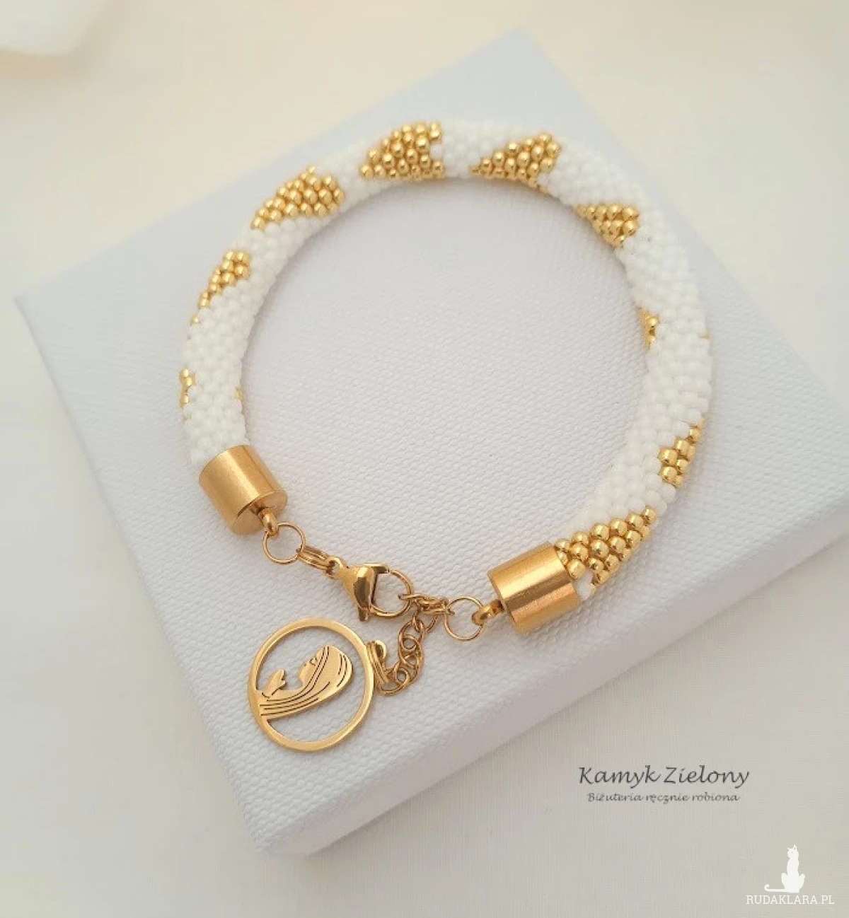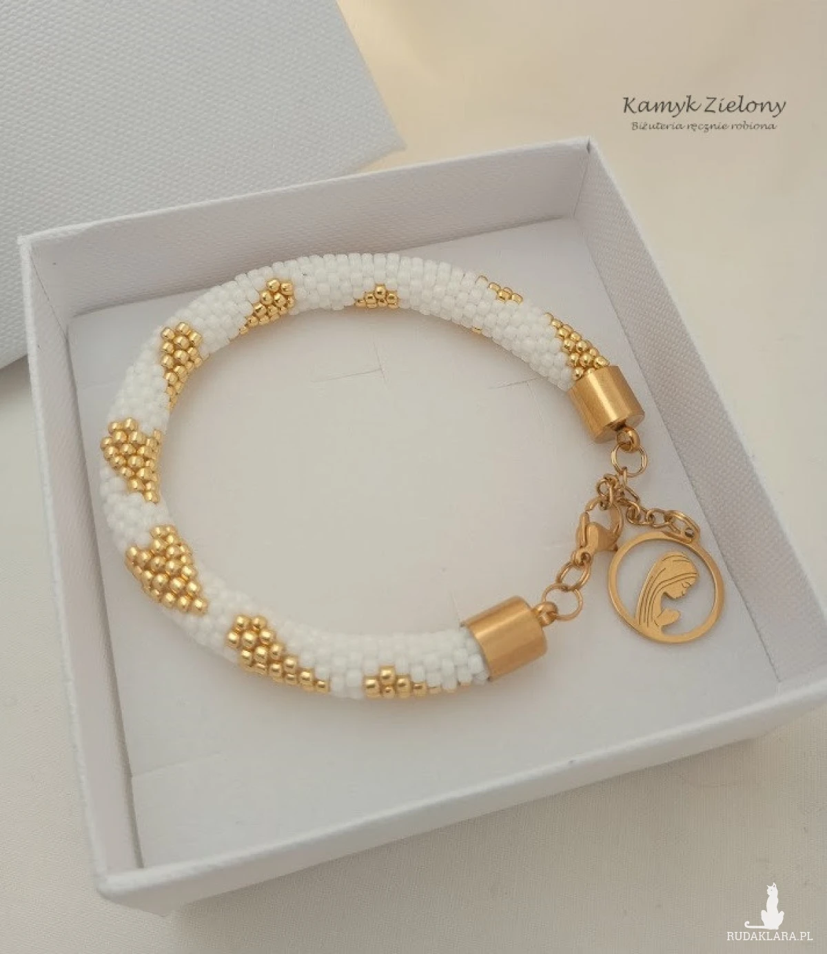 Bransoletka zrobiona została ręcznie ze szklanych koralików Toho w śnieżnobiałym kolorze, z dodatkiem koralików w kolorze złotym. Na tle z białych koralików umieszczono wzorek w złote serduszka.
