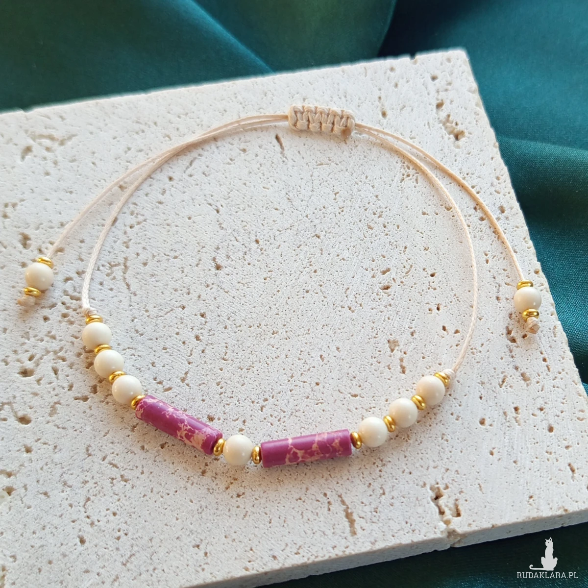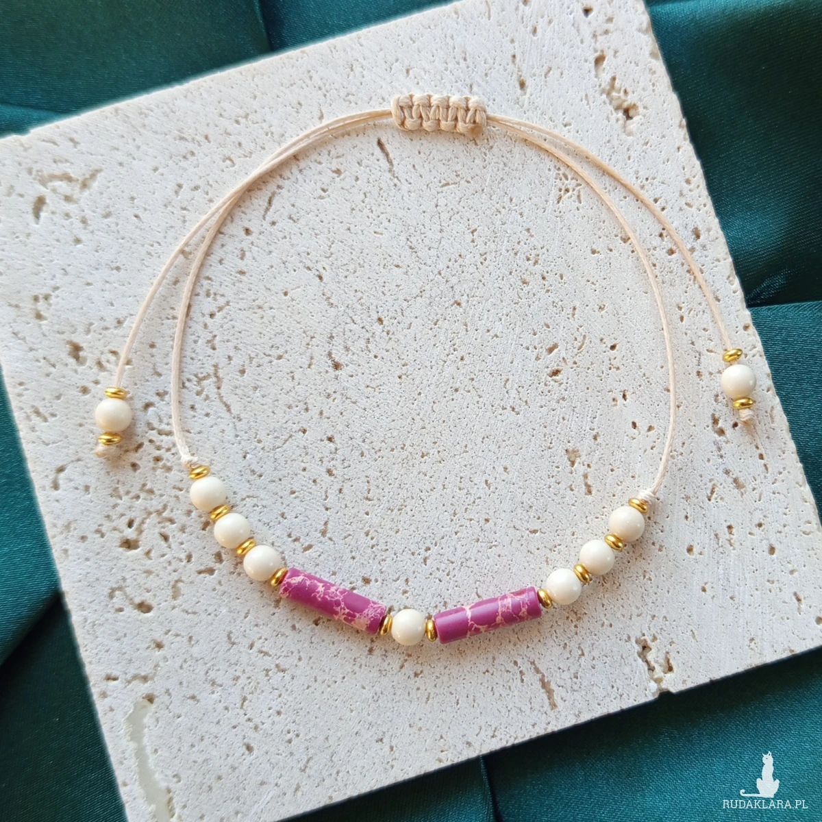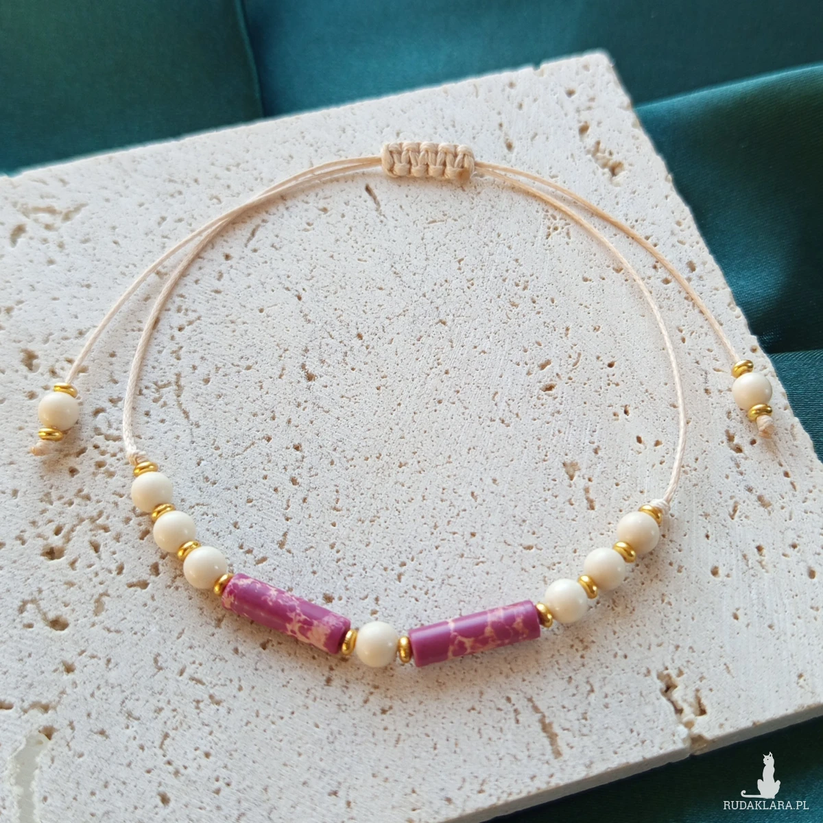"Rosa" - bransoletka z kamieni naturalnych i mocnego sznurka jubilerskiego. Regulacja za pomocą plecionki makramowej. Wiosenne pastelowe kolory.