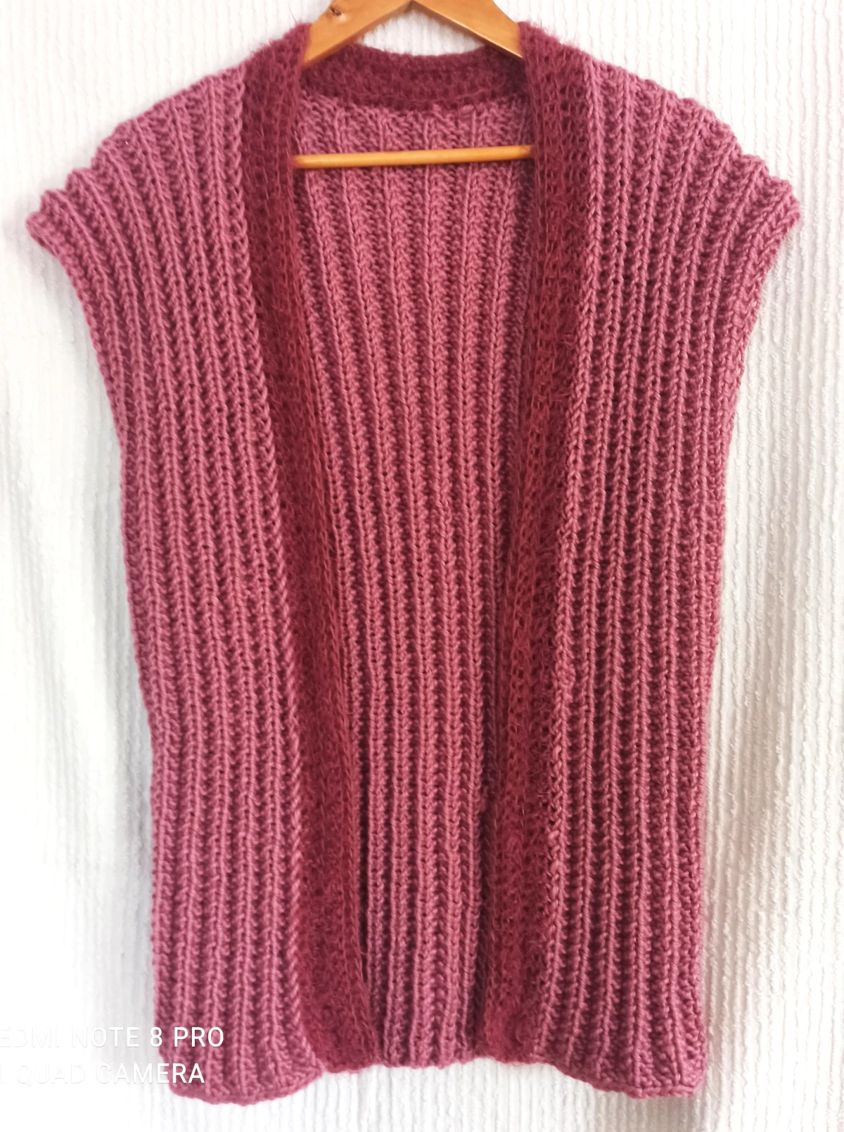 Gruba kamizelka bez guzików z grubej sprężystej wełny w kolorze liliowym/nasyconym różowym/. Wykonana ręcznie na drutach ciekawym wzorem/pończoszniczym/. Wykończona na szydełku moherową pliską. Dzięki zastosowanemu splotowi kamizelka może być noszona przez szczupłe jak i osoby większego rozmiaru. Ramiona szerokie lekko opadające. W całości bardzo elegancko wygląda. Jest miła w dotyku. Nić 100% wełna. Bardzo ciepła.
