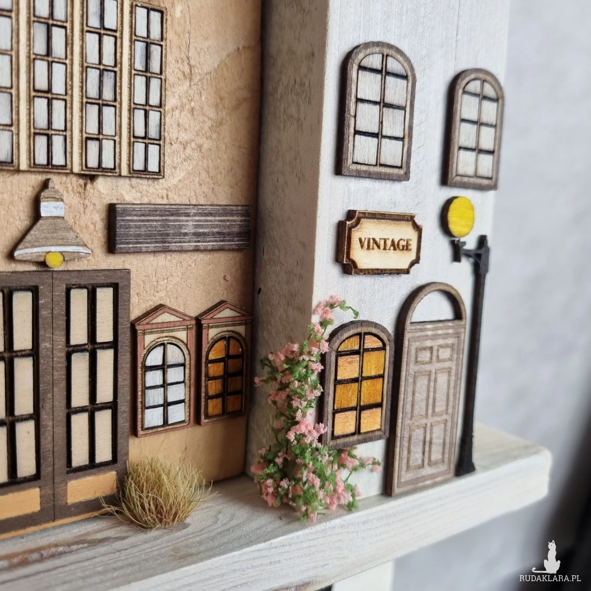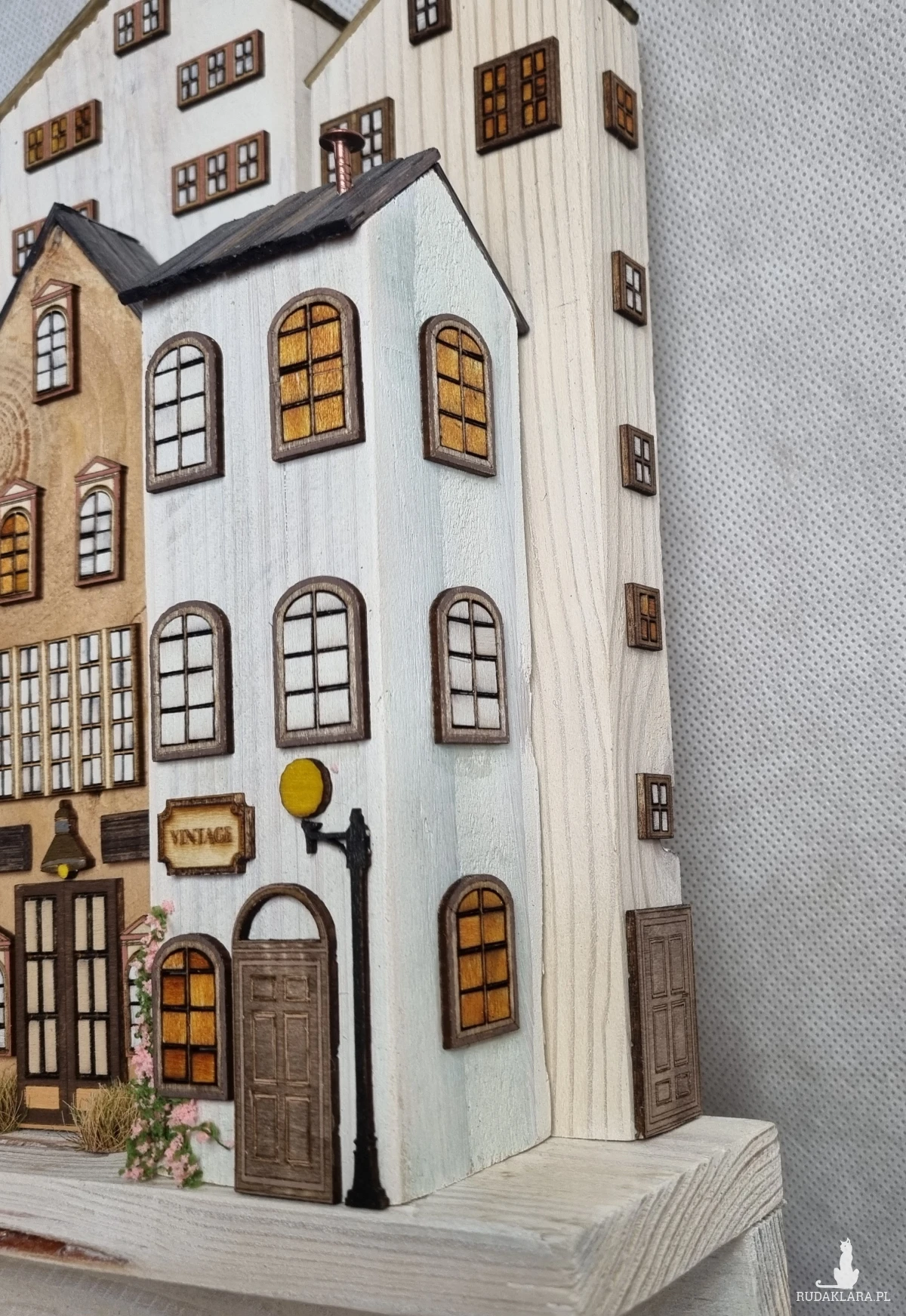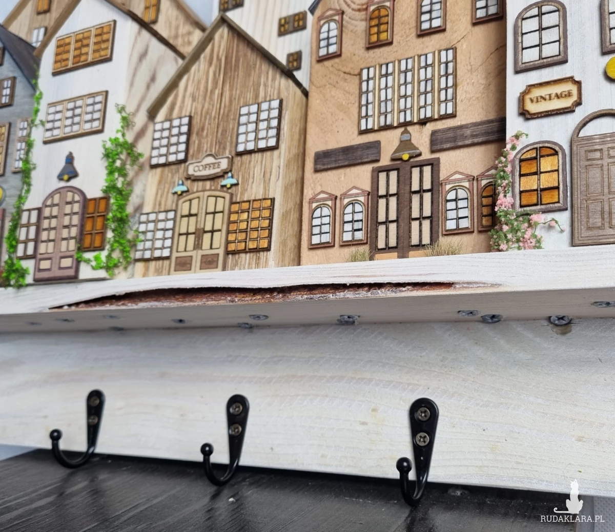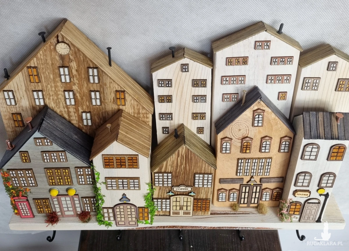 Drewniane domki handmade, mogące służyć jako wieszak na klucze (3), ręczniki inne drobiazgi. Domki wykonane desek ze starych palet z odzysku. Drewno bejcowane, woskowane, malowane w różnych odcieniach - ładnie podkreślające starość drewna - malowane bezbarwną farbą akrylową. Drewniane, wycinane okna i drzwi, również inne detale. Długość 43 cm, wysokość 33 cm, grubość 6,5 cm . Całość do zawieszenia na ścianie na 2 hakach. (23)