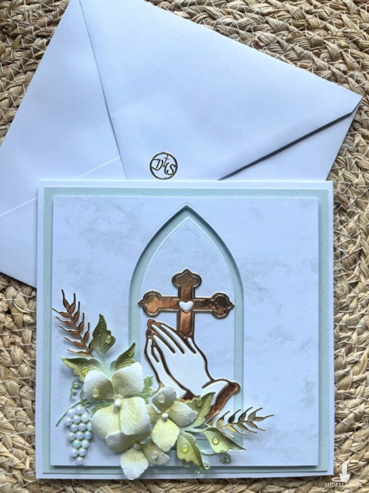 Kartka ręcznie robiona na Komunię Świętą dla chłopca, w kolorystyce perłowego błękitu,złota i bieli.. Wewnątrz kartki gotowe życzenia do własnoręcznego podpisu oraz miejsce z kieszonką na małe co nieco. Wielkość kartki 14,5x14,5 . koperty 15,5x15,5 Do kompletu dodano torebkę stworzono w tej samej stylizacji. Wielkość torebki 22,5x18x8 cm.W tej postaci kartka do natychmiastowej wysyłki,