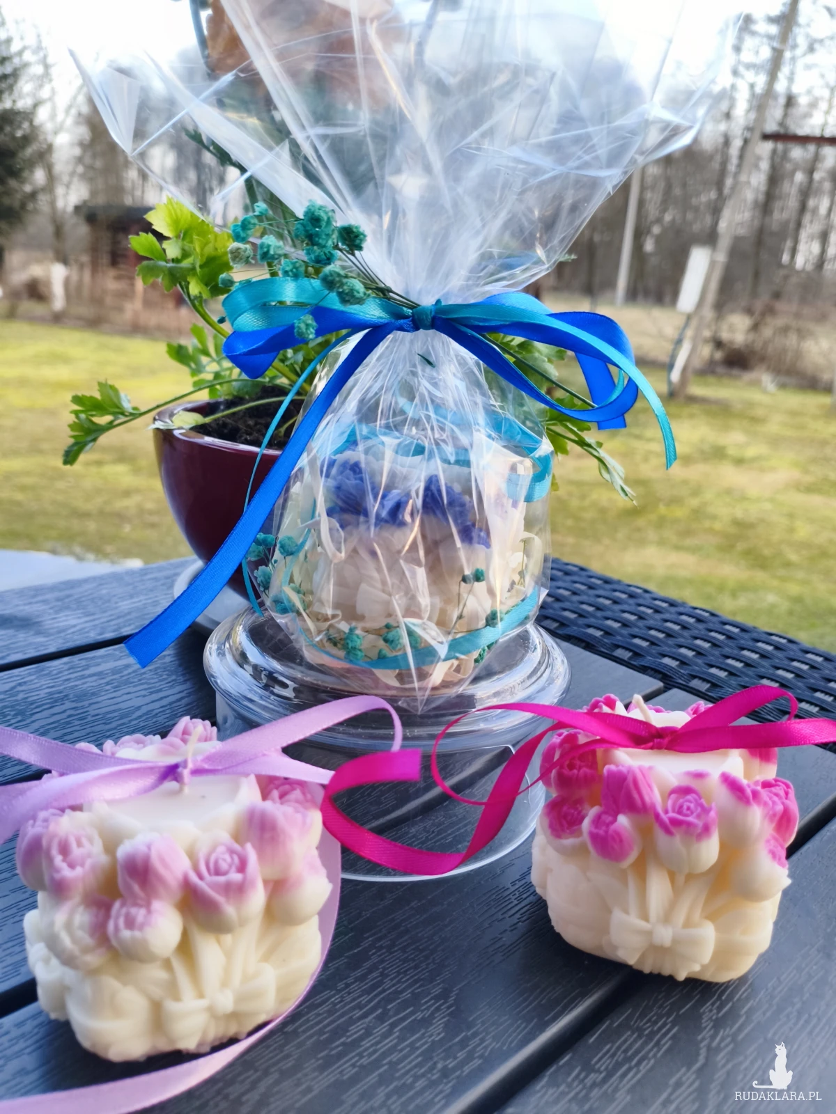 Zapakowana świeca w celofan z wstążką oraz bukietem z suszu możliwość wykonania personalizowanej wizytówki.