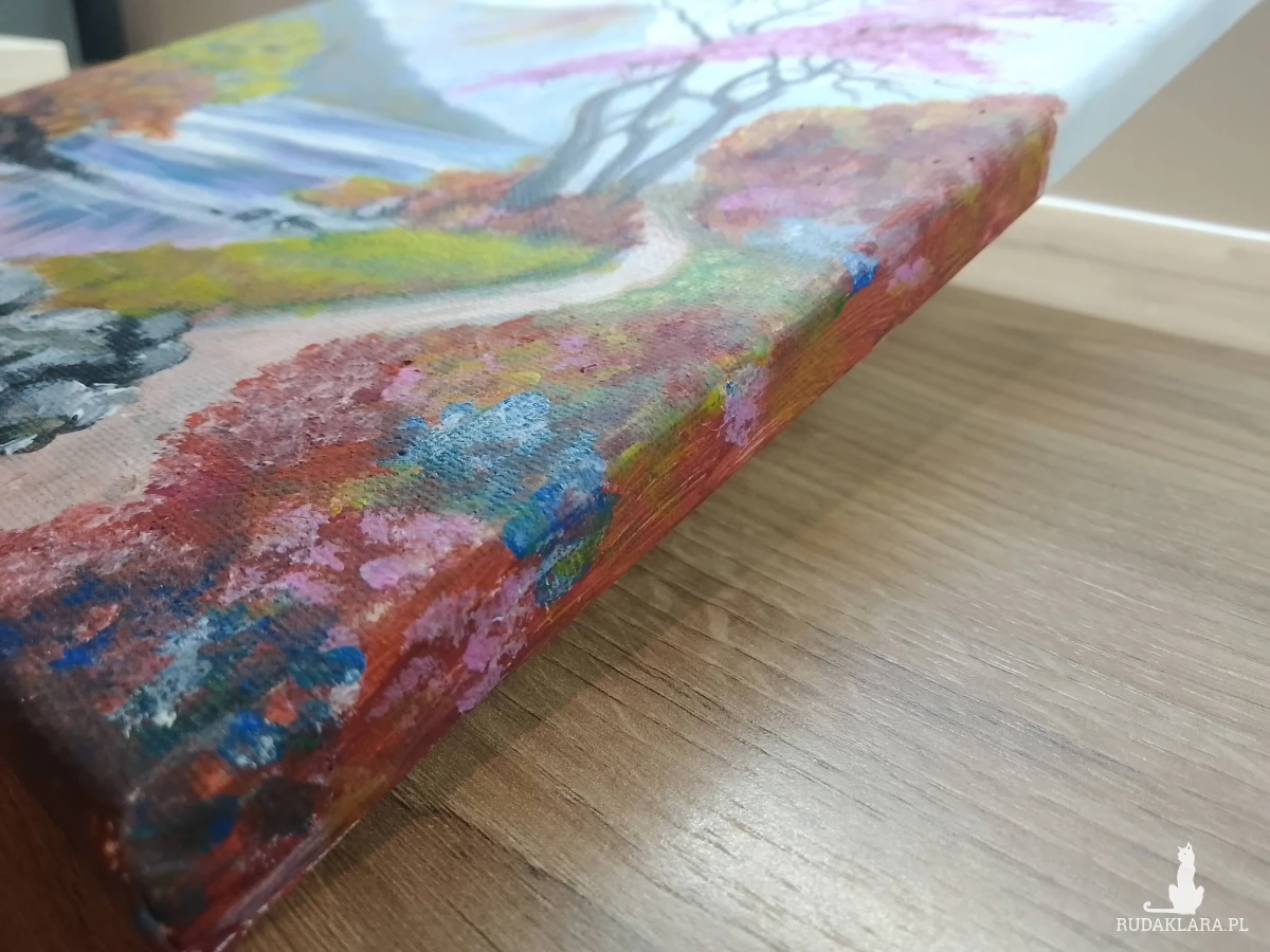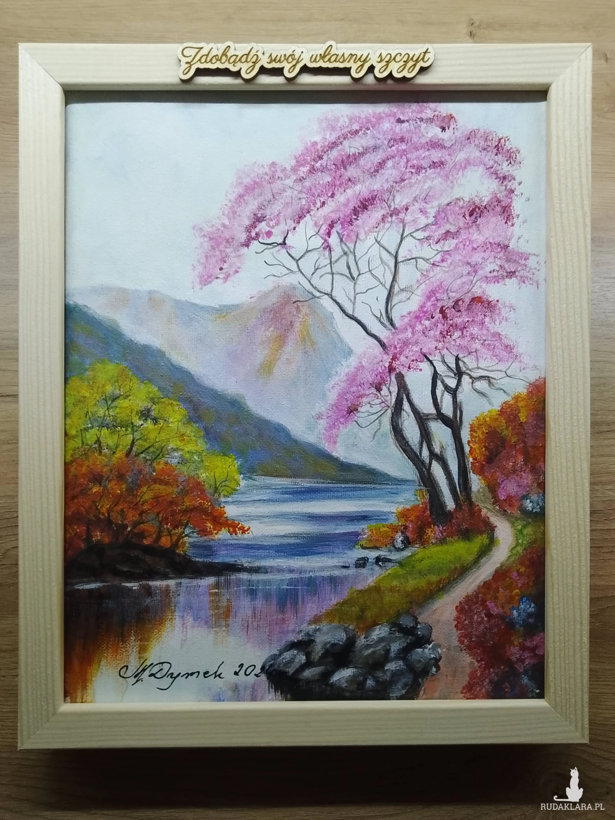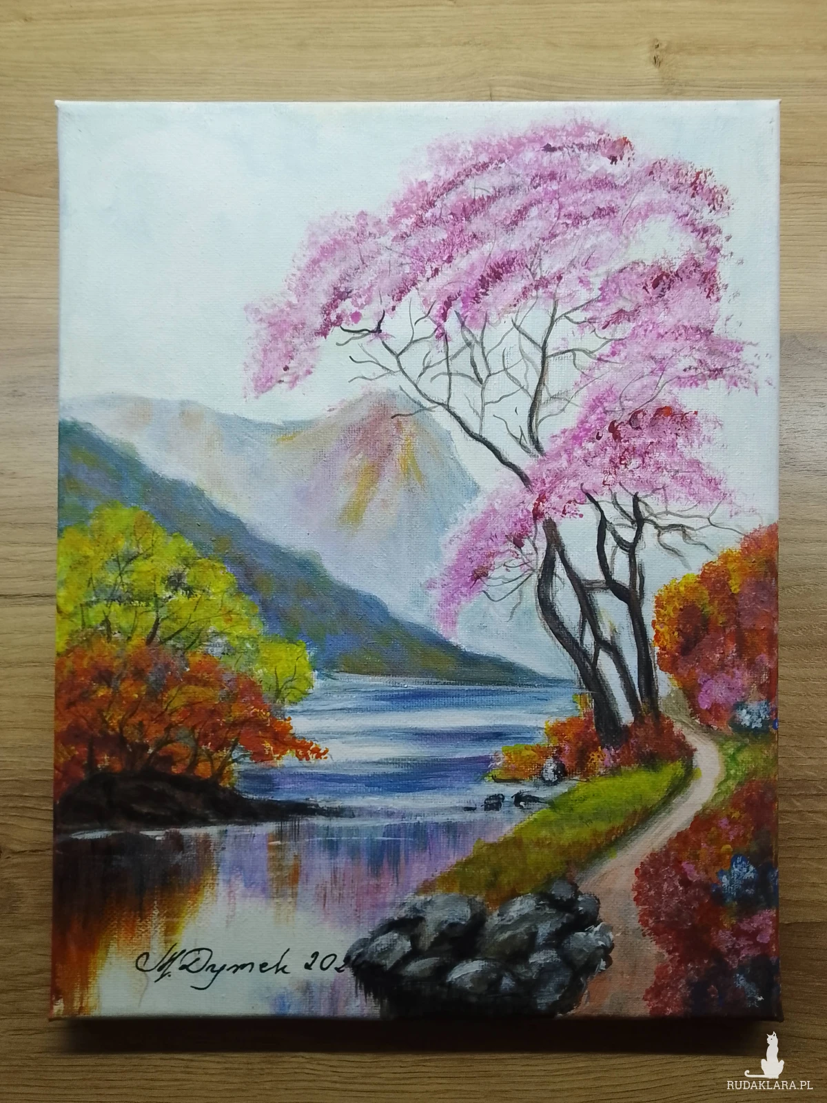 Jeden niepowtarzalny obraz - "TANIEC Z BARW" - malowniczy pejzaż z kwitnącym różowym drzewem nad brzegiem jeziora.