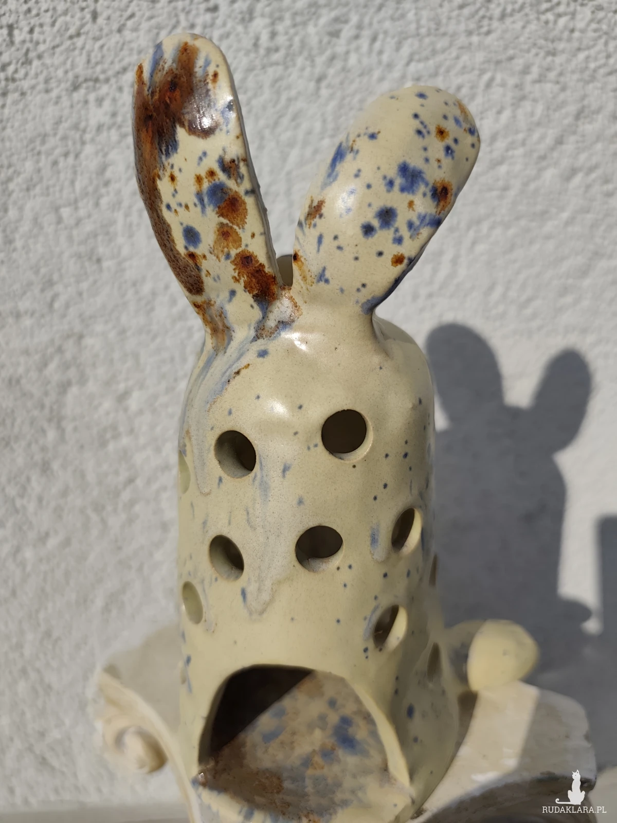 Królik ceramiczny lampion, ręcznie wykonany, szkliwiony i dwukrotnie wypalany w piecu ceramicznym na wysoką temperaturę.
