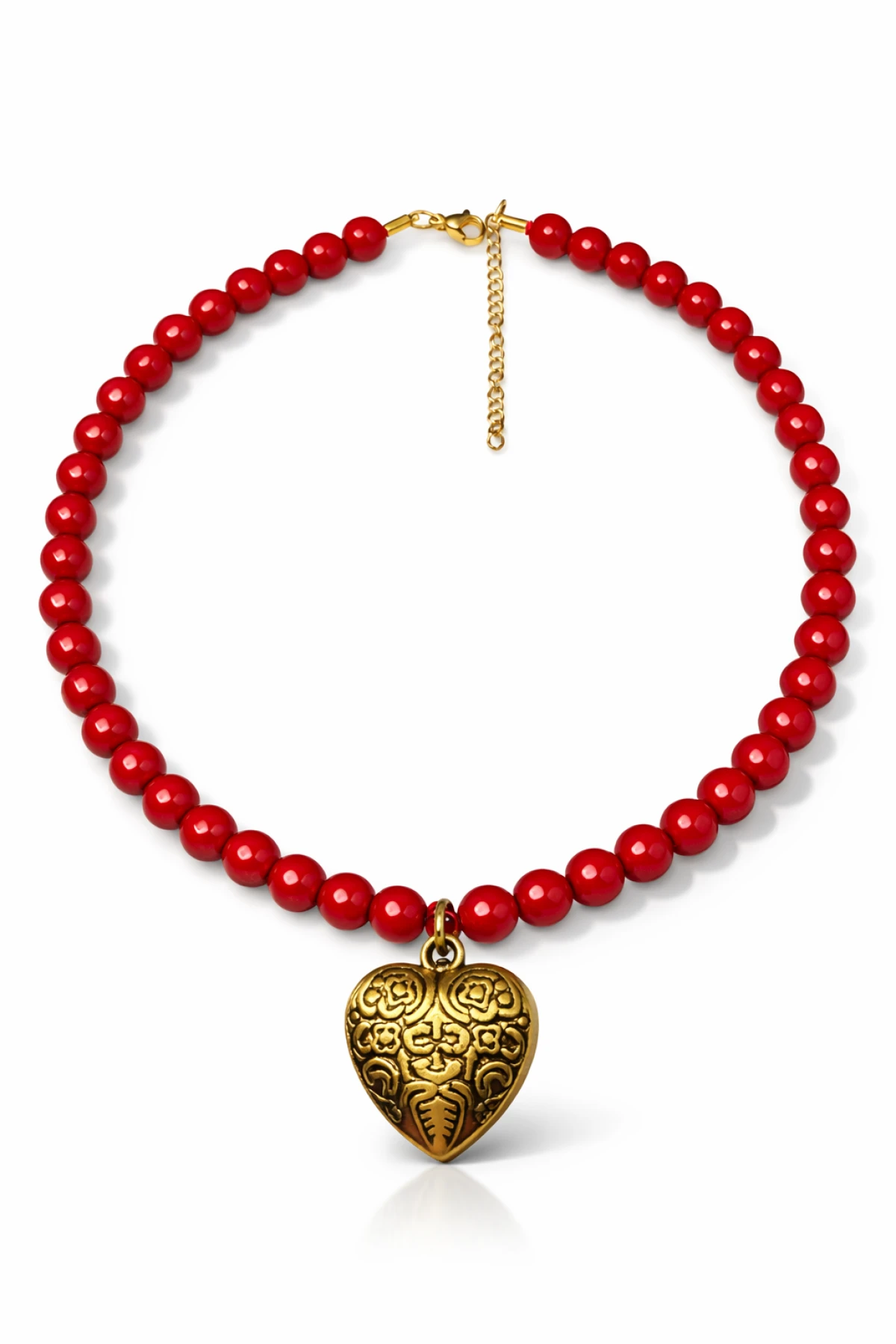 Wykonany z intensywnie czerwonych, lśniących paciorków, przyciąga wzrok i