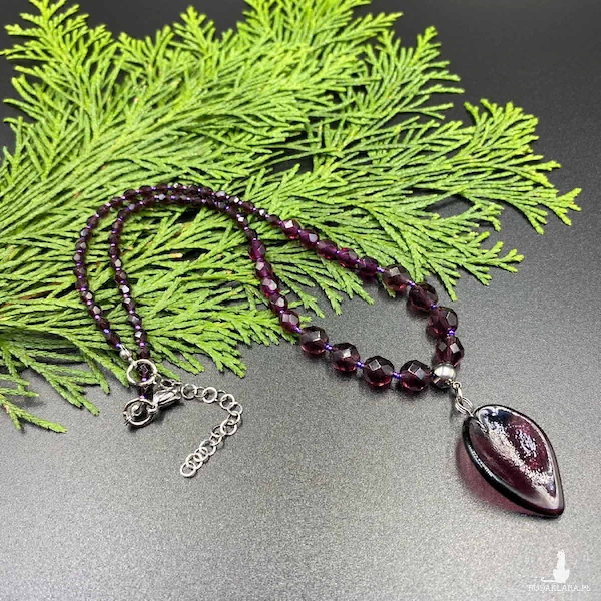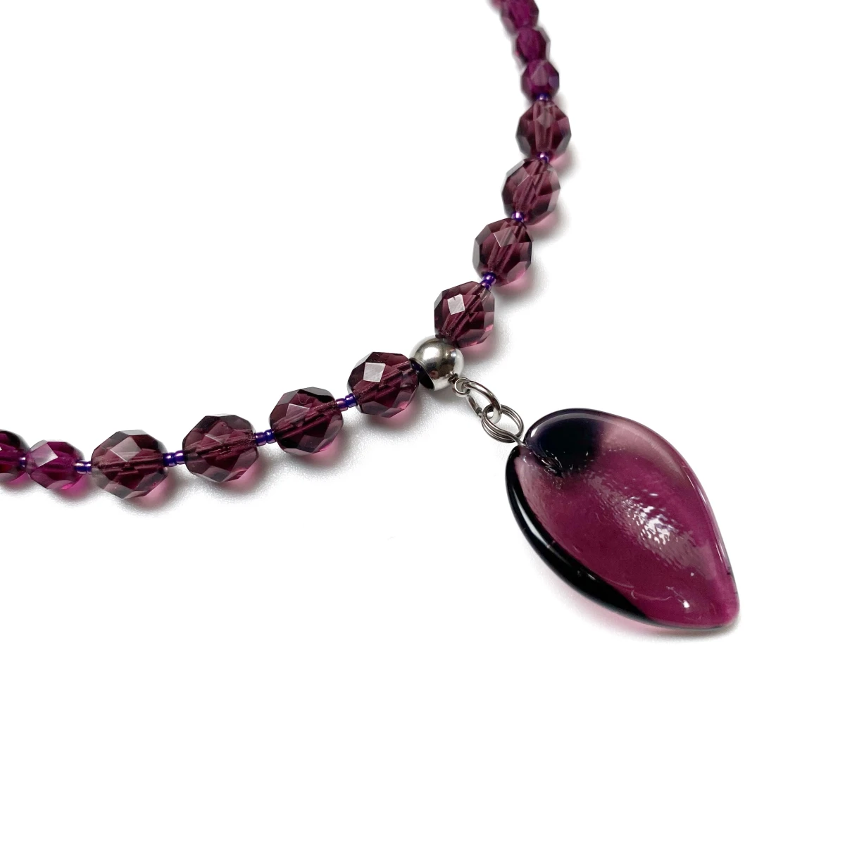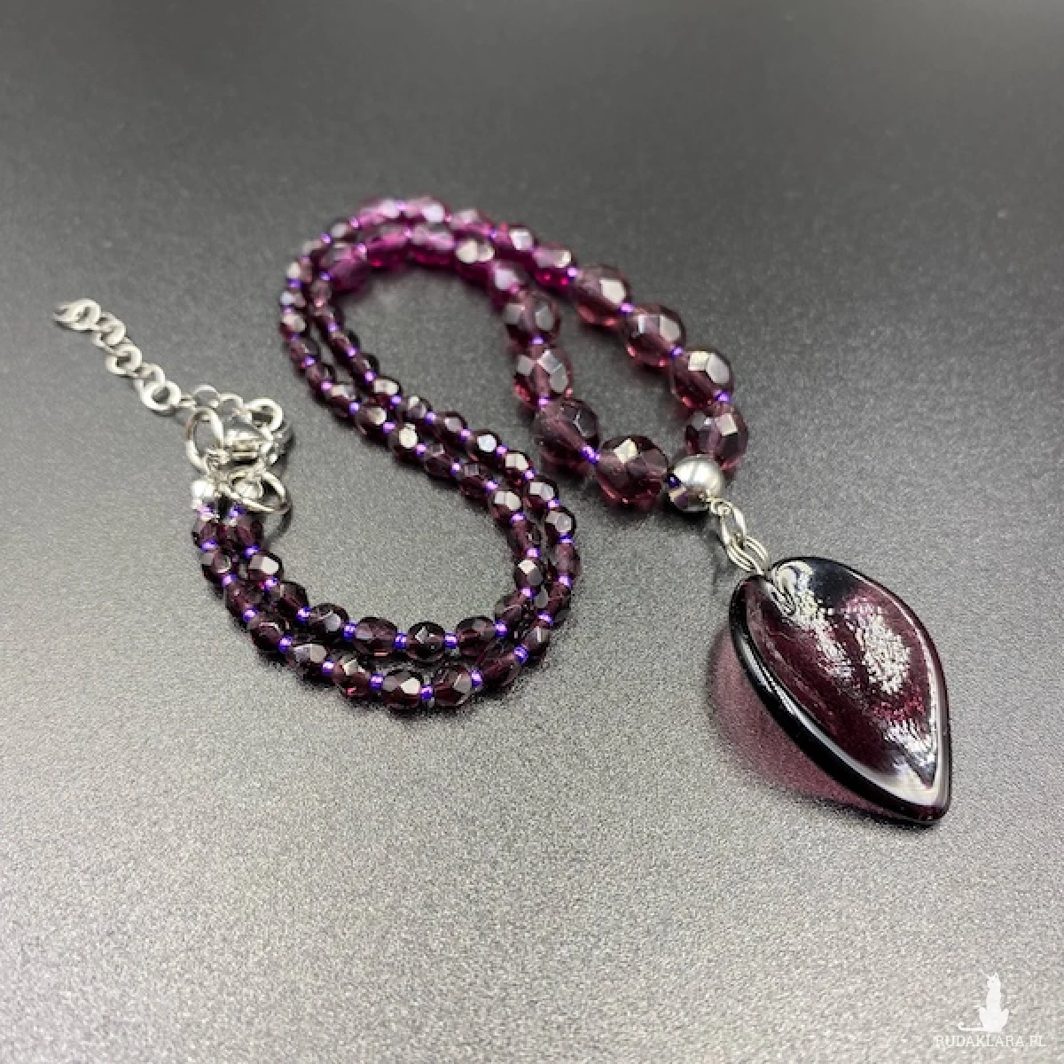 Krótki naszyjnik został wykonany ręcznie z czeskich, szklanych, szlifowanych koralików w kolorze fioletowym. Do naszyjnika doczepiony jest fioletowy, szklany liść (3 cm).
